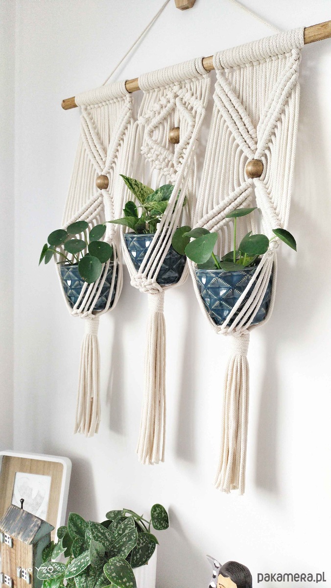 Kwietnik makrama potrójny, na ścianę, wiszący.