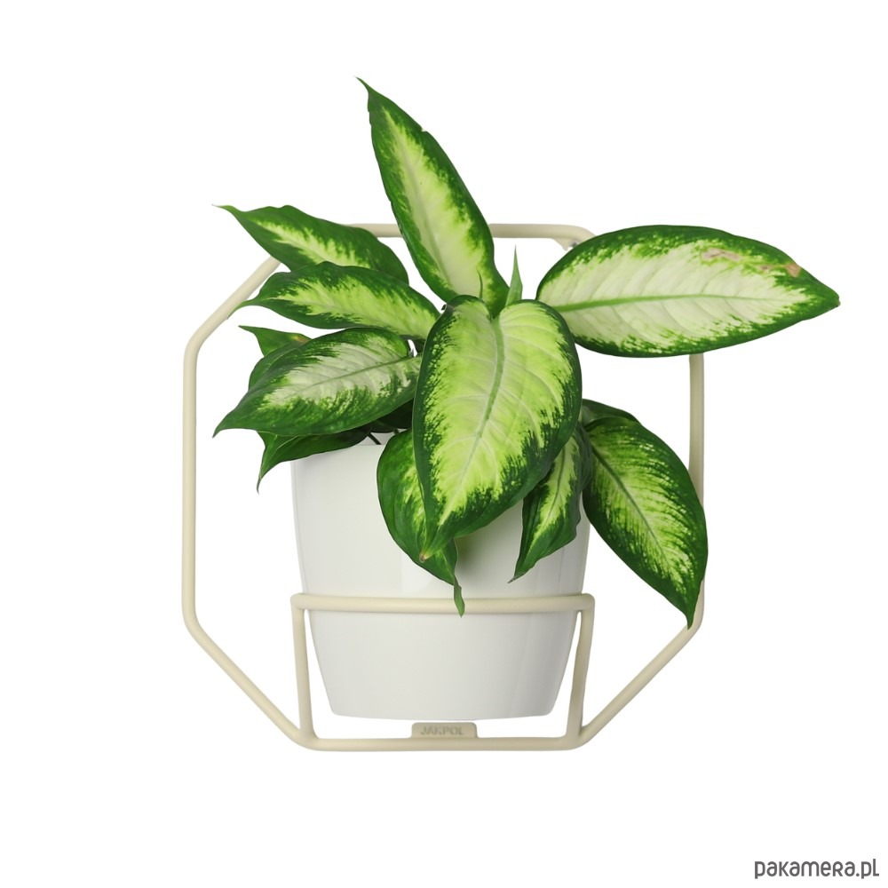 Kwietnik został wykonany z lakierowanego proszkowo metalu w kolorze beżowym.