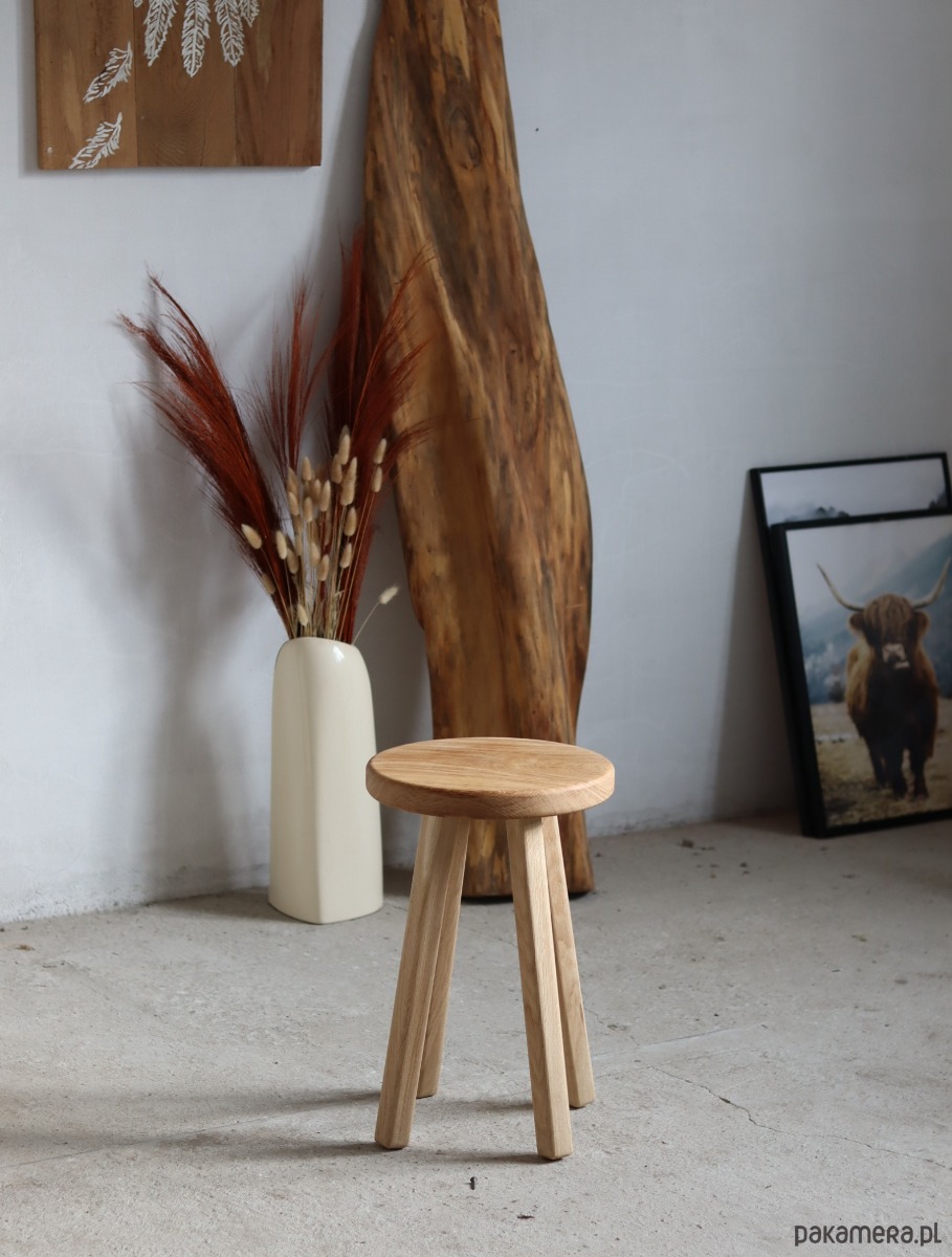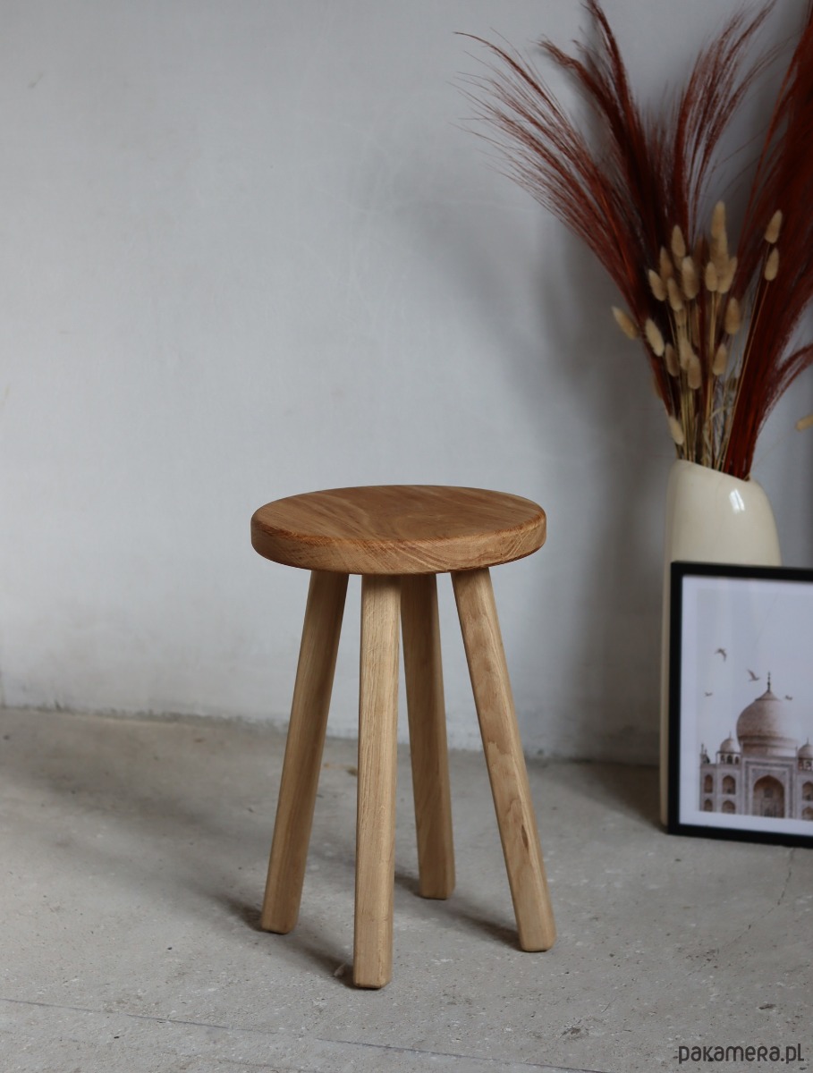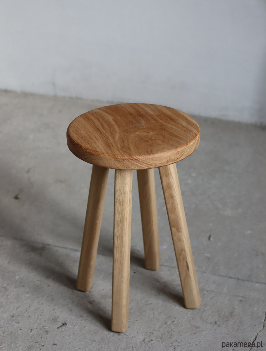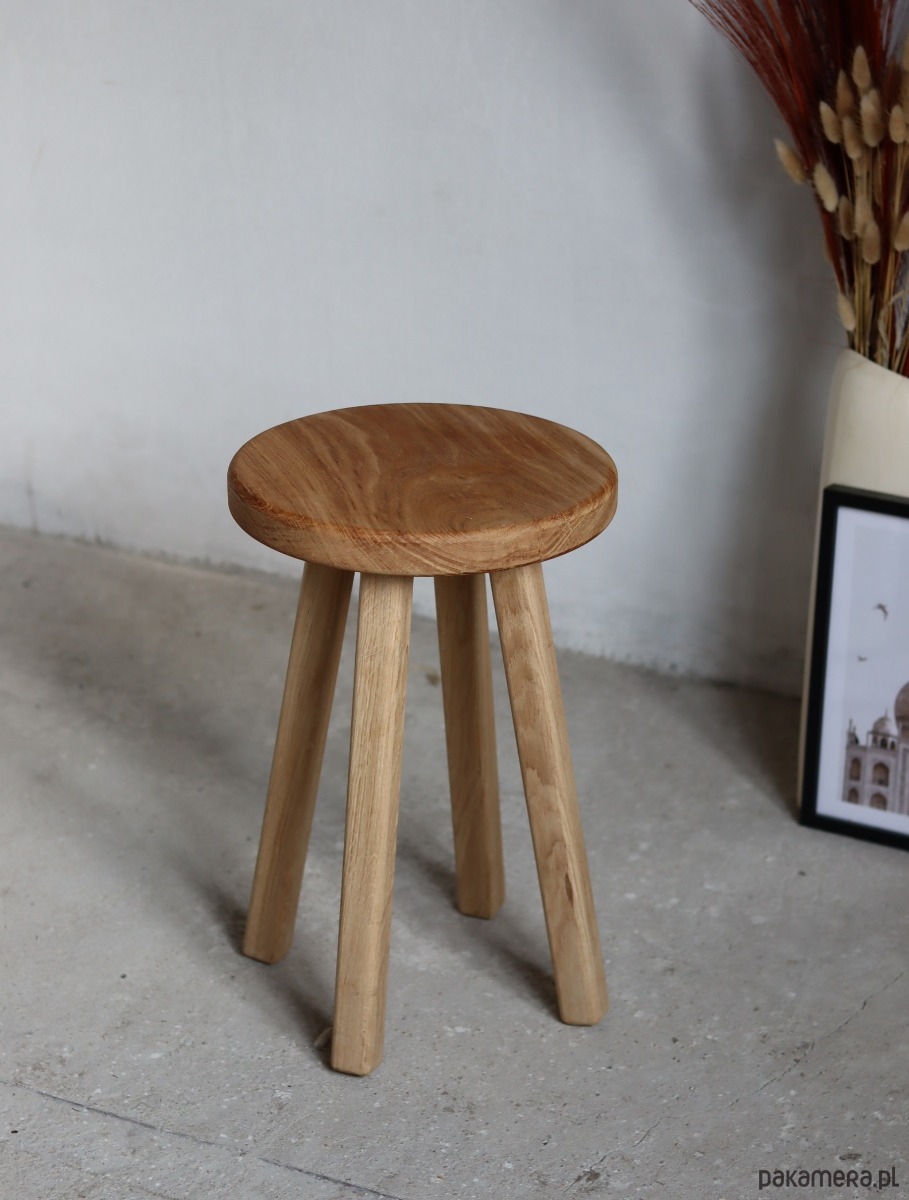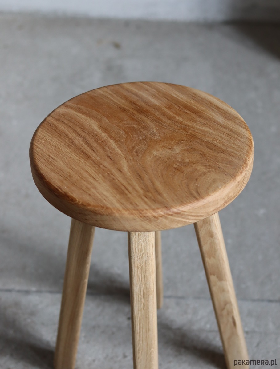 Drewniany , dębowy , o pięknych słojach i co ważniejsze odporny na wodę :) Cudnie okrągły .
