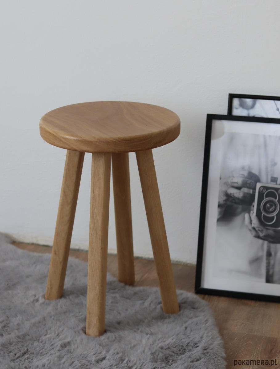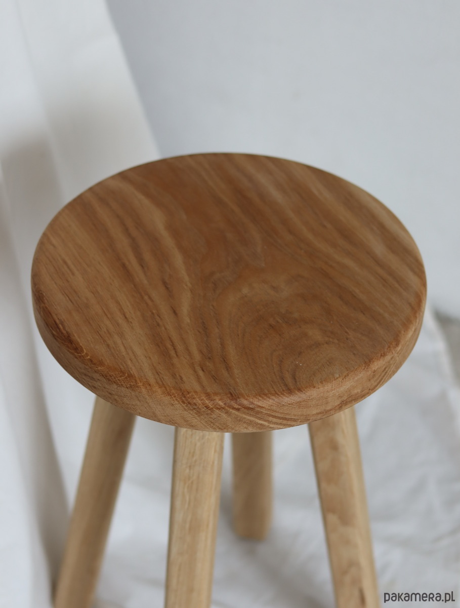 Drewniany , dębowy , o pięknych słojach i co ważniejsze odporny na wodę :) Cudnie okrągły .