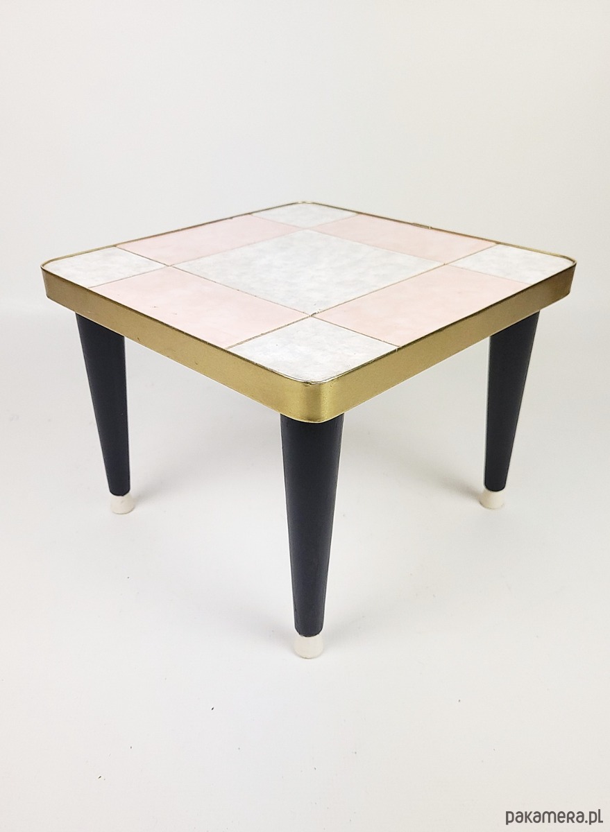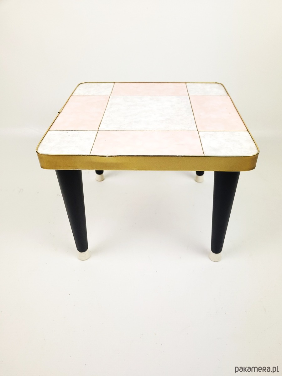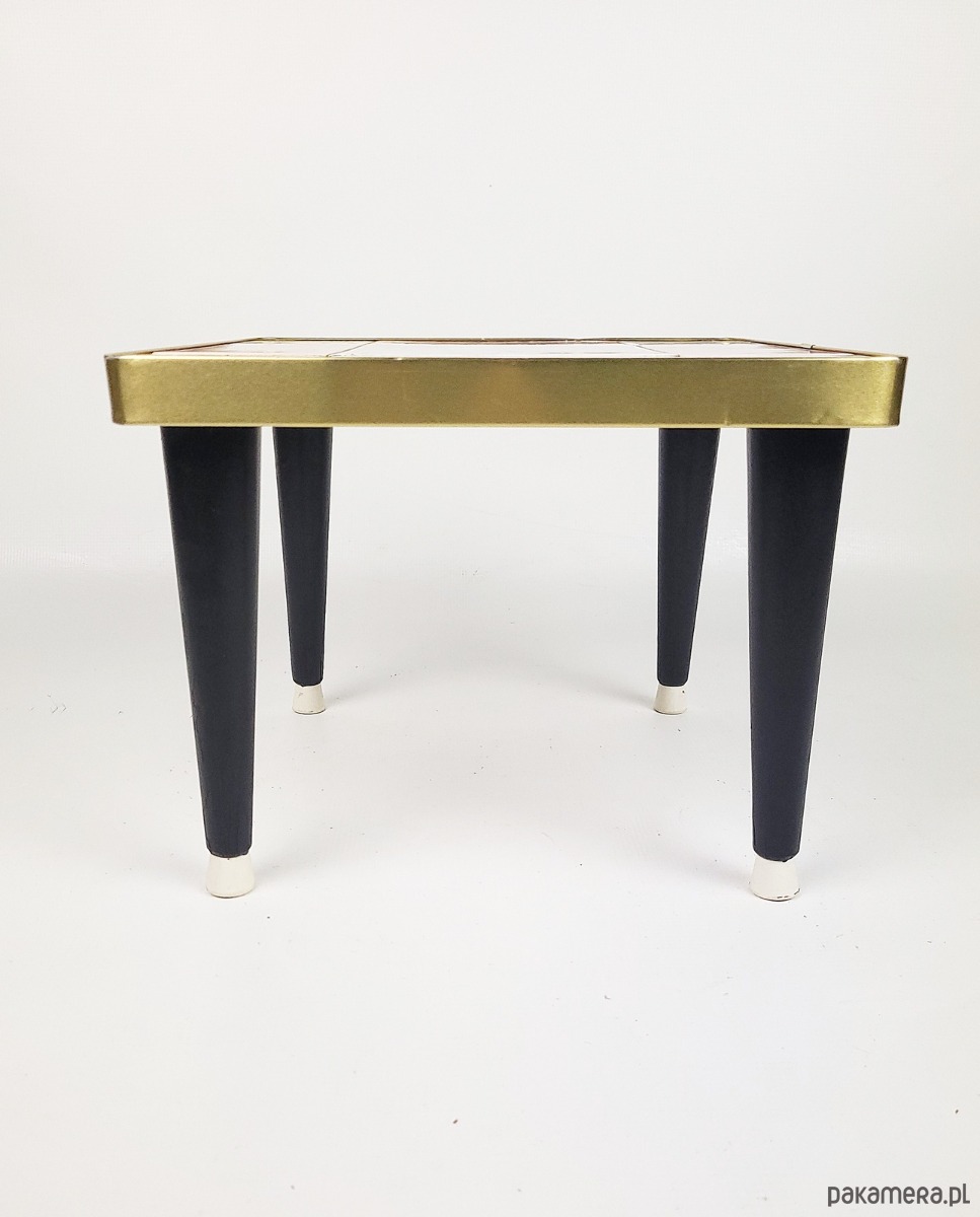 Kwietnik w stylu Rockabilly z lat 60,z blatem wykonanym z płytek, wykończony metalową opaską w kolorze złota. Stan zachowania dobry, widoczne niewielkie pekniecie w płytce oraz przetracia i wgniecenie w złotej opasce.