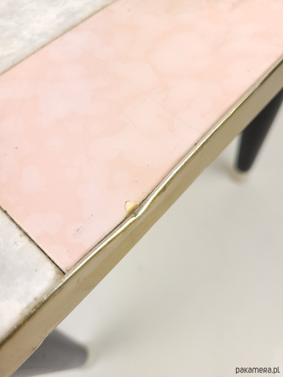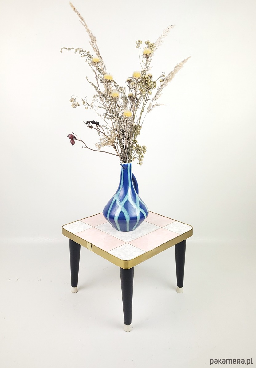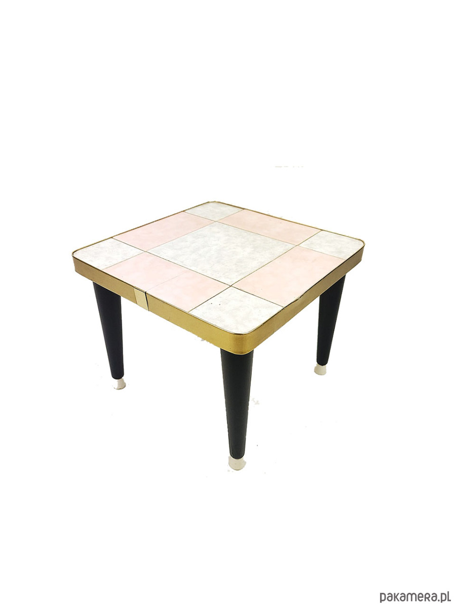 Kwietnik w stylu Rockabilly z lat 60,z blatem wykonanym z płytek, wykończony metalową opaską w kolorze złota. Stan zachowania dobry, widoczne niewielkie pekniecie w płytce oraz przetracia i wgniecenie w złotej opasce.