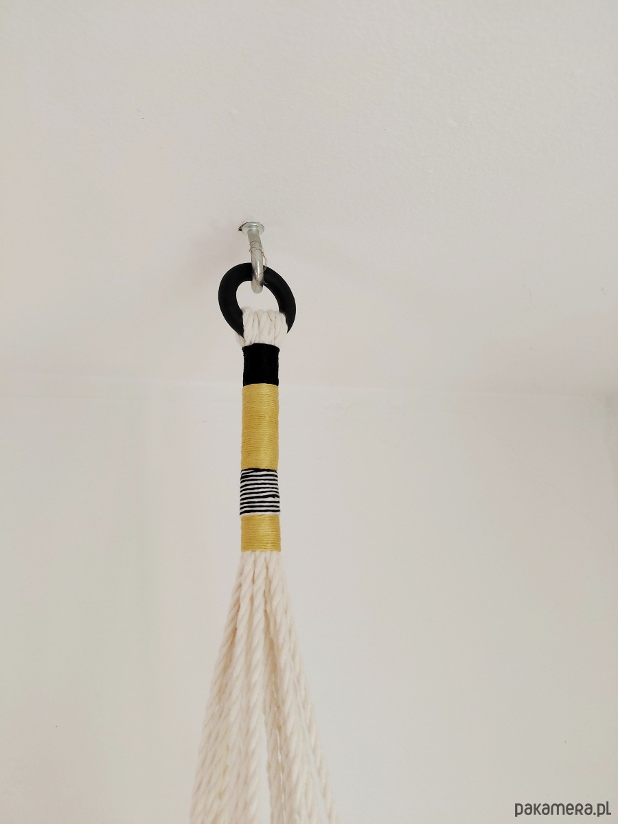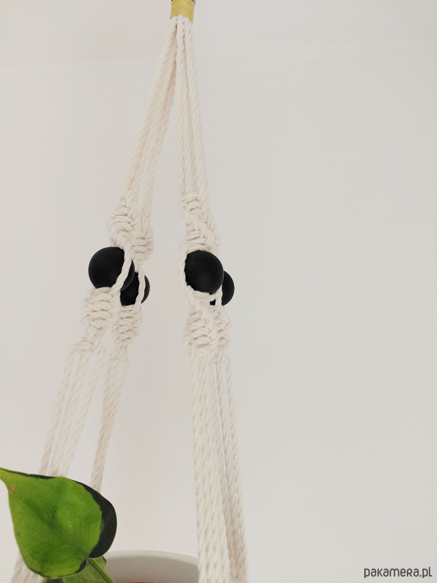 Kwietnik z makramy z malowanymi elementami drewnianymi.