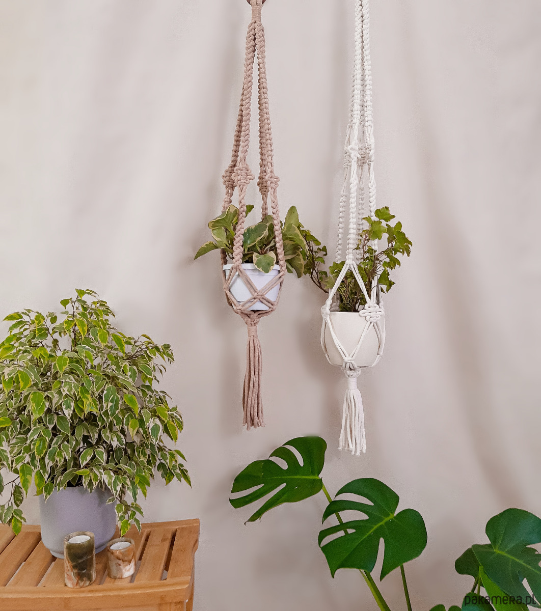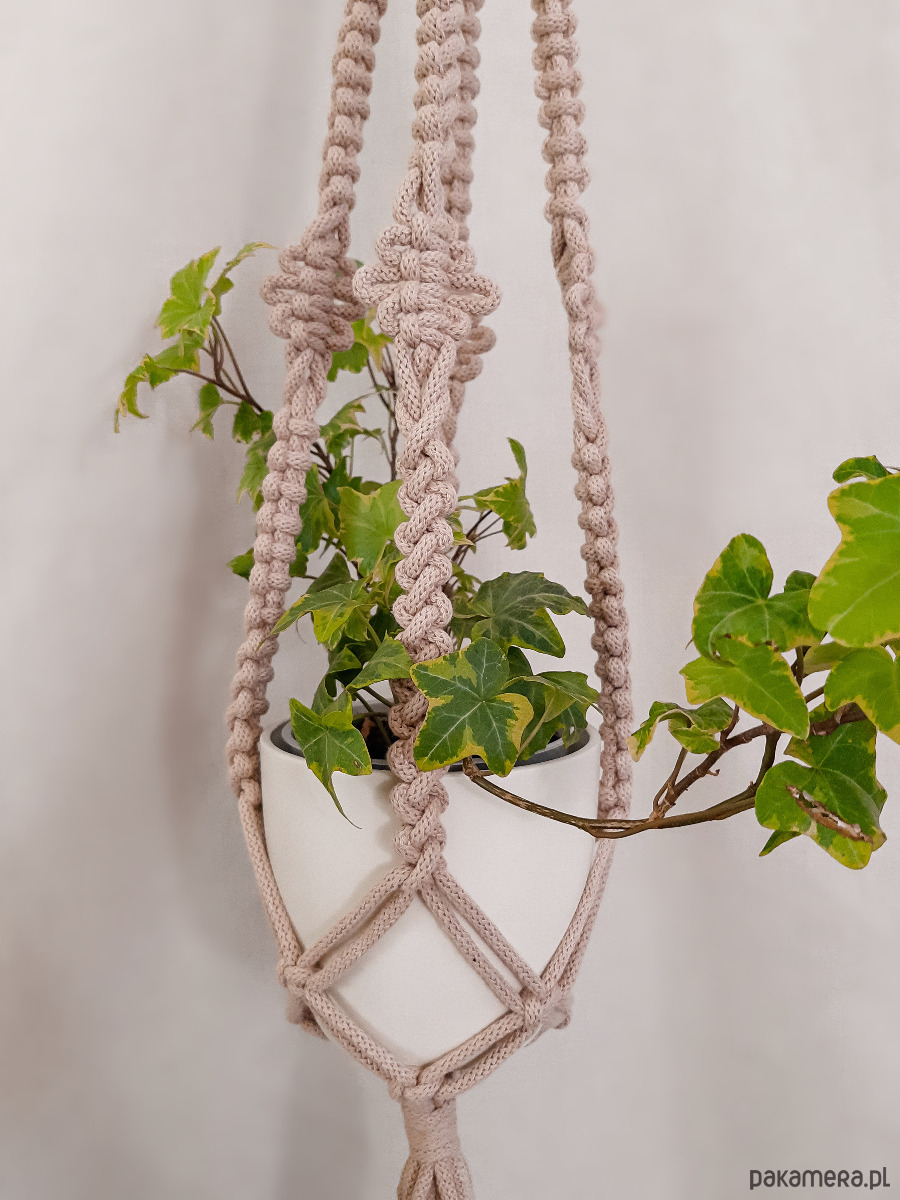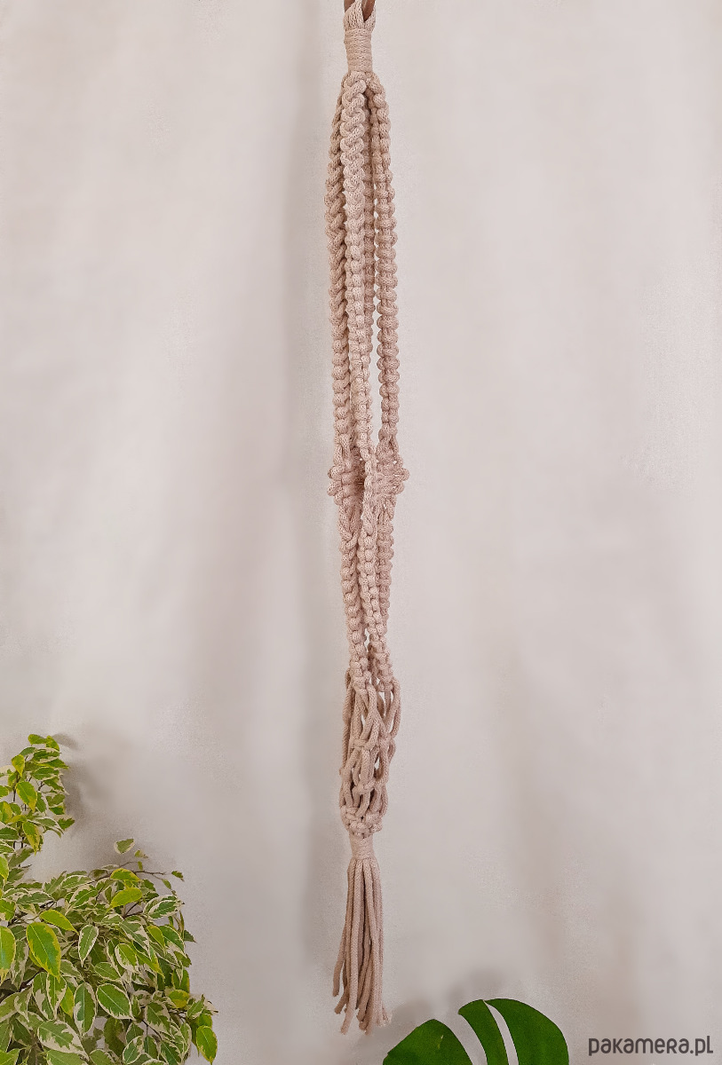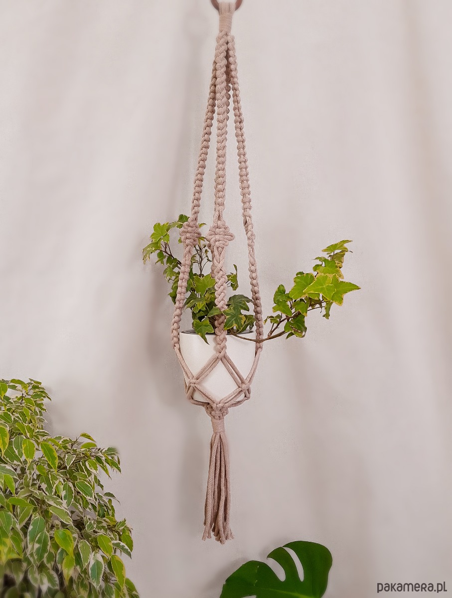 Wiszący kwietnik pleciony, metodą makramy to świetny dodatek dla osób kochających otaczać się zielenią. Ten praktyczny dodatek pozwoli zwolnić Ci zatłoczony parapet a także nada wyjątkowego klimatu Twojemu wnętrzu. Sprawdzi się również na Twoim tarasie bądź w oranżerii. Świetnie wpisuje się w styl skandynawski oraz boho. Jeśli jesteś szczęśliwym właścicielem domowej dżungli - to idealne rozwiązanie dla Ciebie. Kwietnik świetnie komponuje się z meblami z drewna bądź drewnianymi osłonkami na doniczki.