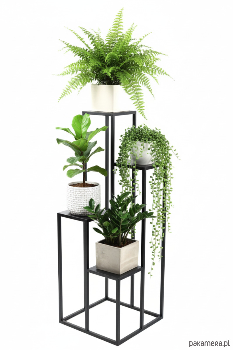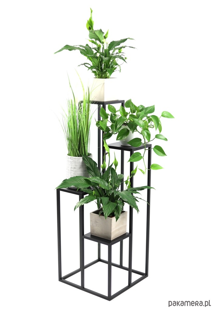 Metalowy kwietnik o nowoczesnym designie z czterema podstawkami. Minimalistyczna, prosta konstrukcja sprawia, że kwietnik świetnie wkomponuje się w nowoczesne wnętrza urządzone w stylu industrialnym i loftowym. Niezwykle praktyczny, a zarazem efektowny element wystroju wnętrz.