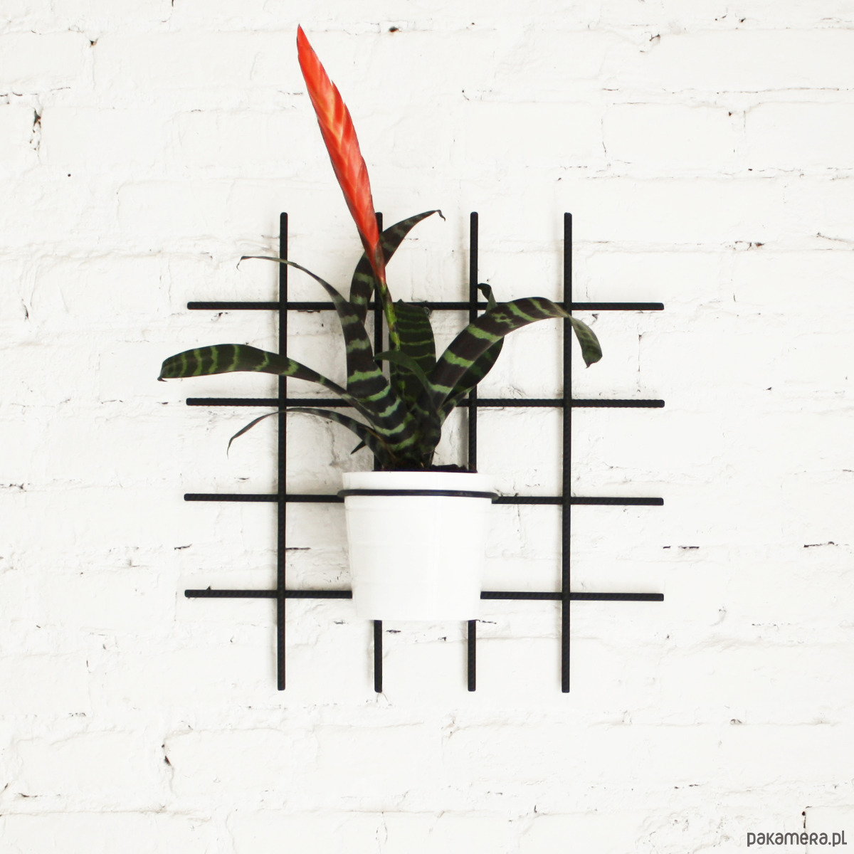Surowa forma, kwietnik do zawieszenia na ścianie (wewnątrz lub na zewnątrz). Kwietnik utrzyma sporą osłonkę z rośliną – nawet do piętnastu kilogramów. Surowy w formie kwietnik ścienny nadaje się idealnie do dużych loftowych przestrzeni – pasuje do betonu, cegły, jasnych ścian. Żebrowane pręty nadają mu bardzo silnego charakteru.