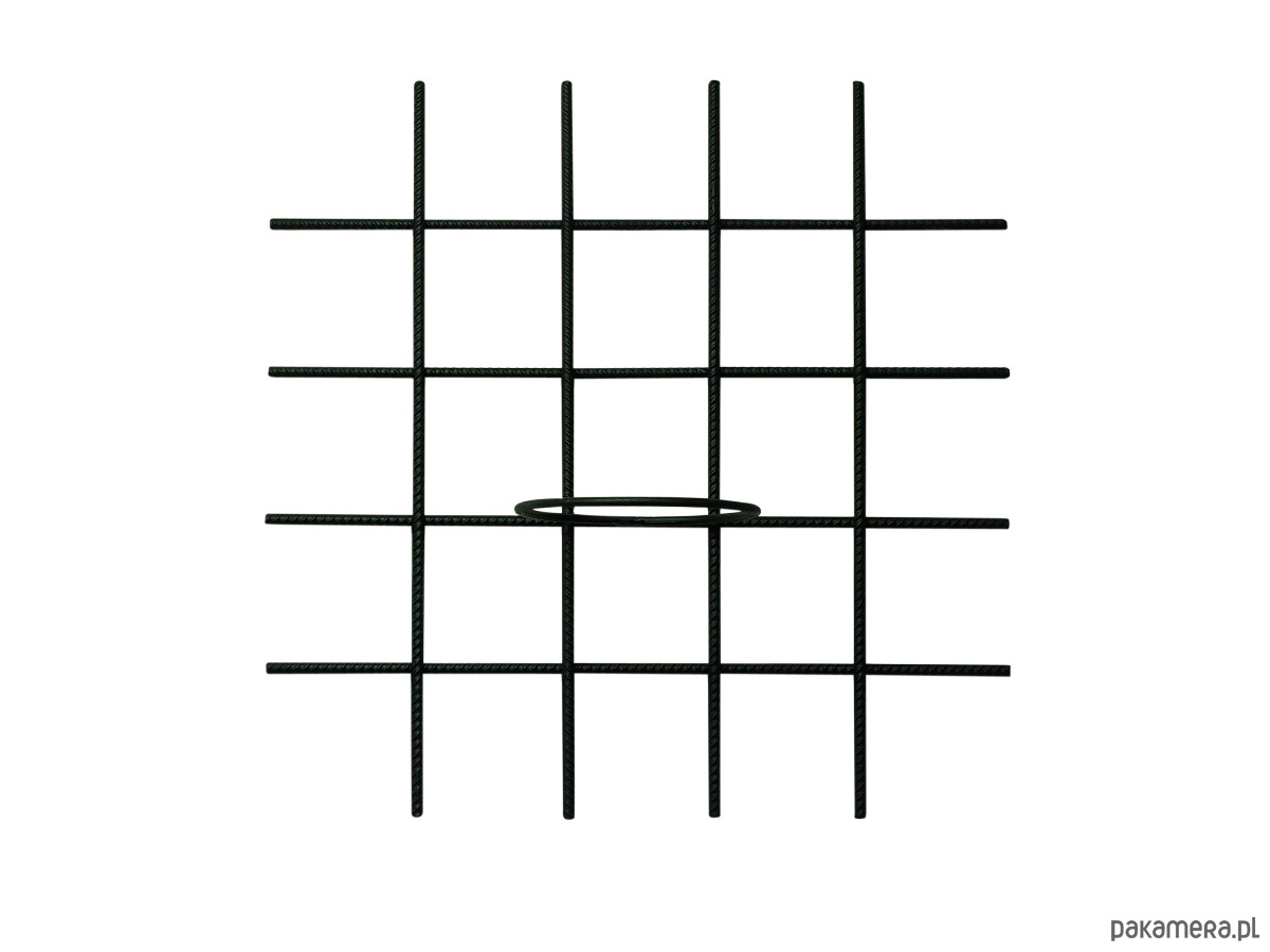 Pręt żebrowany 0,8 cm. Średnica obręczy 14 cm. Szczotkowany, szlifowany, spawany, lakierowany proszkowo. Kolor czarny-mat.