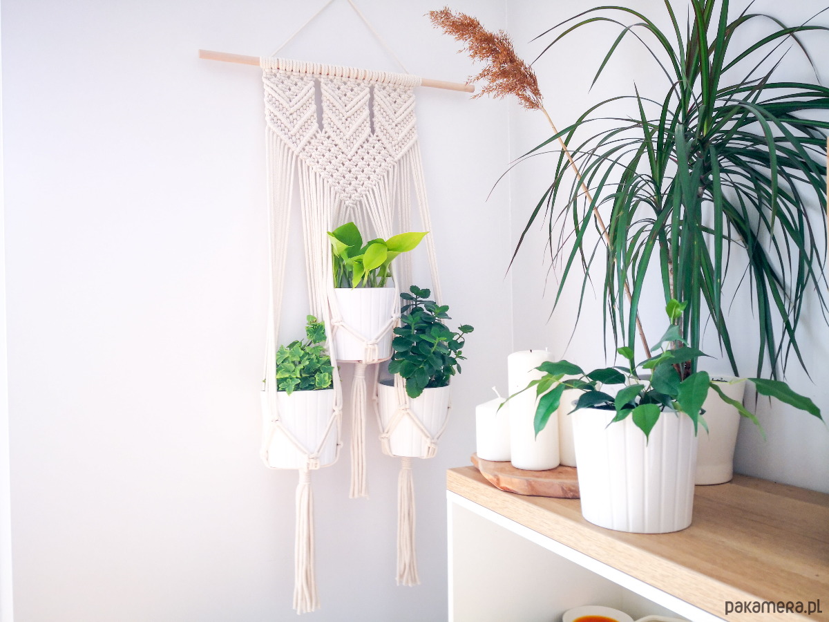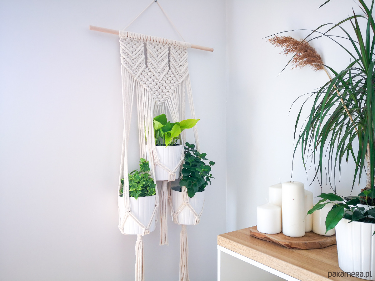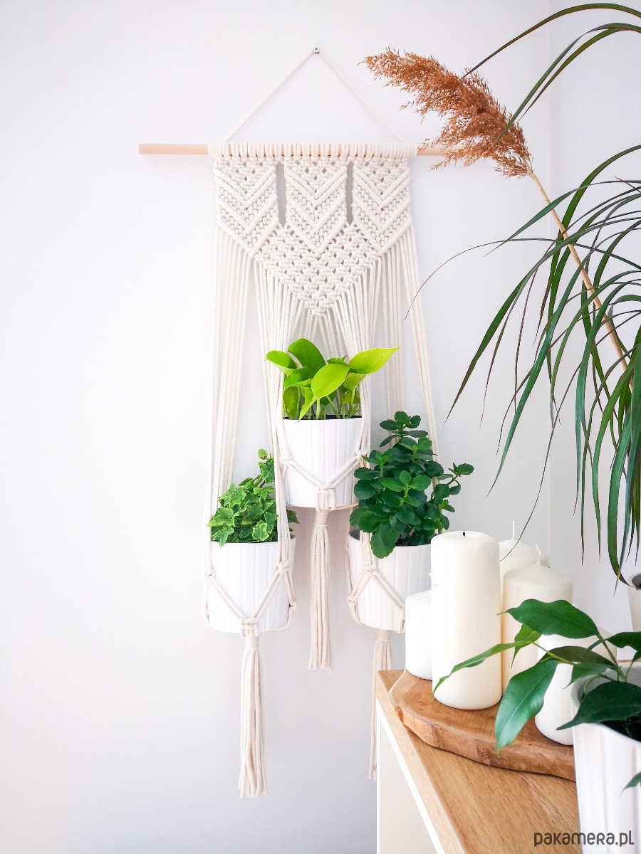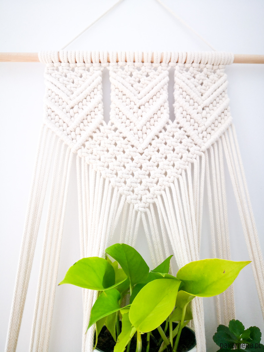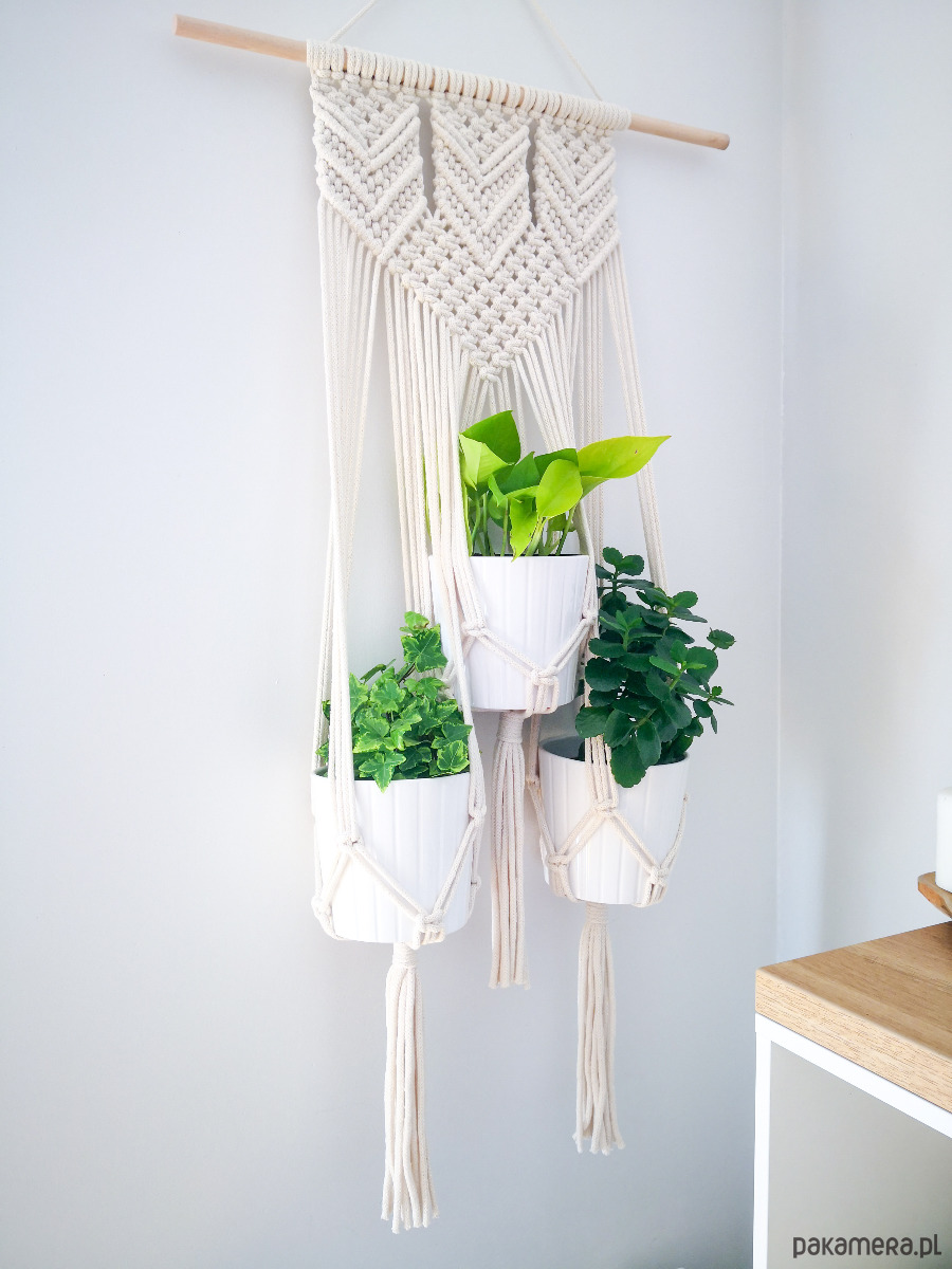 Kwietnik wiszący Arrow na trzy doniczki wyplatany własnoręcznie z bawełnianego sznurka (5 mm), metodą makramy. Piękny geometryczny wzór.