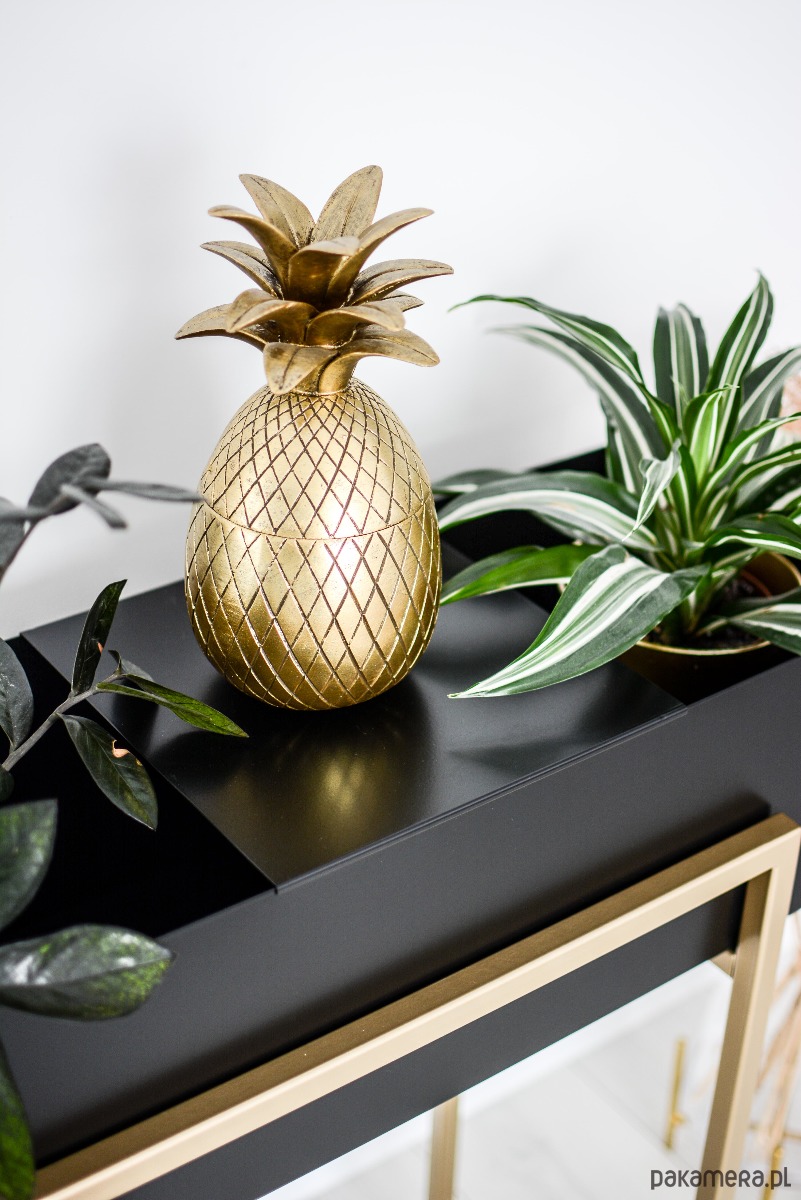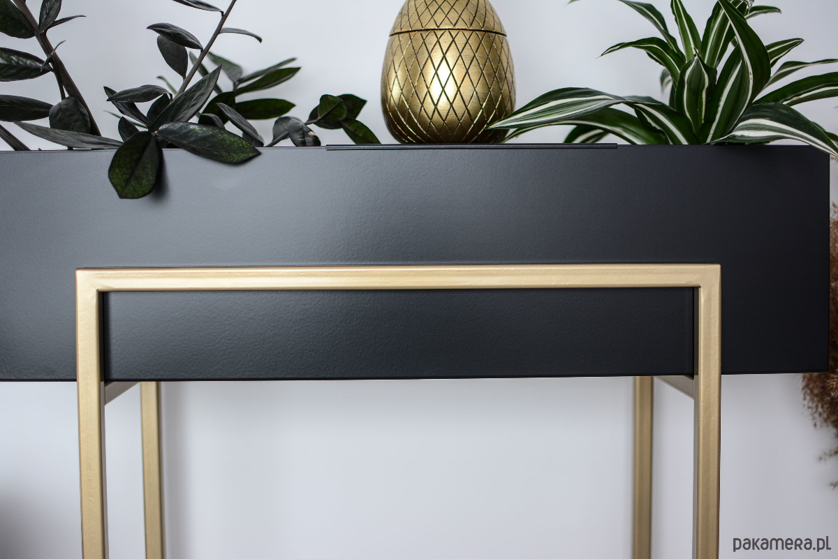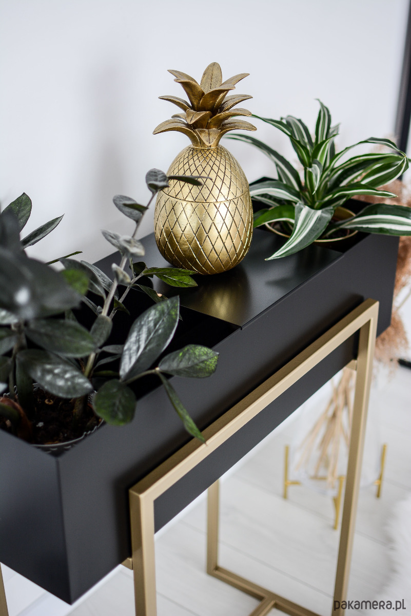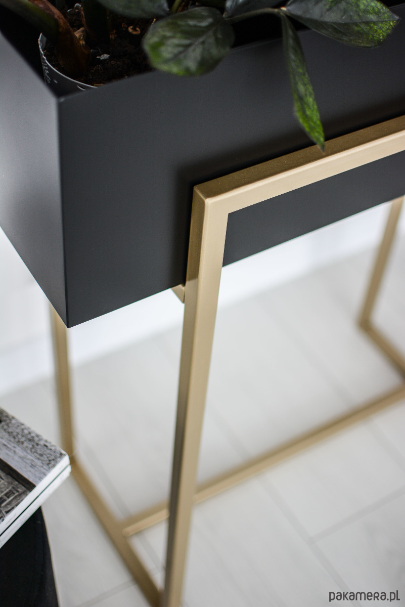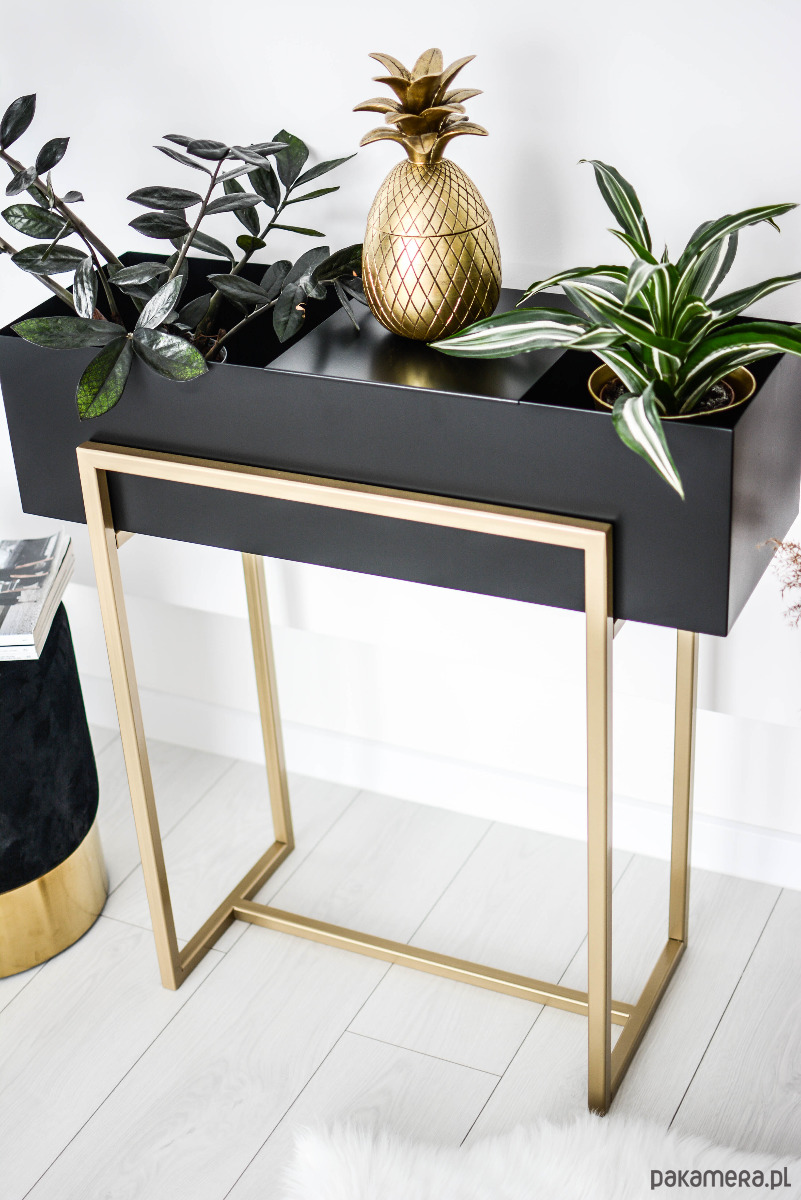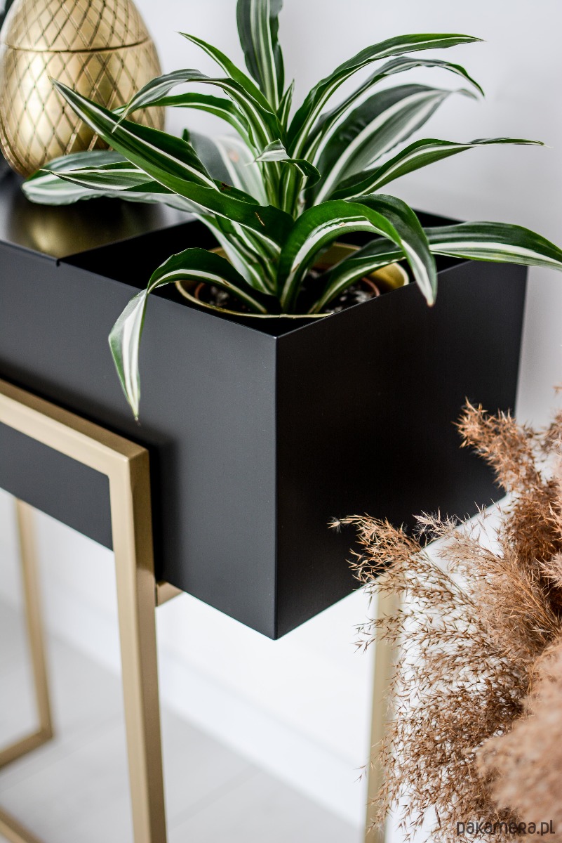 Ekskluzywna metalowa konsola/donica - stojak na kwiaty w kolorze czarno-złotym. Doskonała do przechowywania przedmiotów dekoracyjnych oraz ekspozycji kwiatów.