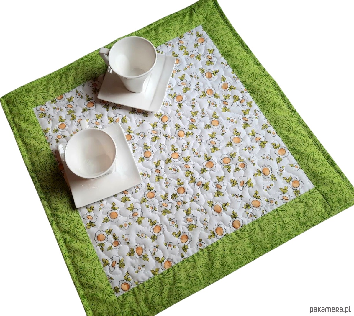 Mata -obrusik uszyta z najlepszej jakości amerykańskiej bawełny drukowanej w piękne malowane wiosenne kwiaty na białym tle w połączeniu z zieloną ramką i lamówką z tej samej tkaniny .
