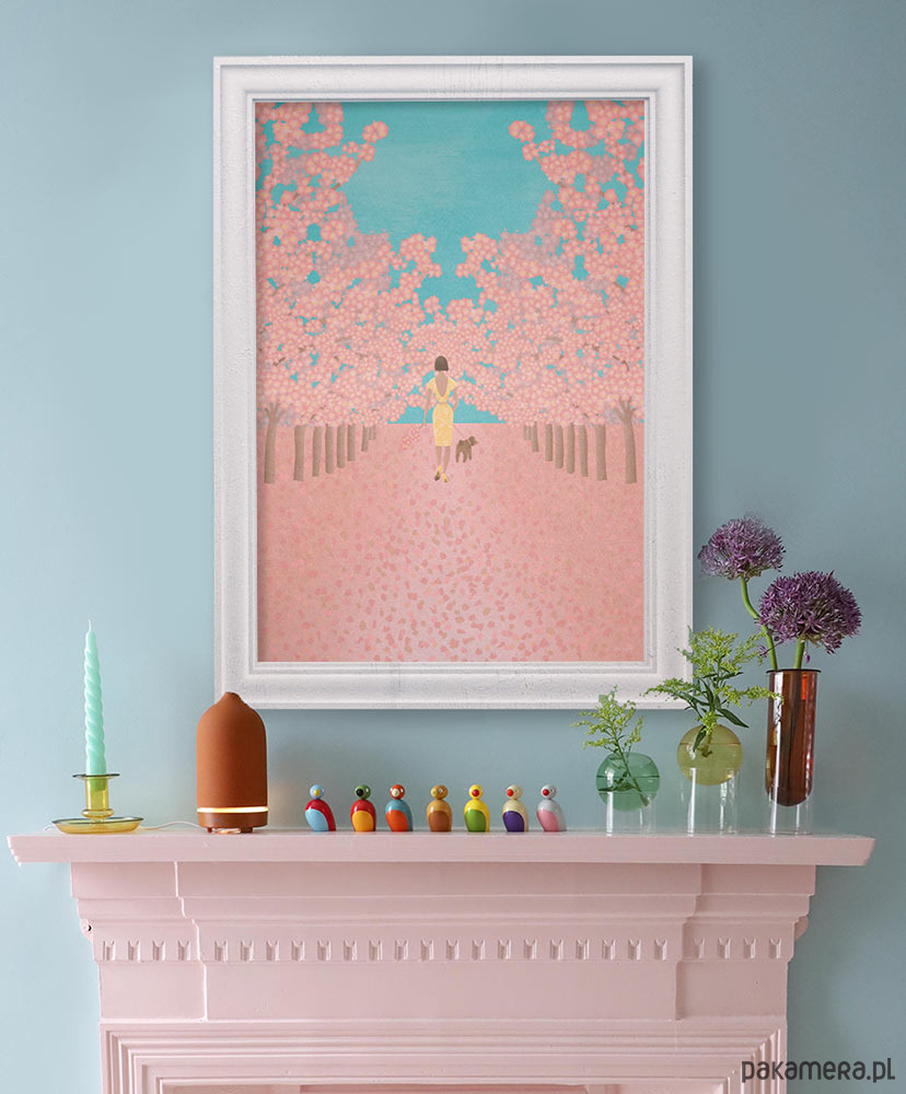 Grafika przedstawia dziewczynę w żółtej sukience spacerującą obsypanymi kwiatami alejkami parku. Różowe korony wiśni odcinają się na tle niebieskiego nieba. Zawieszony na ścianie plakat z kwitnącymi wiśniami wprowadzi do domu wiosenną, radosną atmosferę.