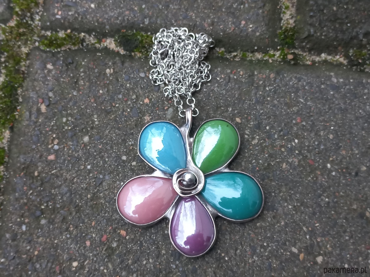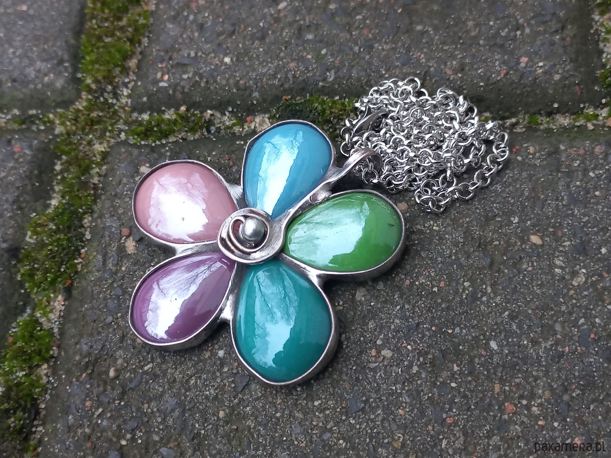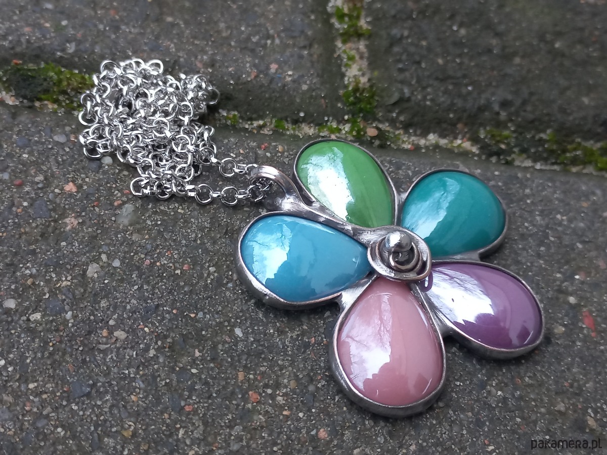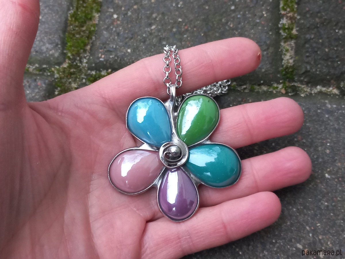 Wisiorek wykonany z miedzi, cyny i ceramiki. Wymiary ok. 5 na 5 cm. Zawieszony na łańcuszku o długości ok. 50 cm.