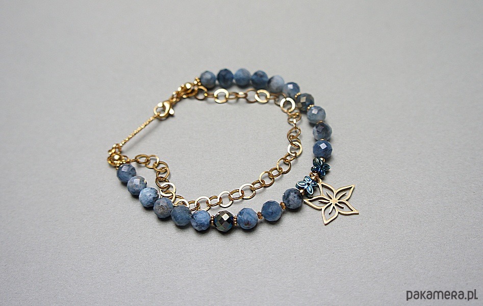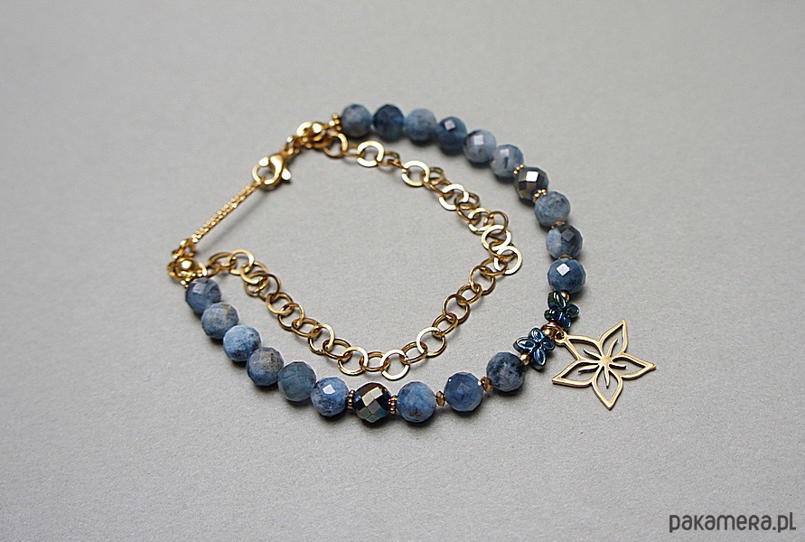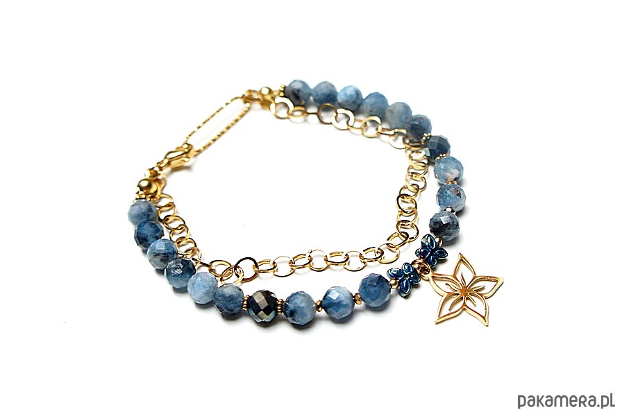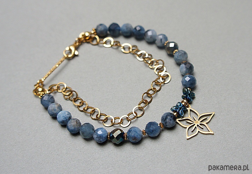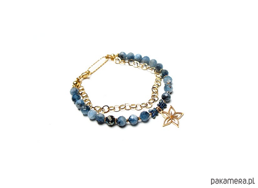 Delikatna bransoletka wykonana w całości ze stali szlachetnej pozłacanej, szlachetnych kamieni - kyanit fasetowany [6mm], hematyt fasetowany [6mm], przekładek z hematytu [6mm - motyle oraz 1mm]. Całkowita długość bransoletki 19,7cm. Biżuteria ozdobnie zapakowana.