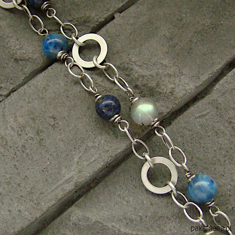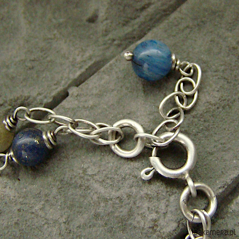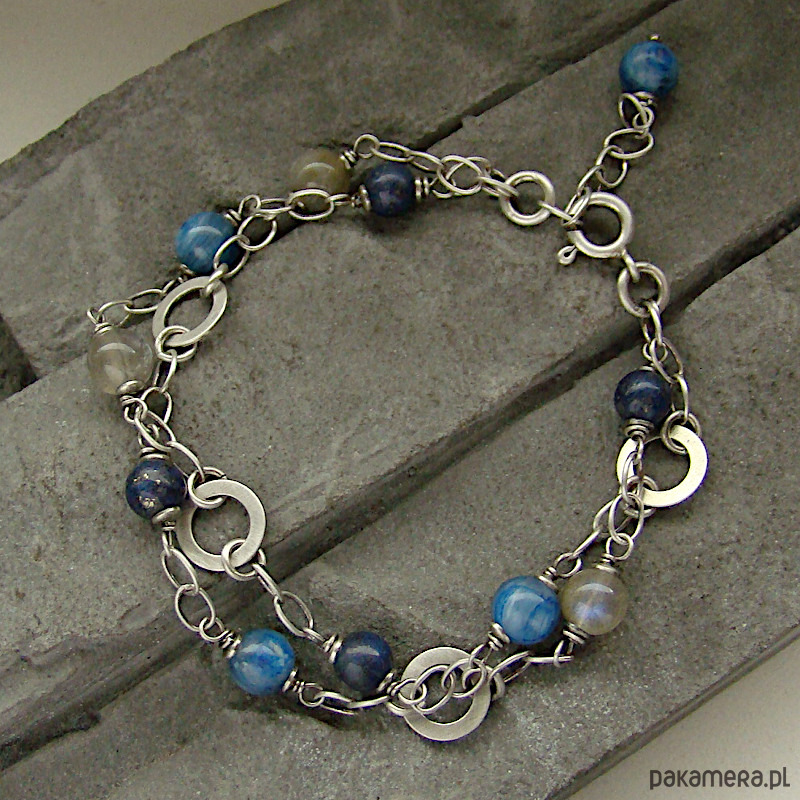 Subtelna i kobieca bransoletka na co dzień. Wykonana w całości z oksydowanego srebra próby 925 oraz kulek kyanitu, lapisu lazuli i labradorytu wielkości 6-7 mm. Całkowita długość bransoletki regulowana od 18 cm do 20,5 cm. W mojej galerii kolczyki do kompletu a także naszyjnik. Ozdobnie zapakowana.
