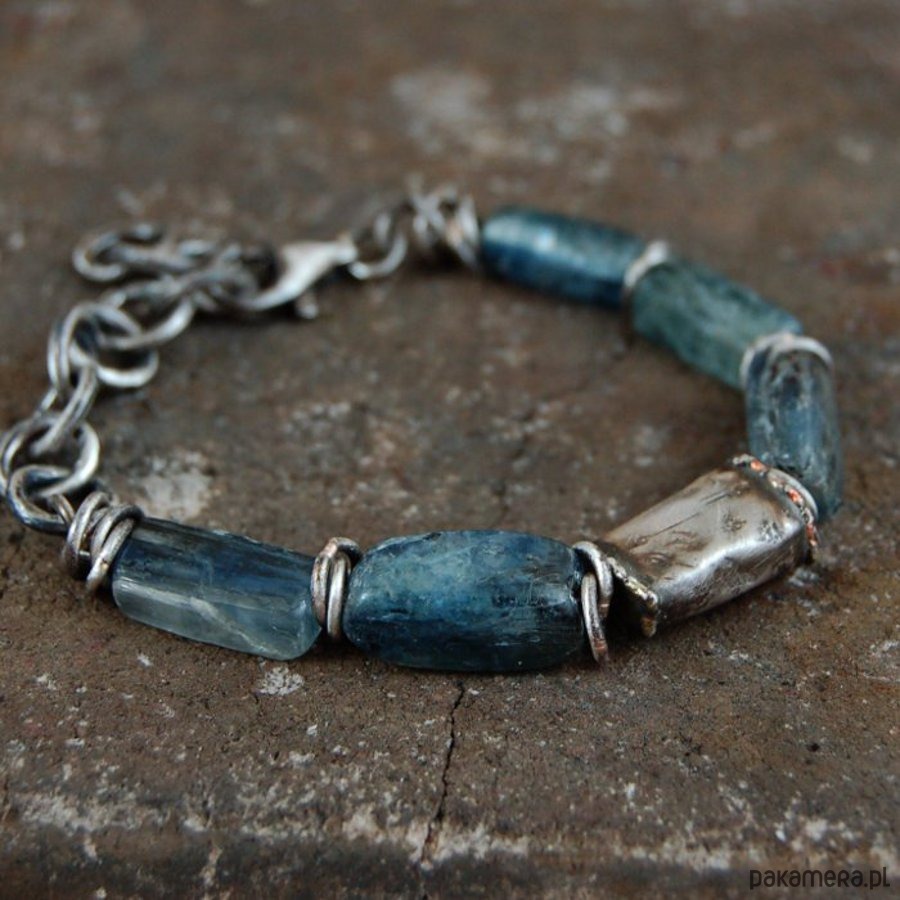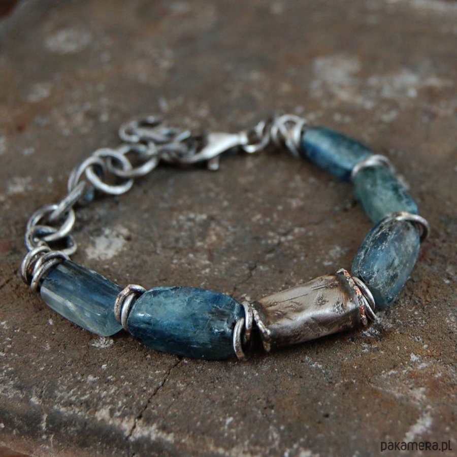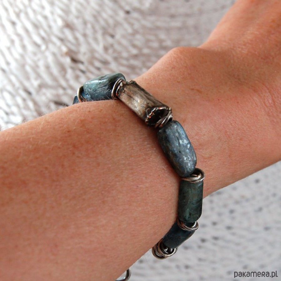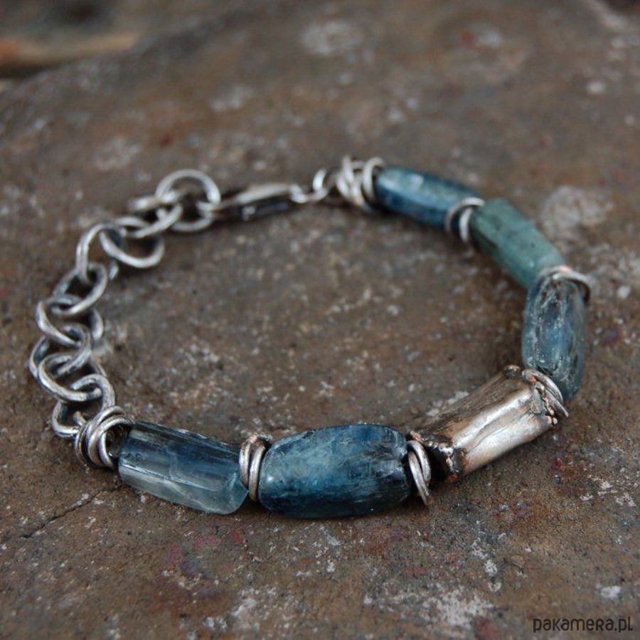 Bransoleta unisex ze srebra i kyanitów. Srebro oksydowane. Wielkość kamieni i srebrnej puszki około 0,7 - 1,8 cm. Proszę o podanie obwodu nadgarstka.