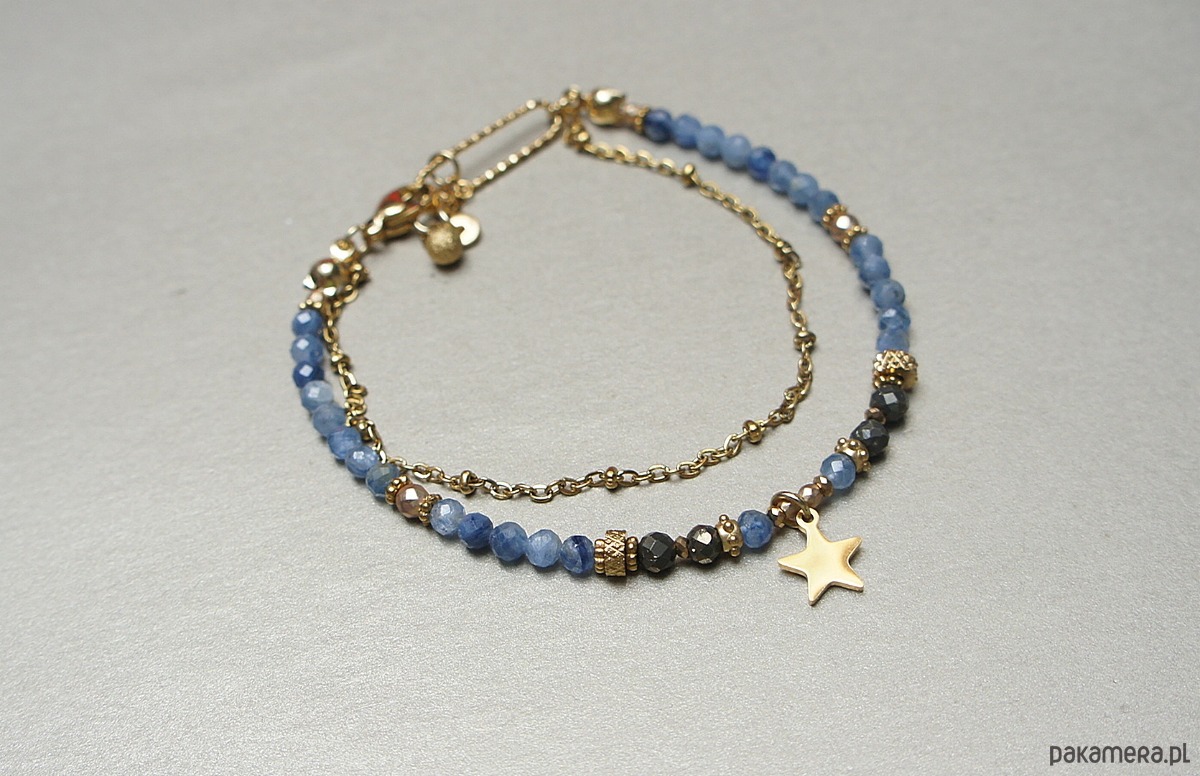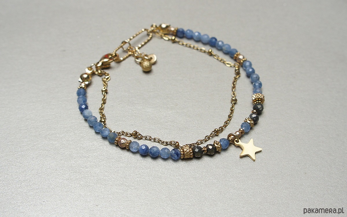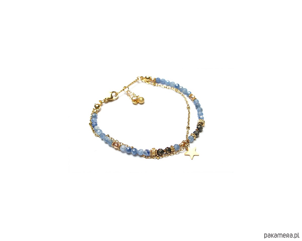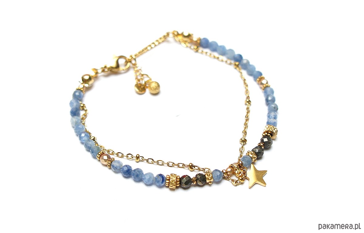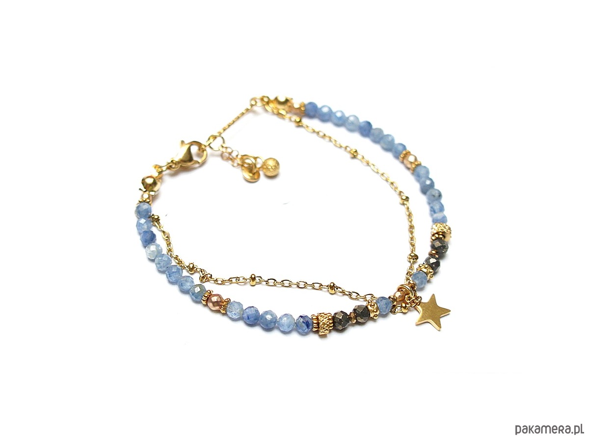 Delikatna bransoletka wykonana w całości ze stali szlachetnej pozłacanej, szlachetnych kamieni - kyanit fasetowany [3mm], piryt fasetowany [3mm], hematyt fasetowany, platerowany [3mm],przekładek z hematytu [1mm]. Całkowita długość bransoletki ok. 18,5cm. Biżuteria ozdobnie zapakowana.