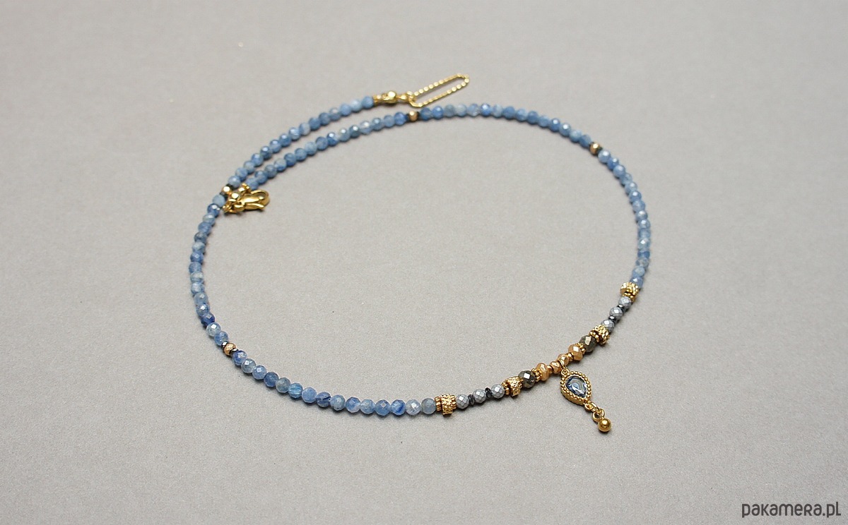 Krótki, delikatny naszyjnik wykonany w całości z pozłacanej stali szlachetnej oraz naturalnych, szlachetnych kamieni - fasetowany kyanit [3mm], piryt fasetowany [4mm], hematyt fasetowany, platerowany [2mm i 3mm], przekładek z hematytu [1mm] oraz łącznika z cyrkonią w okuciu. Naszyjnik o długości ok. 42,5cm.