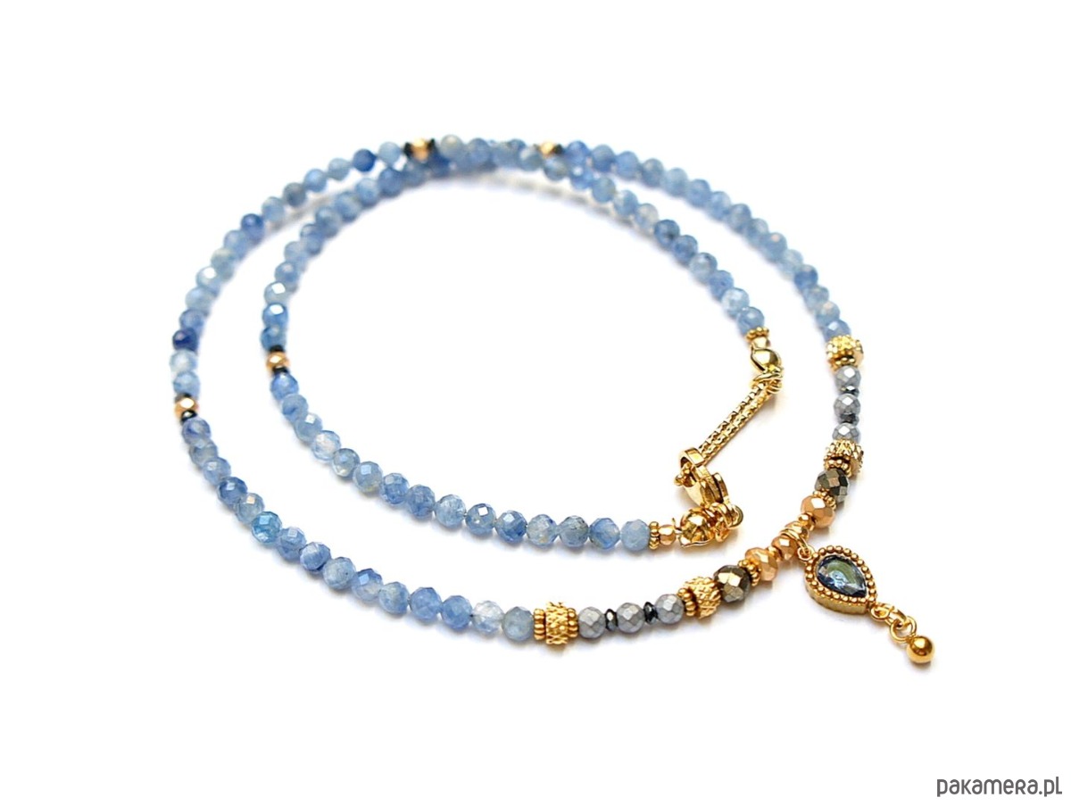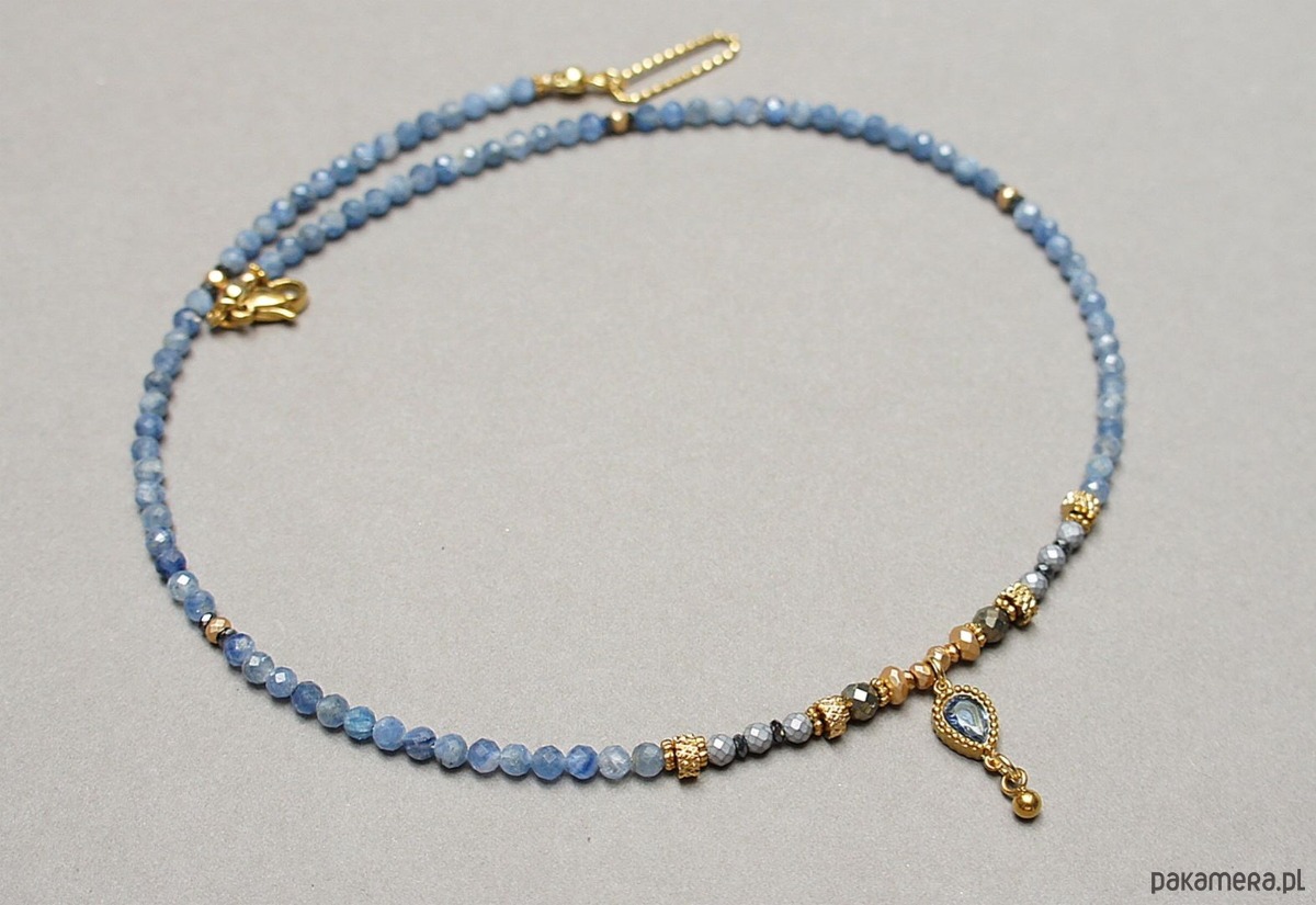 Krótki, delikatny naszyjnik wykonany w całości z pozłacanej stali szlachetnej oraz naturalnych, szlachetnych kamieni - fasetowany kyanit [3mm], piryt fasetowany [4mm], hematyt fasetowany, platerowany [2mm i 3mm], przekładek z hematytu [1mm] oraz łącznika z cyrkonią w okuciu. Naszyjnik o długości ok. 42,5cm.