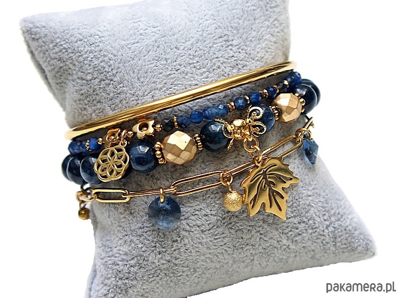 Zestaw czterech bransoletek wykonanych w całości z pozłacanej stali szlachetnej oraz naturalnych, szlachetnych kamieni - kyanity [8mm], kyanity fasetowane [3mm], hematytu fasetowanego [8mm], przekładek z hematytu [6mm], zawieszek z kryształkami Swarovski. Bransoletki pasują na nadgarstek 16 - 17cm Biżuteria ozdobnie zapakowana.