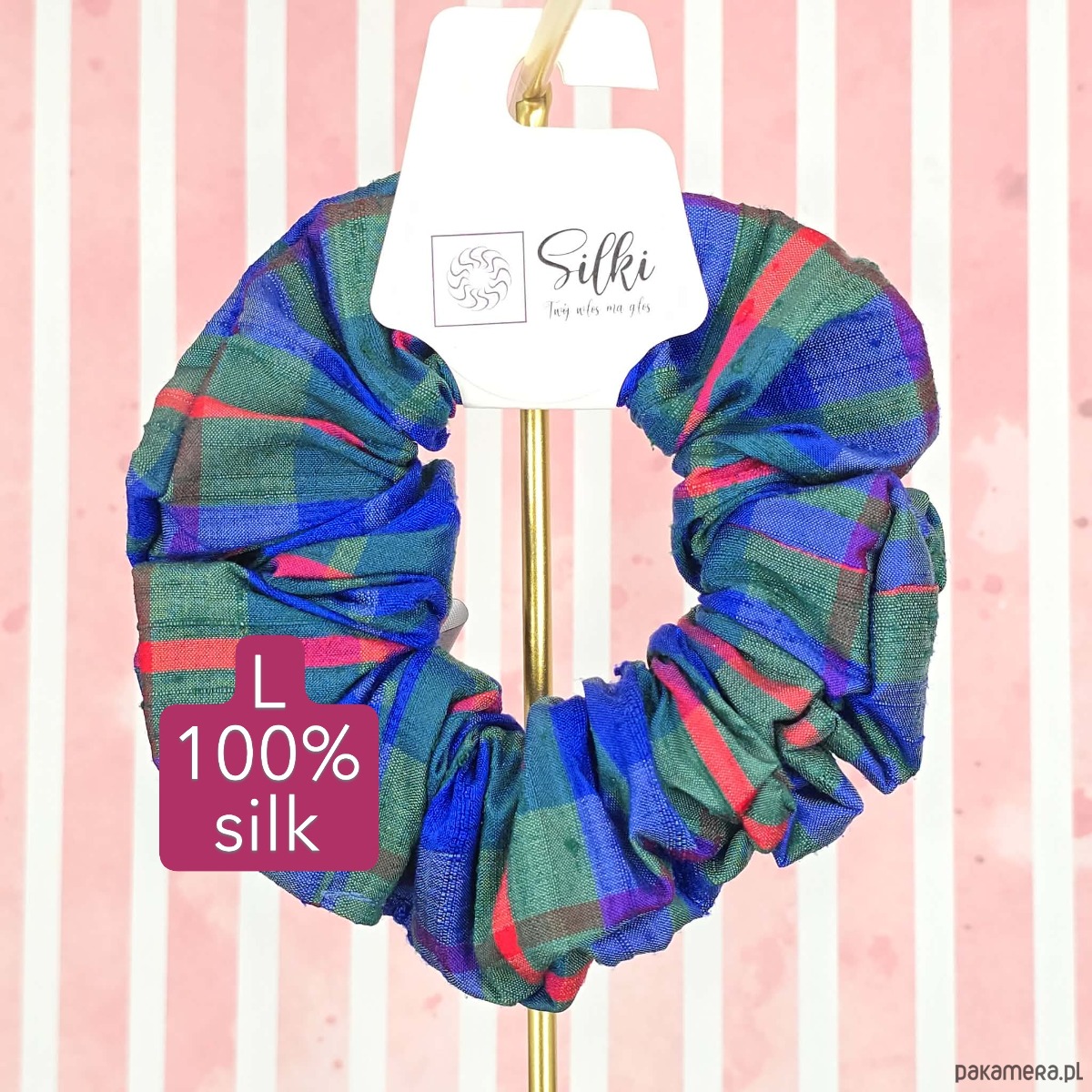 L średnia gumka do włosów jedwab naturalny scrunchie niebieska w kratkę