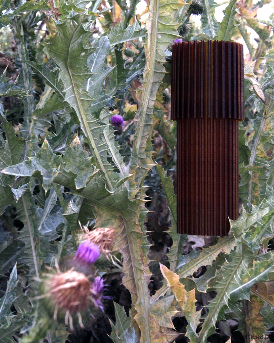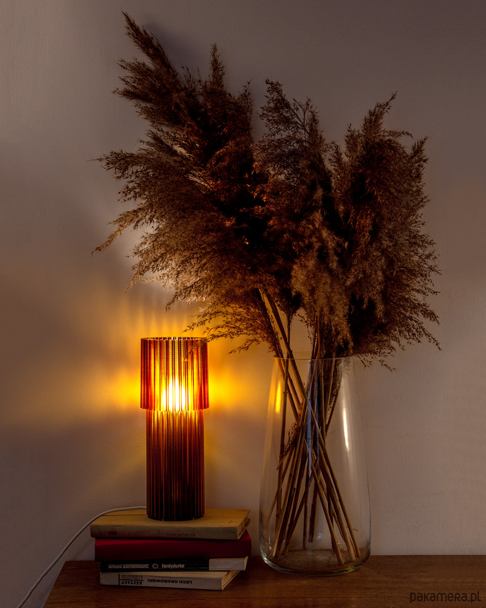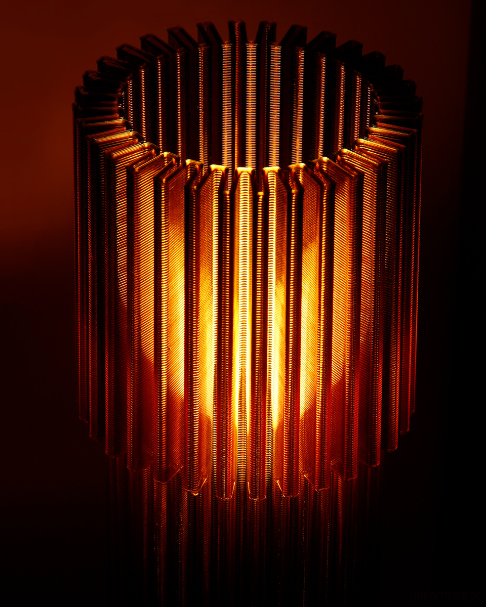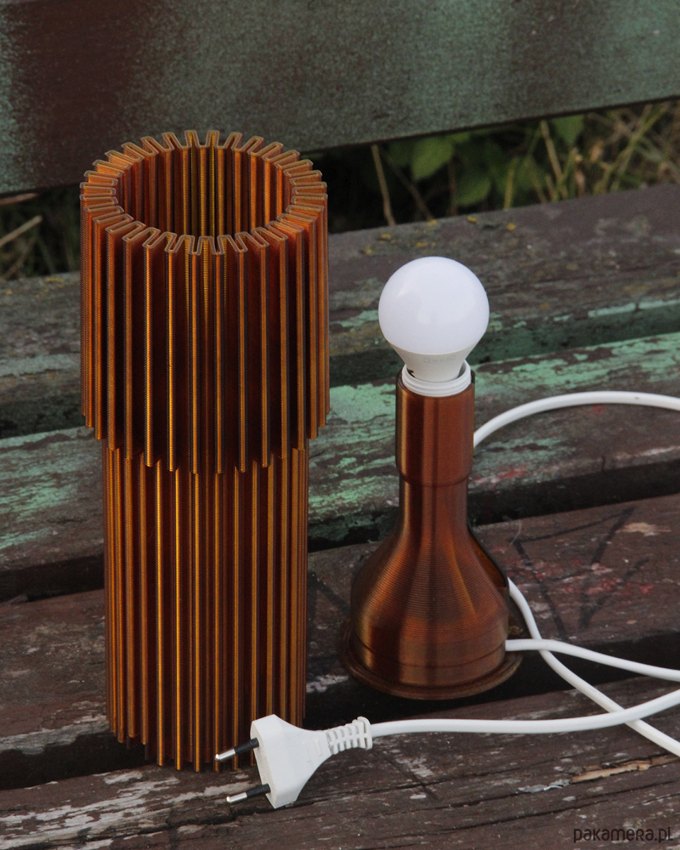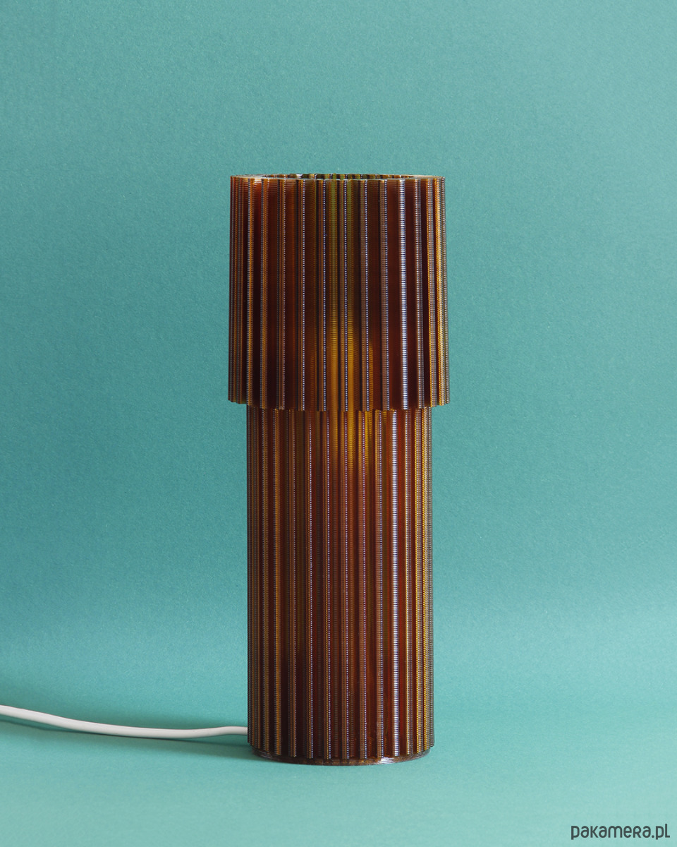 Jest to pierwsza lampa, jaką OBJ zaprojektowało. Stylistycznie czerpie mocno z motywów szkła retro. Chcieliśmy, żeby była dobrze zaprojektowana pod względem funkcjonalnym, ale i atrakcyjna wizualnie. Lampa wypełnia pomieszczenie ciepłym, klimatycznym światłem. Postawiona blisko ściany rzuca na nią podłużne cienie wynikające z żebrowania formy. Jej konstrukcja składa się z dwóch elementów. Klosza i wkładu ze źródłem światła w postaci żarówki E14. Oba elementy powstają w procesie druku 3d z tworzywa PET-G. Klosz drukujemy 8h10m a wkład 1h6m, używając dyszy o średnicy 1.2 mm (czyli bardzo dużej). Dzięki temu warstwy są wyeksponowane i dodają uroku wydrukowi. Wkład posiada specjalne, zaprojektowane przez nas wzmocnienia w warstwach druku, dzięki którym jest bardziej sprężysty. Pozwala to na wkładanie i wyciąganie go z klosza, gdy zachodzi potrzeba wyczyszczenia samego klosza lub wymiany żarówki.
