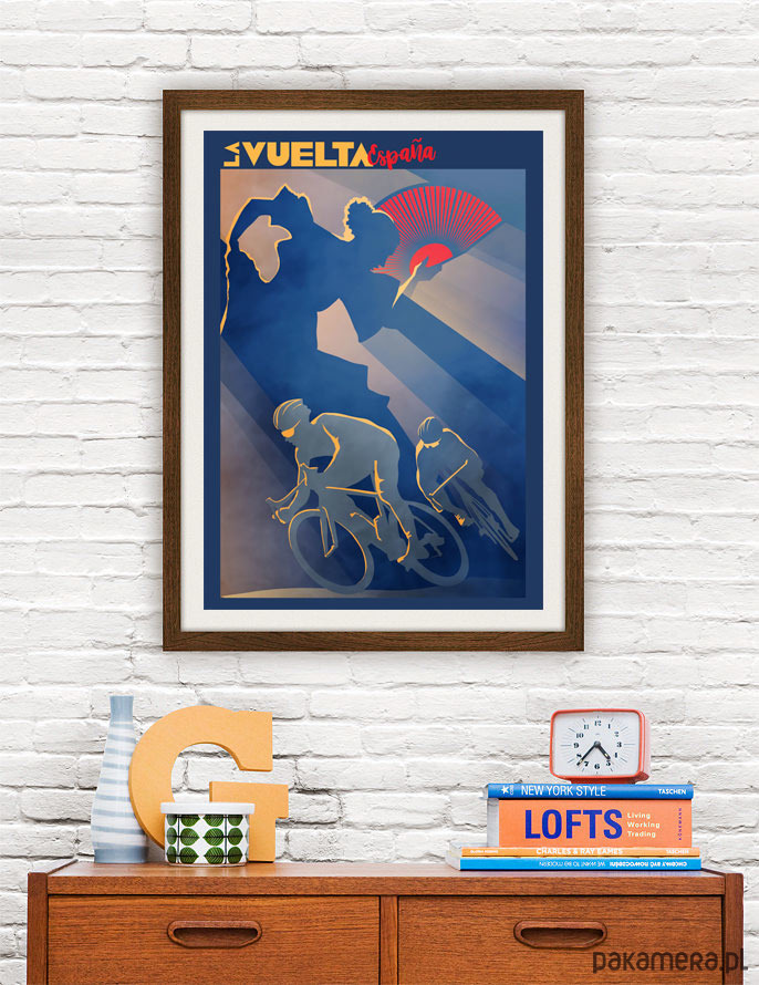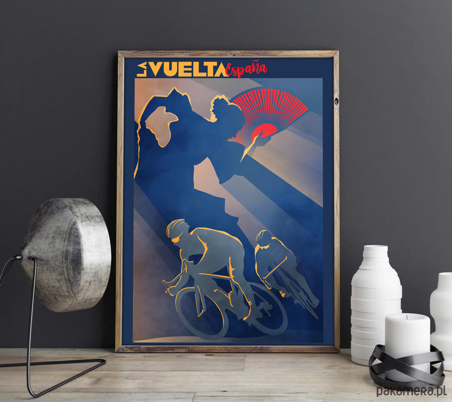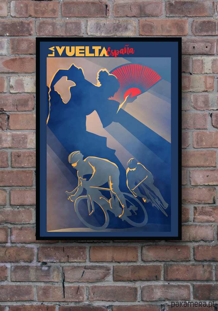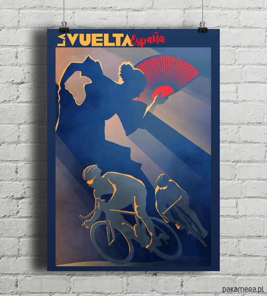 Plakat z autorską grafiką inspirowaną jednym z największych wyścigów kolarskich świata La Vuelta a Espana (Wyścig dookoła Hiszpani), zaliczanym do wielkich tourów, po Tour de France i Giro d'Italia.