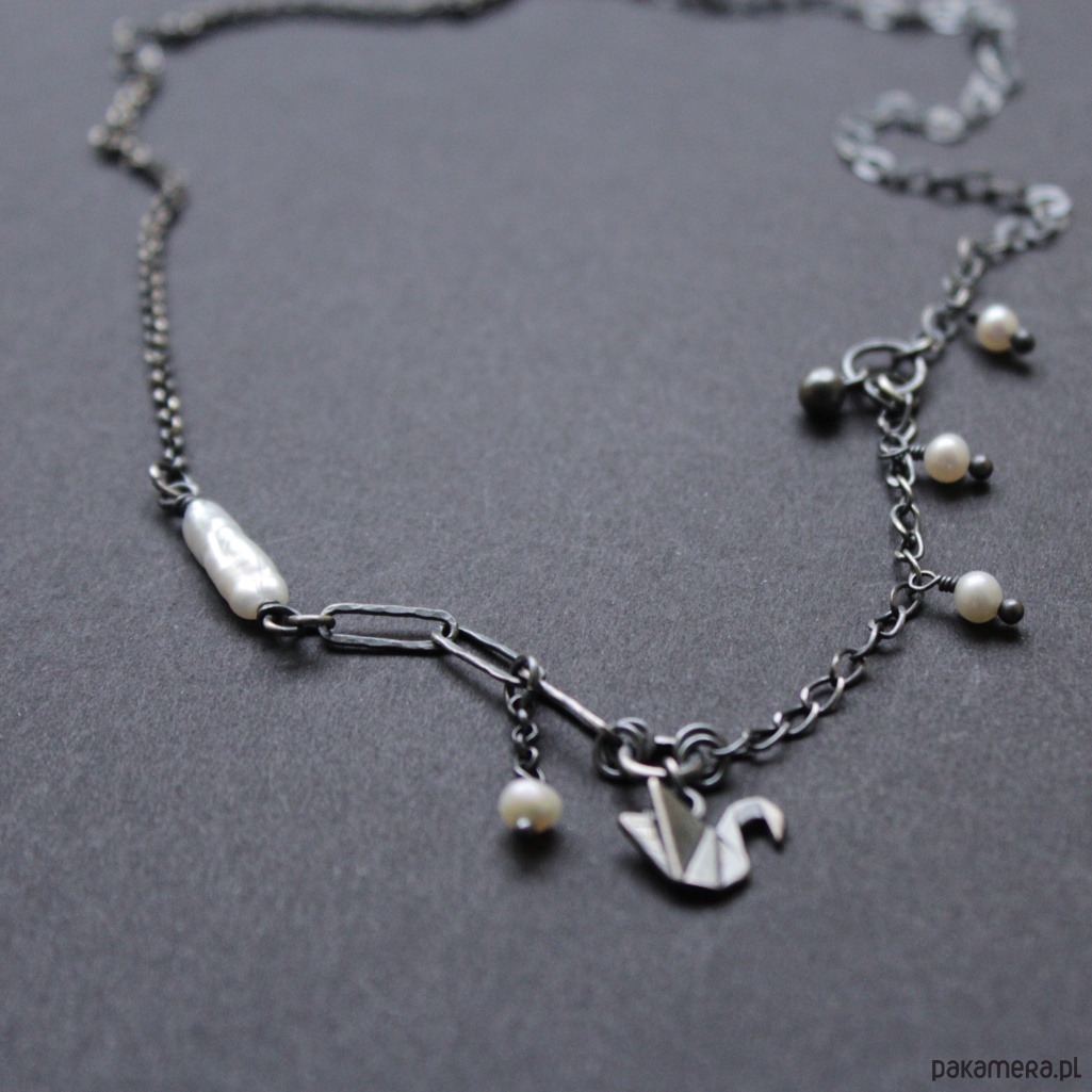 Naszyjnik wykonane zostały z ręcznie oksydowanego i polerowanego srebra próby 925 oraz naturalnych perełek hodowlanych wielkości 0,2-0,7 cm.