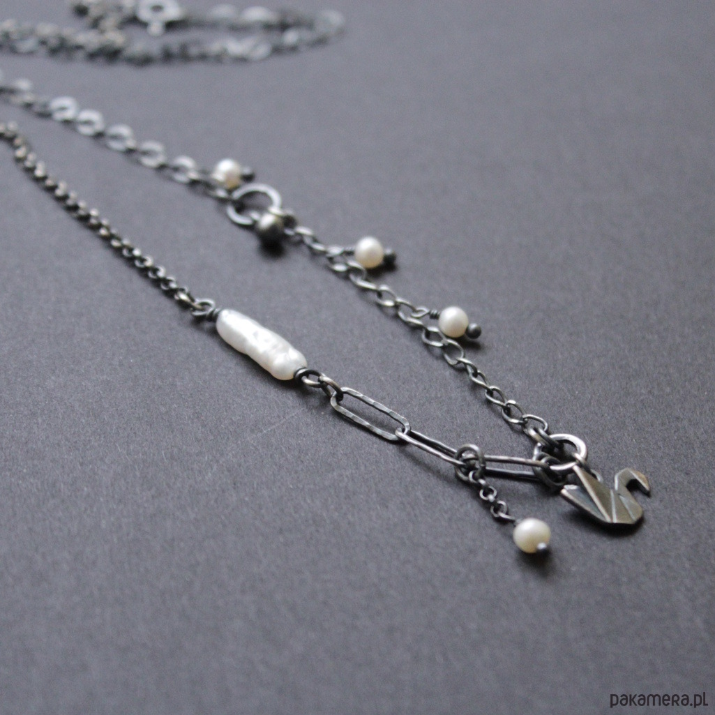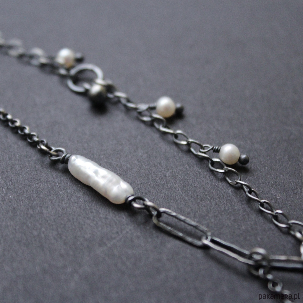 Naszyjnik wykonane zostały z ręcznie oksydowanego i polerowanego srebra próby 925 oraz naturalnych perełek hodowlanych wielkości 0,2-0,7 cm.
