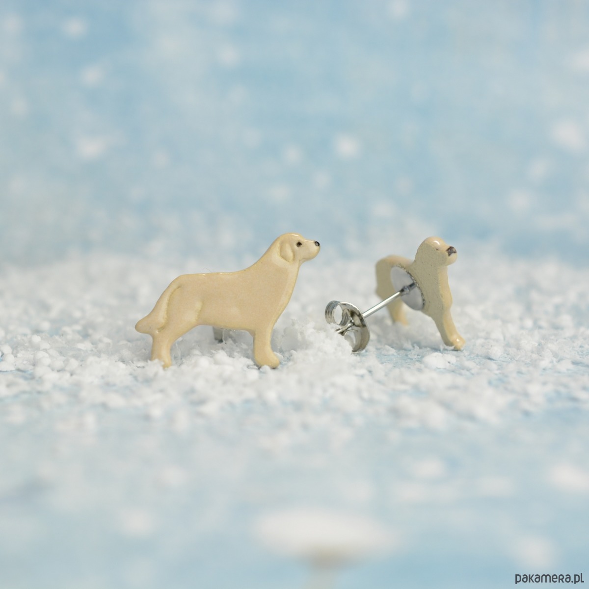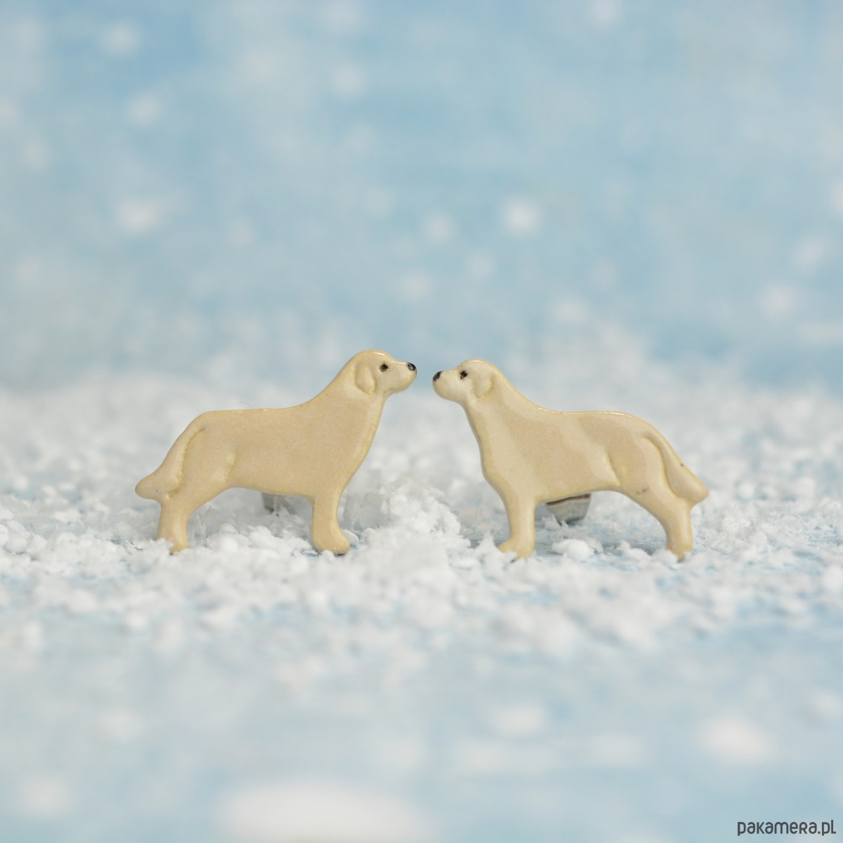 Malutkie psiaki mają wymiary: 1,4cm wysokość, 2cm szerokość, 1,5mm grubość. Pieski są malutkie i leciutkie. Kolczyki wykonuję od podstaw ręcznie:) Każda para jest inna:)))) Pieski zostały solidnie umocowane na sztyftach ze stali chirurgicznej- antyalergiczna w kolorze oksydowanego srebra. Wysyłam w ozdobnym pudełeczku.