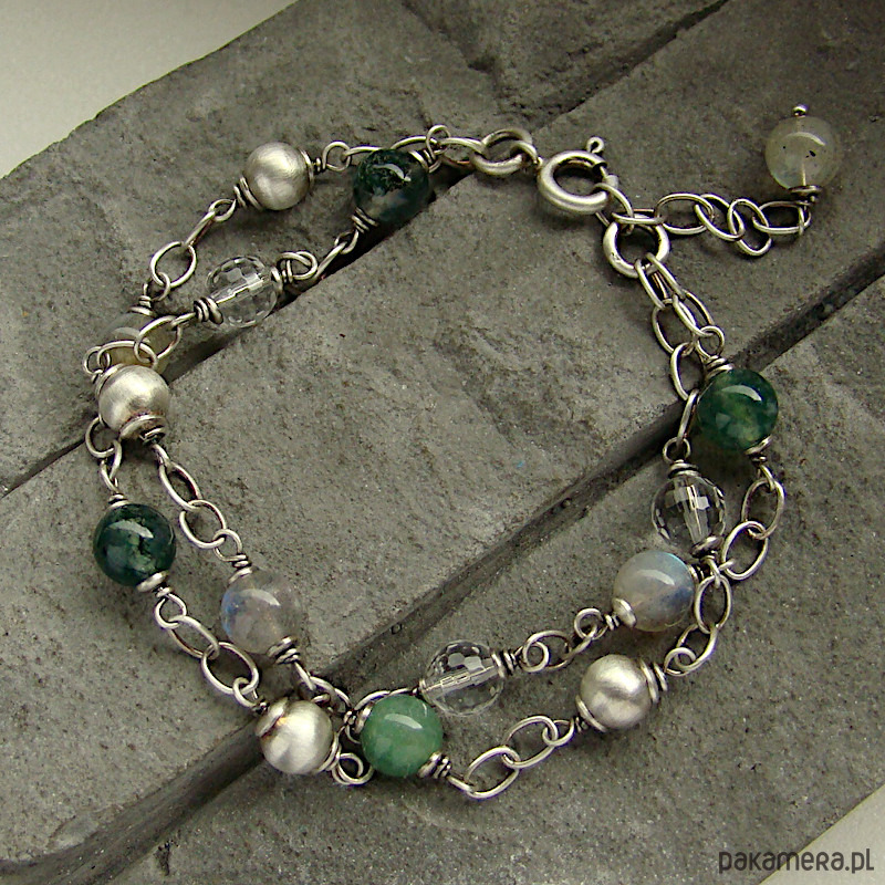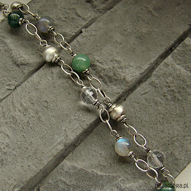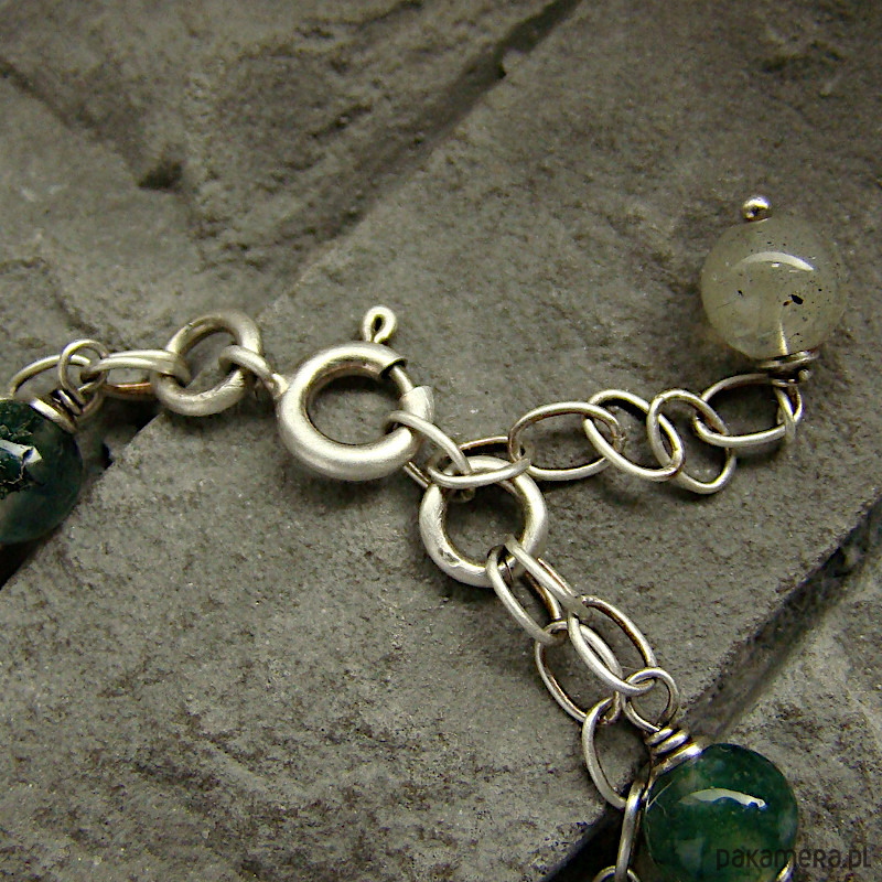 Subtelna i kobieca bransoletka na co dzień. Wykonana w całości z oksydowanego srebra próby 925 oraz kulek labradorytu, agatu mszystego i krysztalu gorskiego wielkości 6 mm. Całkowita długość bransoletki regulowana od 18,5 cm do 21 cm. W mojej galerii kolczyki do kompletu. Ozdobnie zapakowana.
