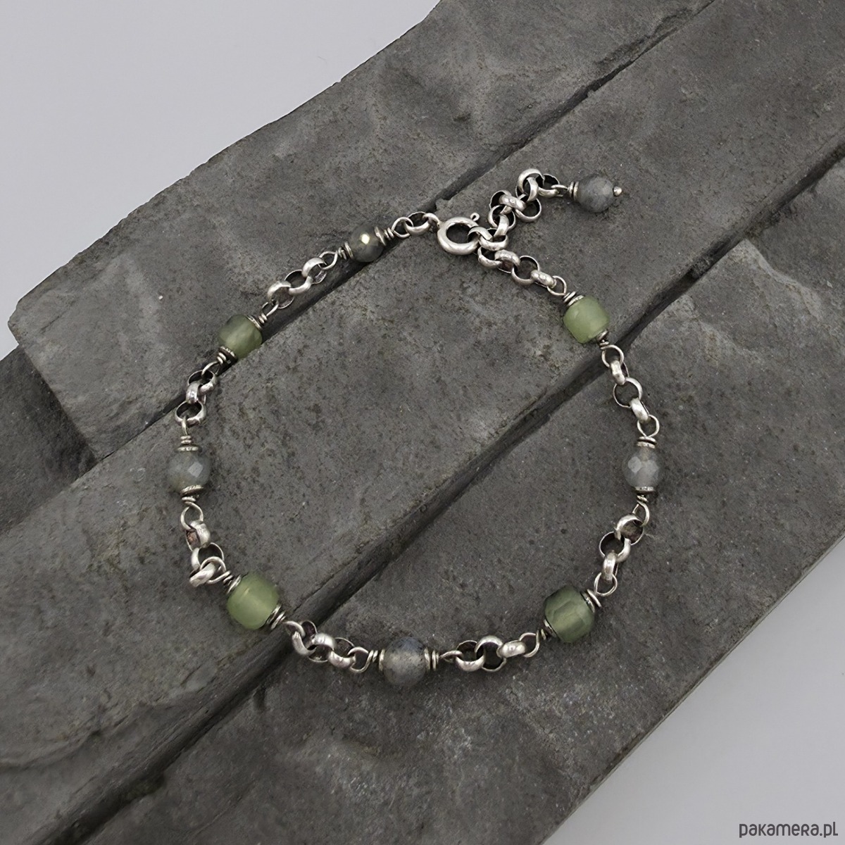 Kobieca i minimalistyczna bransoletka na co dzień i nie tylko. Wykonana w całości z oksydowanego srebra próby 925 oraz fasetowanych kostek frenitu i fasetowanych kulek labradorytu wielkosci 5 mm. Grubość łańcuszka to 3,8 mm. Całkowita długość bransoletki regulowana od 17,5 cm do 20,5 cm. W mojej galerii jest dostępny naszyjnik do kompletu widoczny na ostatnim zdjeciu. Ozdobnie zapakowana.