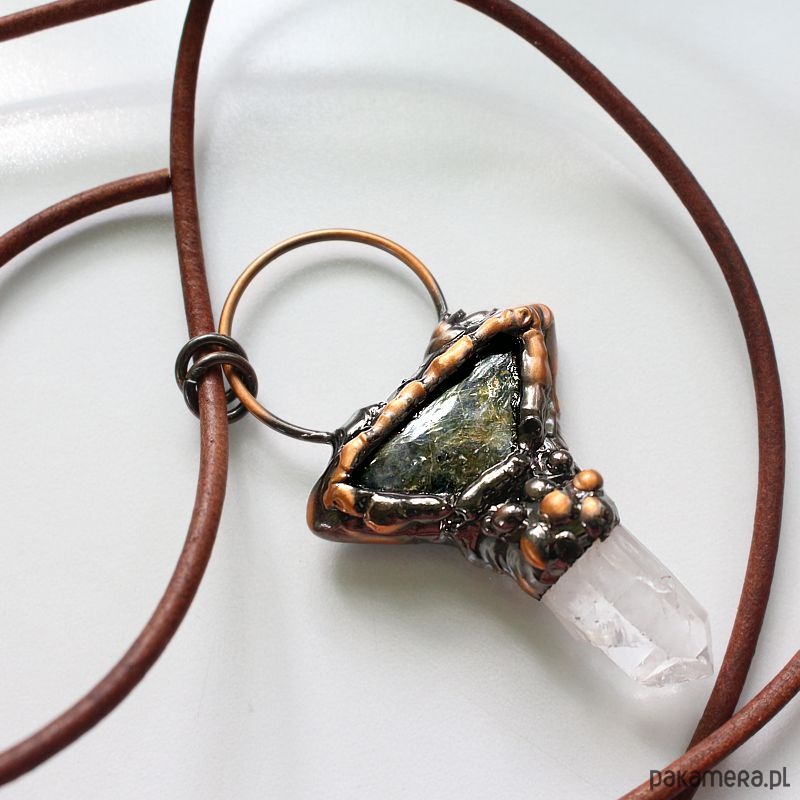 Przepiękny energetyczny wisior z labradorytem i surowym kryształem górskim w oprawie miedzianej. Wspiera proces wybaczania – oczyszczania z pamiętliwości, poczucia krzywdy i ciosu od losu, ograniczonego spojrzenia na naturę doświadczeń. Wspiera równoważenie energii, dojście do stanu klarowności, zgody, ukierunkowania na Mądrość Uniwersalną.
