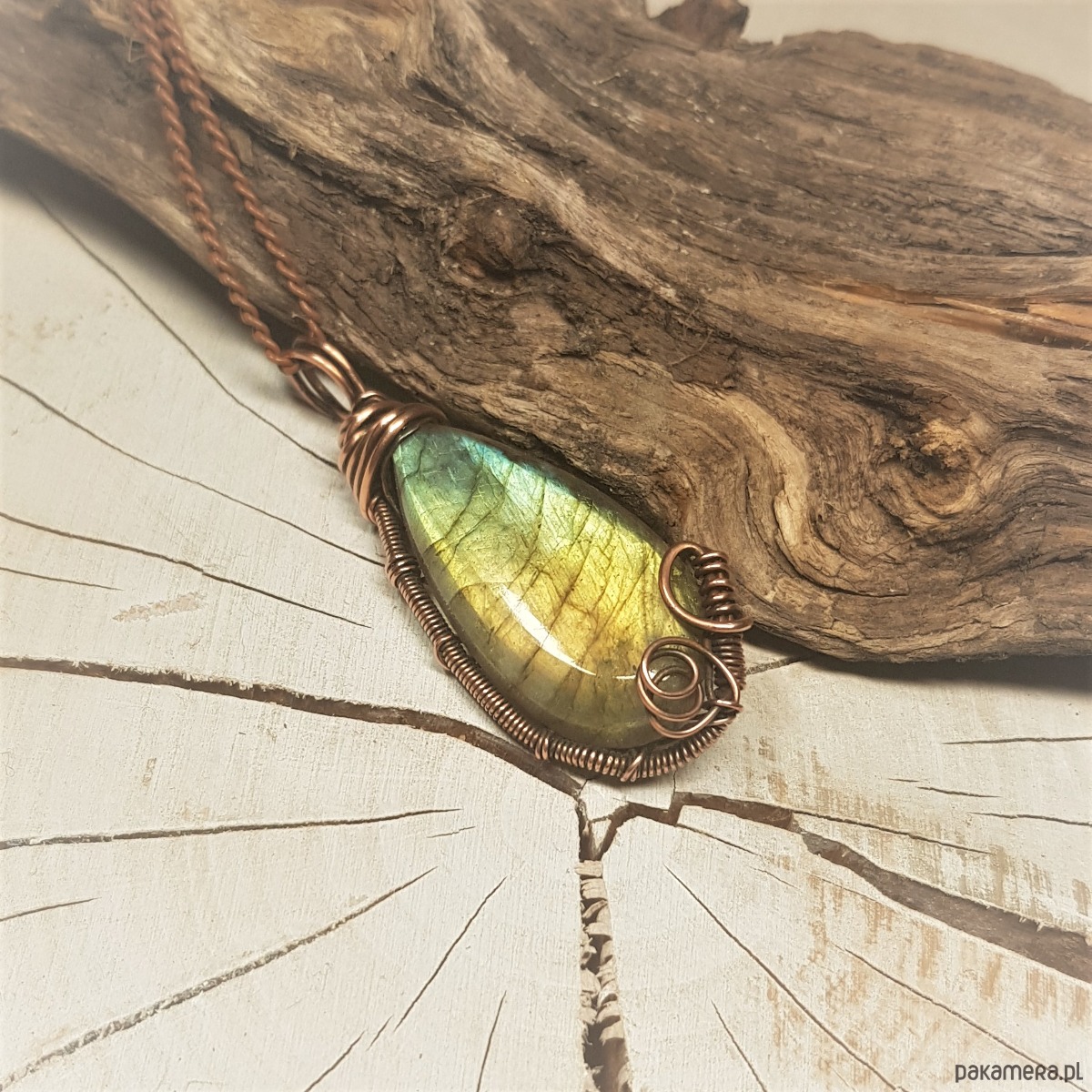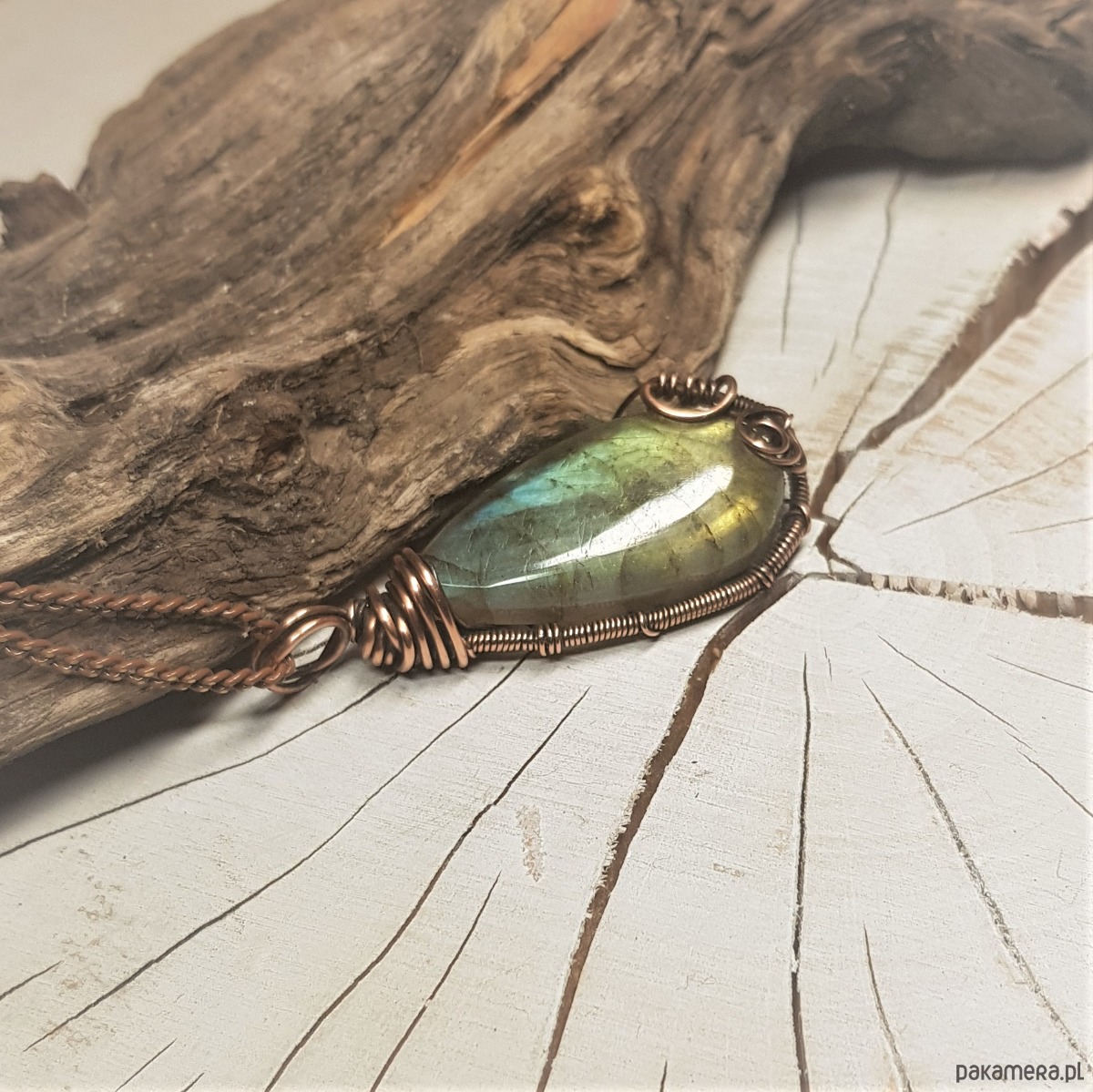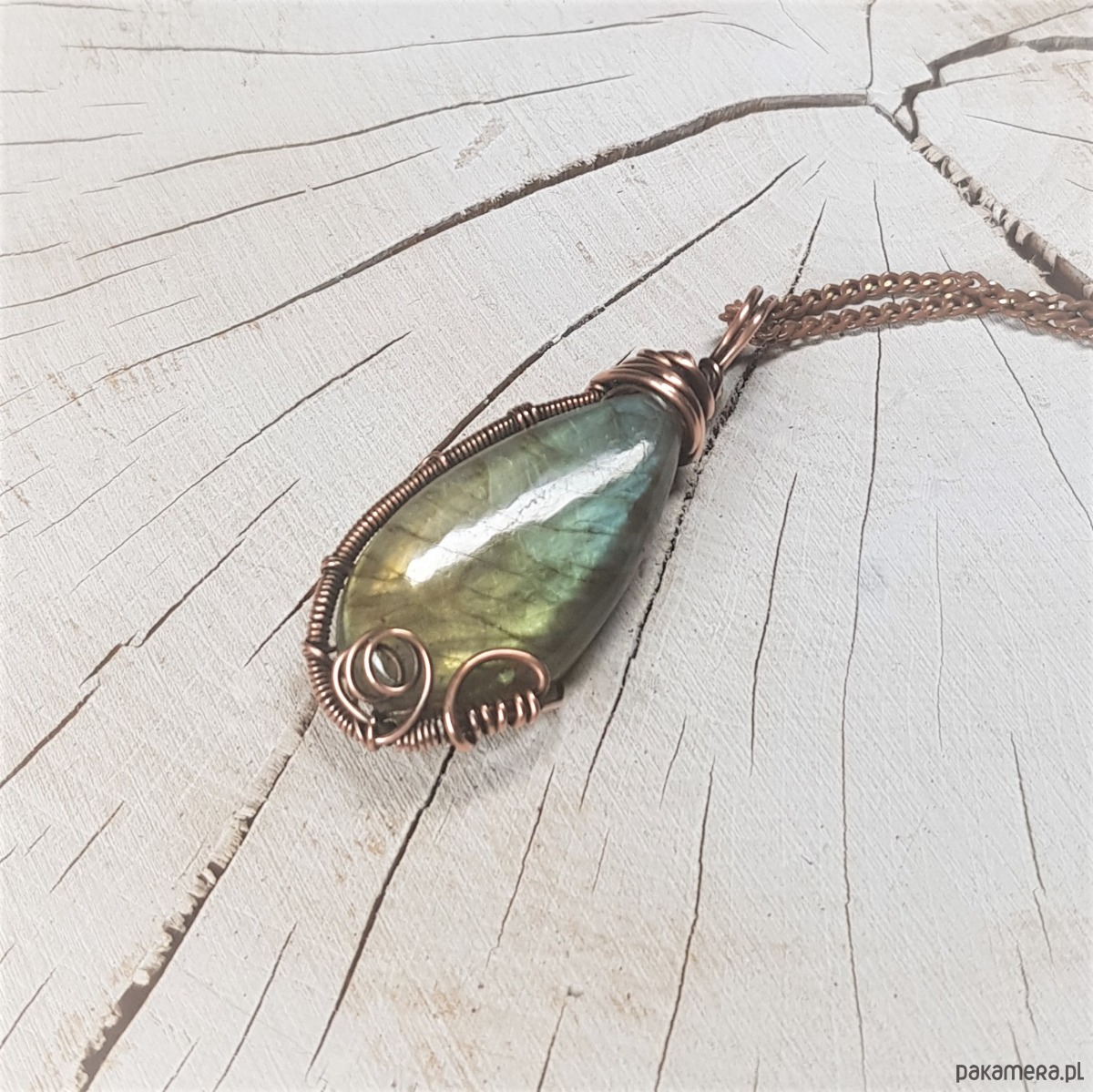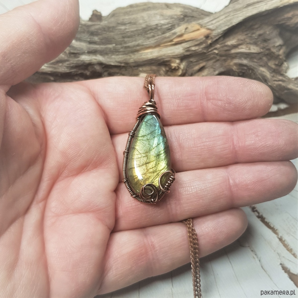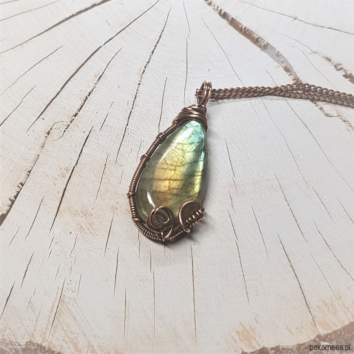 Zawieszka wykonana ręcznie w miedzi metodą wire-wrappingu której głównym elementem jest naturalny niewielki labradoryt mieniący się wieloma kolorami tęczy z dominacją złotego i niebieskiego. Wisiorek został oksydowany i wypolerowany w celu uzyskania efektu szlachetnego postarzenia. Wymiary zawieszki 45x18mm z łańcuszkiem długości około 48-50 cm.