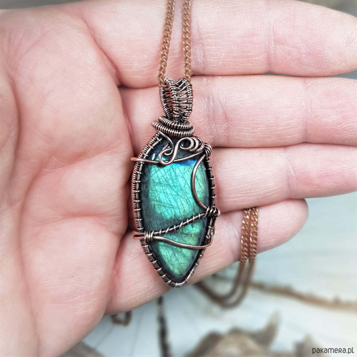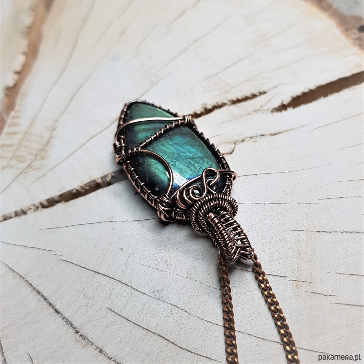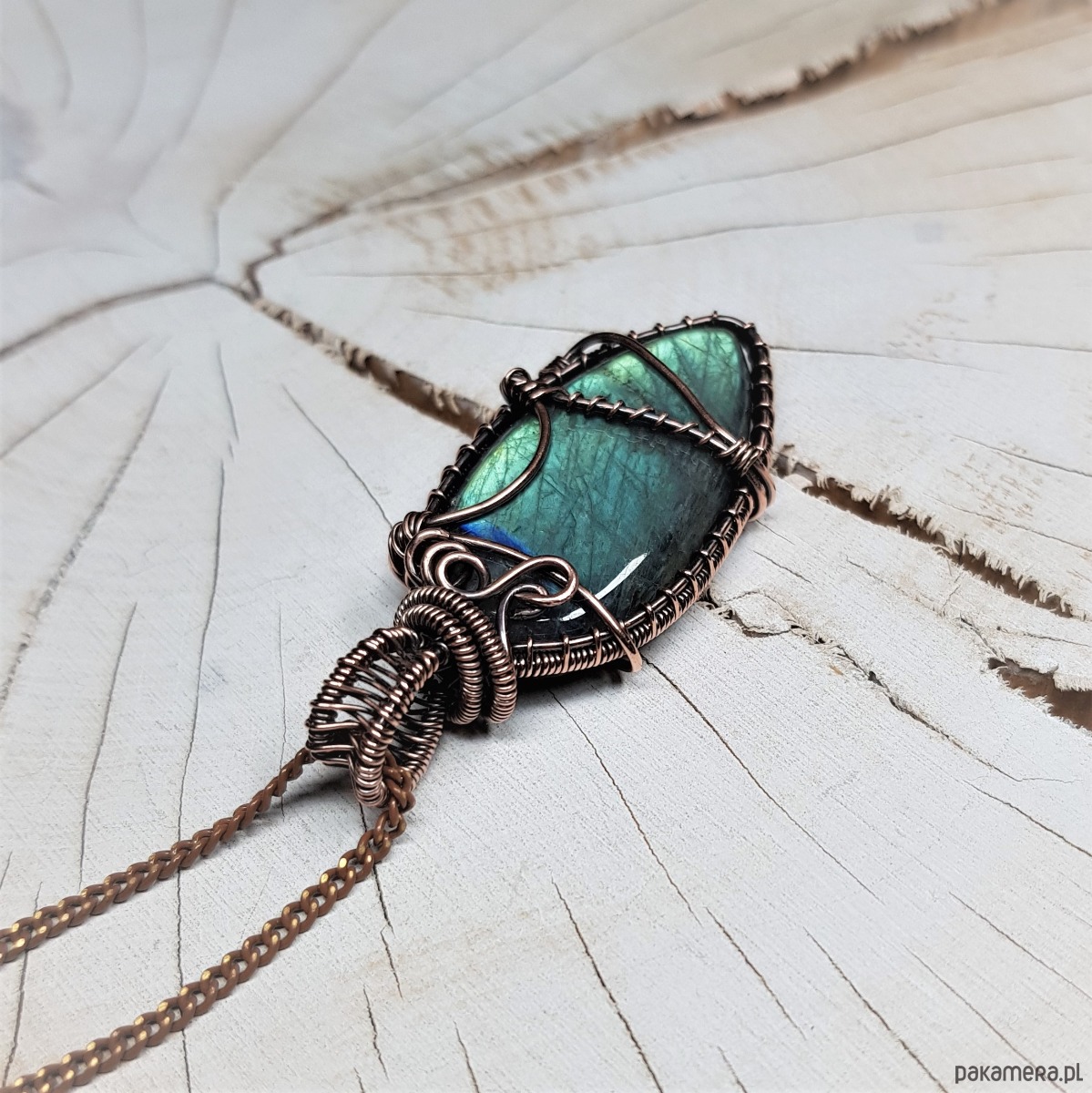 Zawieszka wykonana ręcznie w miedzi metodą wire-wrappingu której głównym elementem jest naturalny labradoryt mieniący się wieloma kolorami tęczy z dominacją zielonego i niebieskiego. Wisiorek został oksydowany i wypolerowany w celu uzyskania efektu szlachetnego postarzenia. Wymiary zawieszki 50x20mm z łańcuszkiem długości około 48-50 cm.