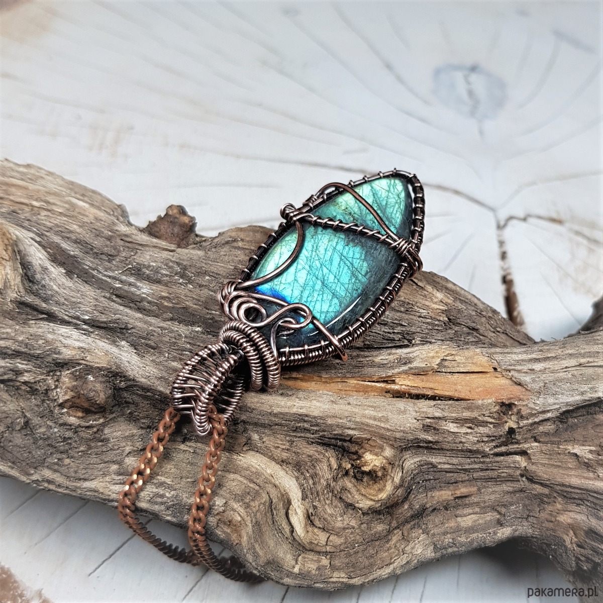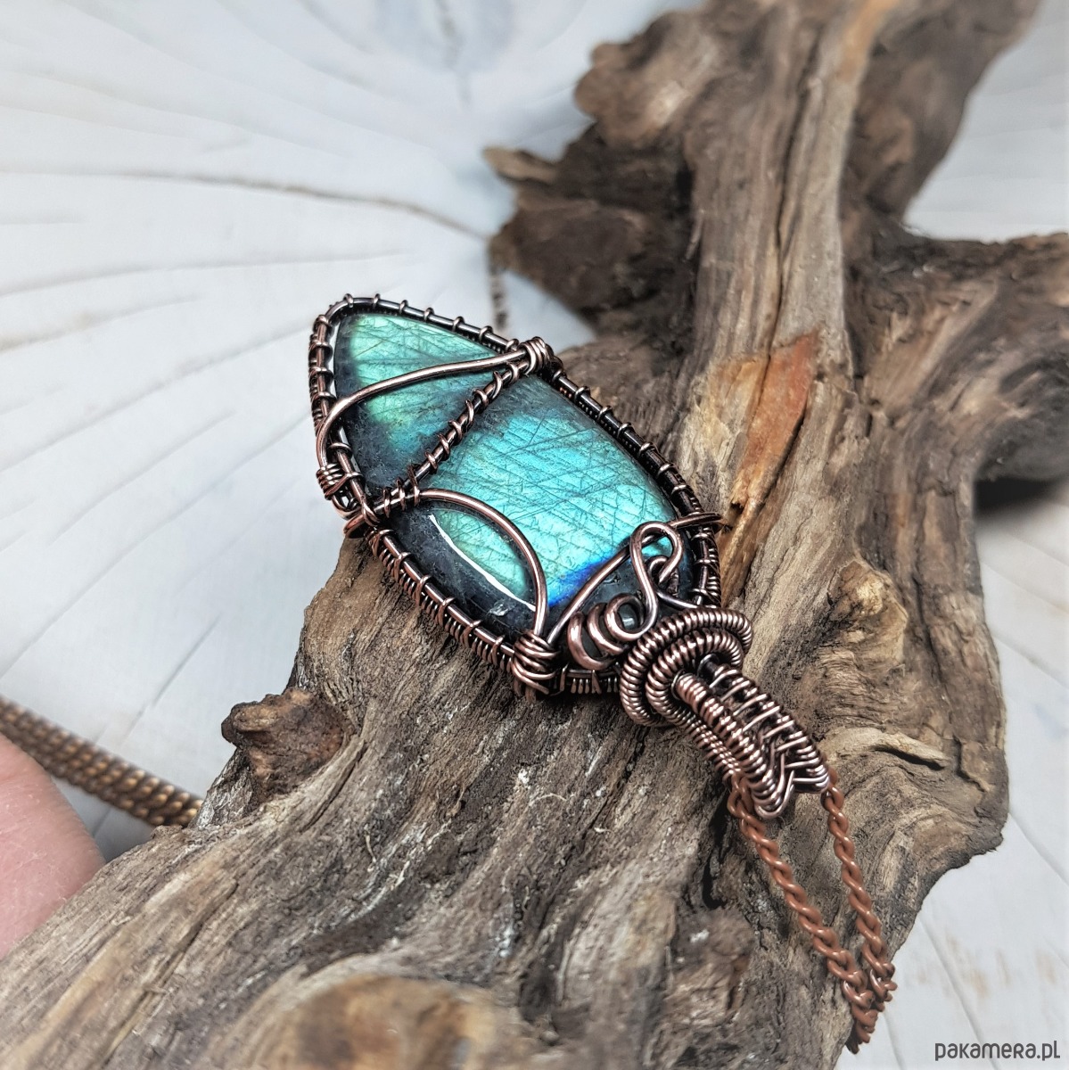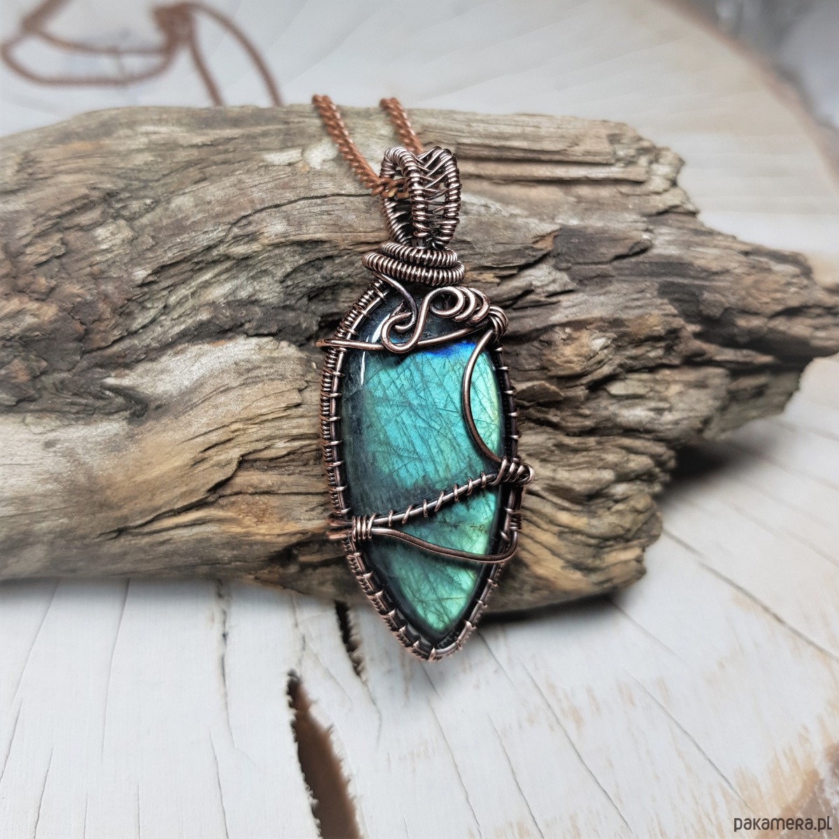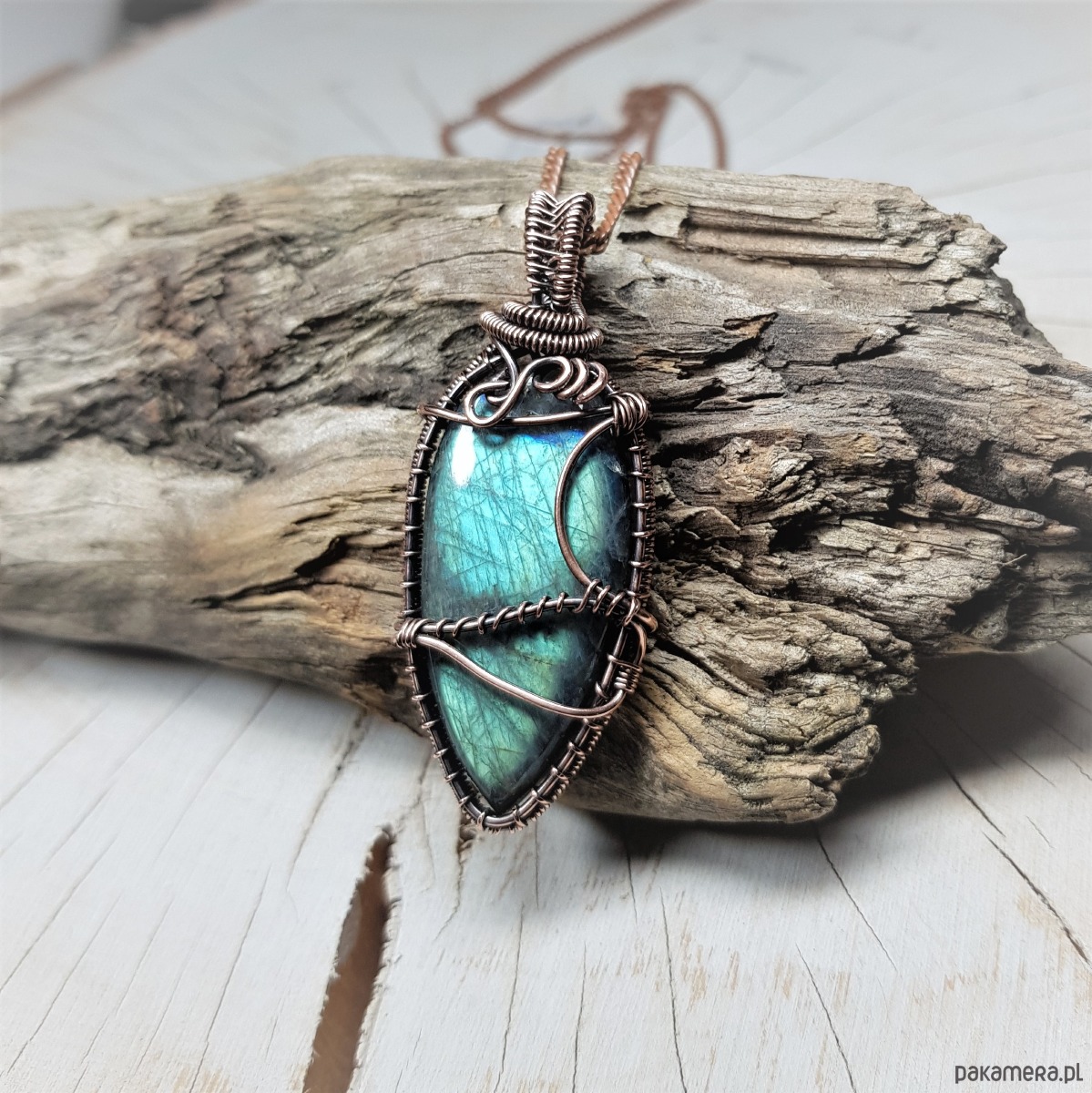 Zawieszka wykonana ręcznie w miedzi metodą wire-wrappingu której głównym elementem jest naturalny labradoryt mieniący się wieloma kolorami tęczy z dominacją zielonego i niebieskiego. Wisiorek został oksydowany i wypolerowany w celu uzyskania efektu szlachetnego postarzenia. Wymiary zawieszki 50x20mm z łańcuszkiem długości około 48-50 cm.