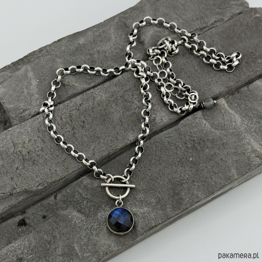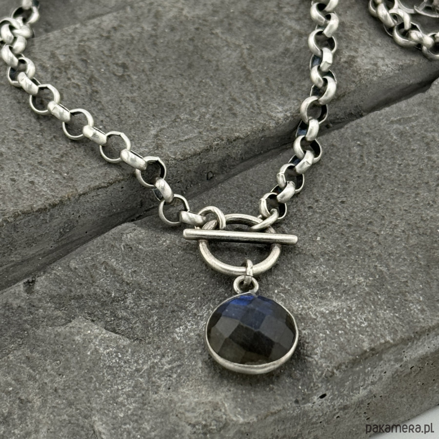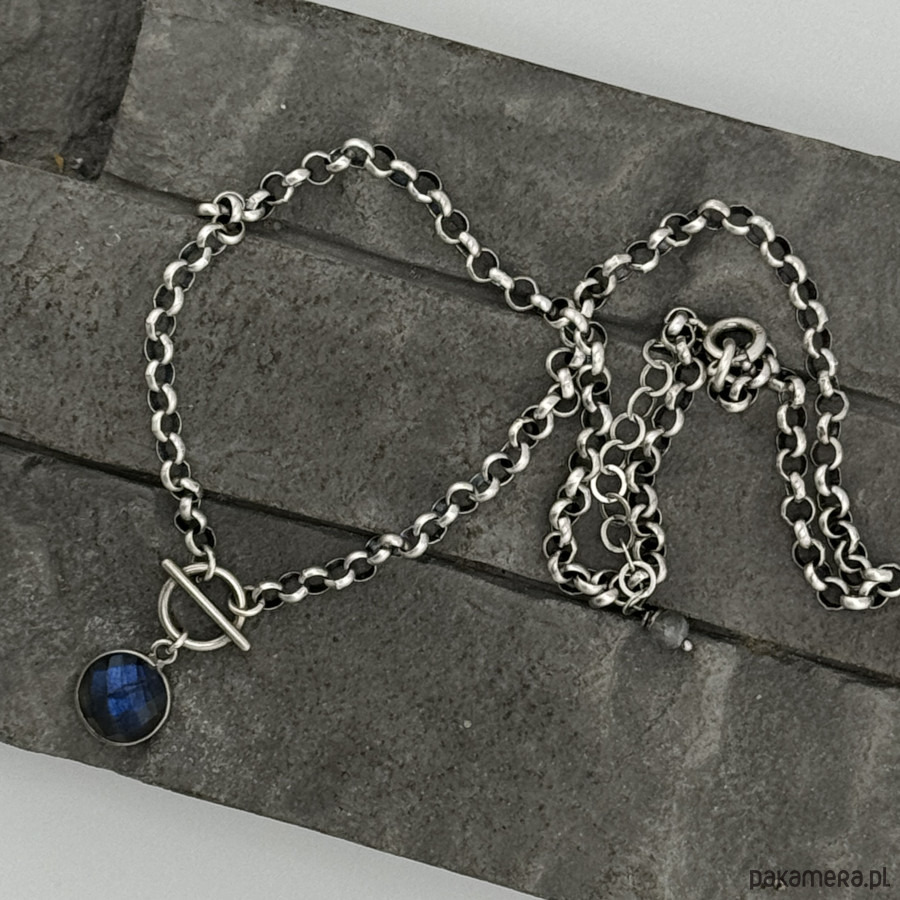 Kobiecy, modny naszyjnik na co dzień i nie tylko. Wykonany w całości z oksydowanego srebra próby 925 oraz fasetowanej monety labradorytu oprawionej w srebro wielkoscii 10 mm. Grubość łańcuszka to 3,8 mm. Obwód naszyjnika to 43 cm plus regulacja 5 cm. Na życzenie mogę go przedłużyć lub wykonac w wersji nieoksydowanej. Ozdobnie zapakowany.