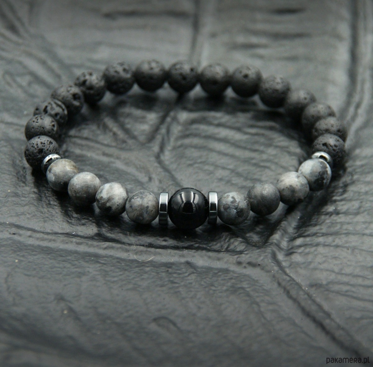 TUTAJ: niezwykle ciekawa bransoletka. kompozycja wykonana z porowatej lawy wulkanicznej (kule 8mm) oraz matowego czarnego labradorytu (8mm) , kuli onyksu 10mm i przekładek z hematytu. bez metalowych elementów = absolutnie antyalergiczna.