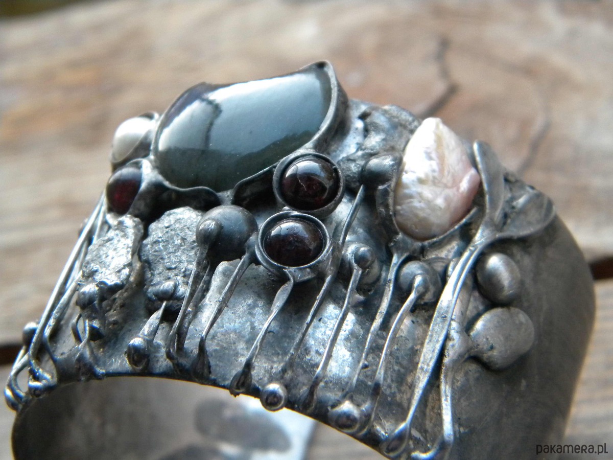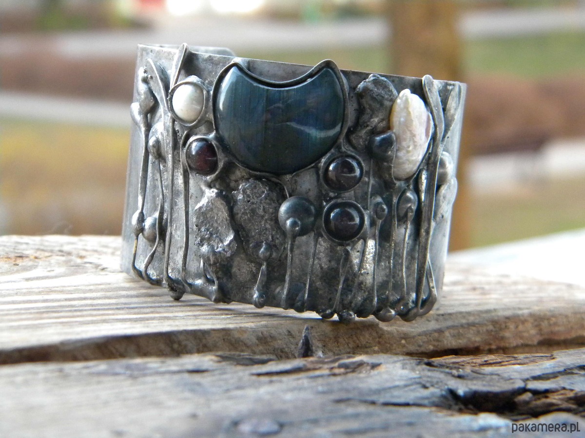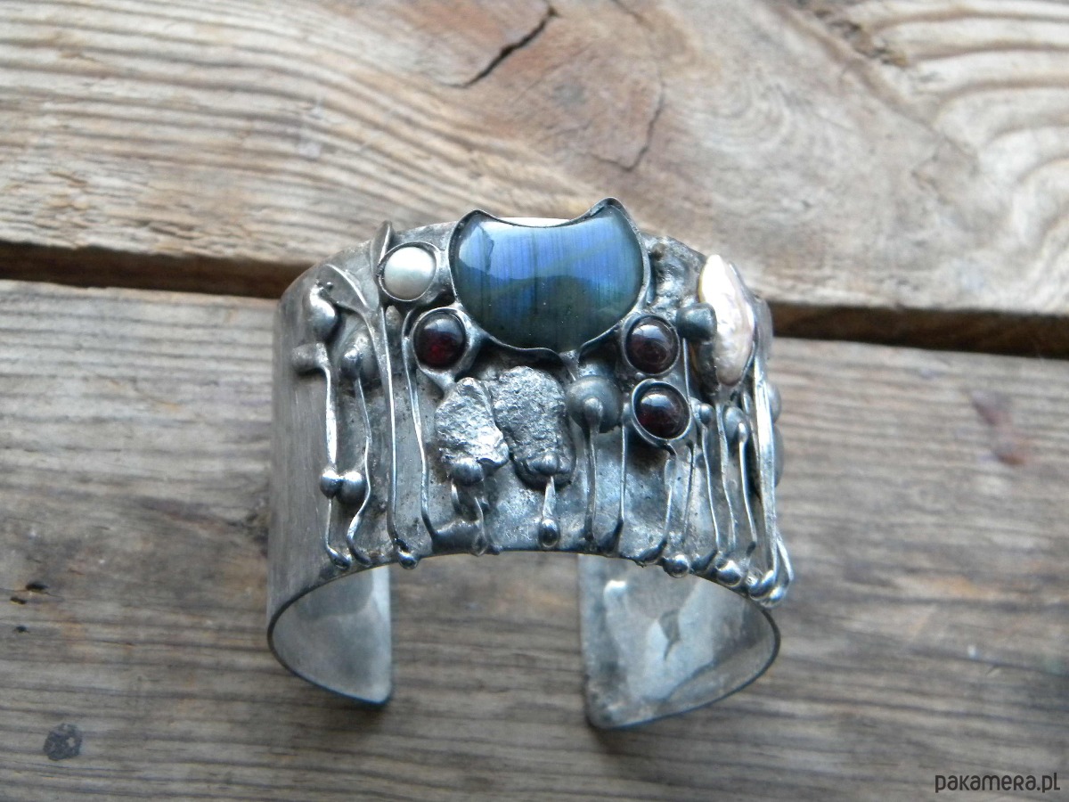 Bransoleta z ocynowanej miedzi, labradorytu, granatów i pereł