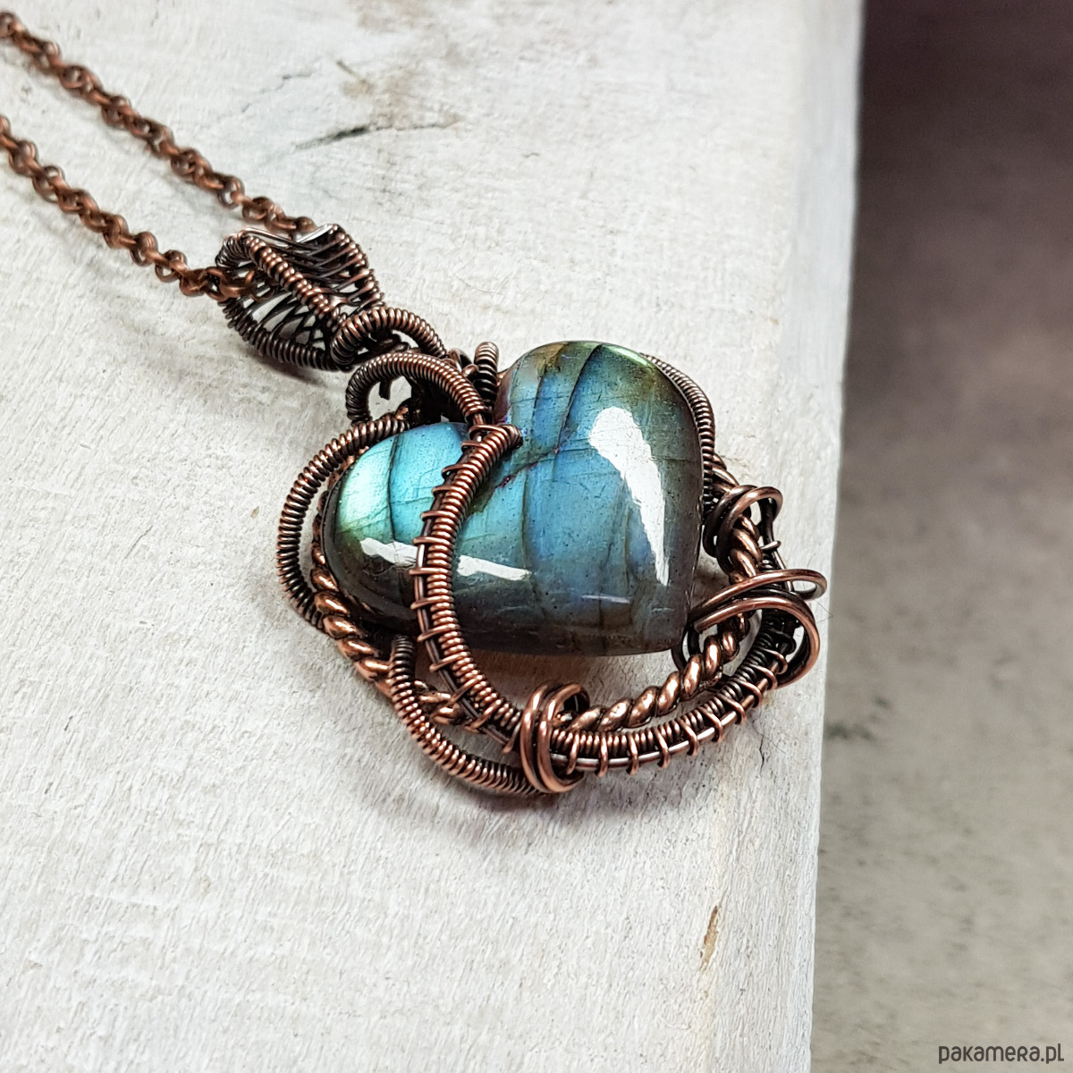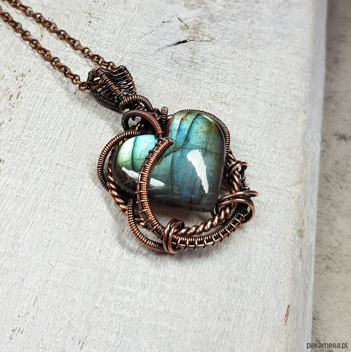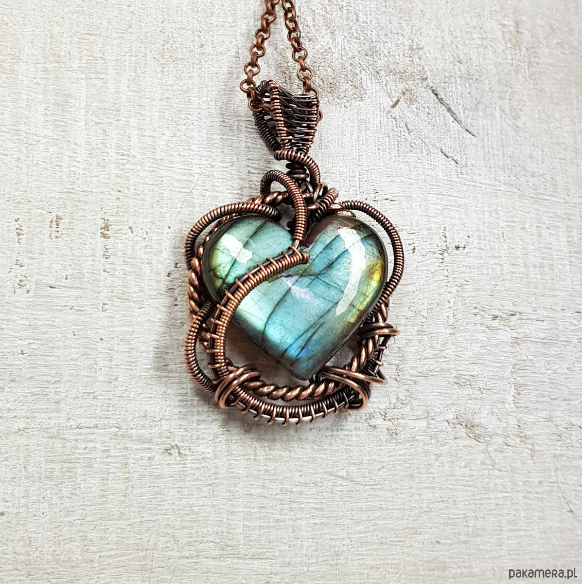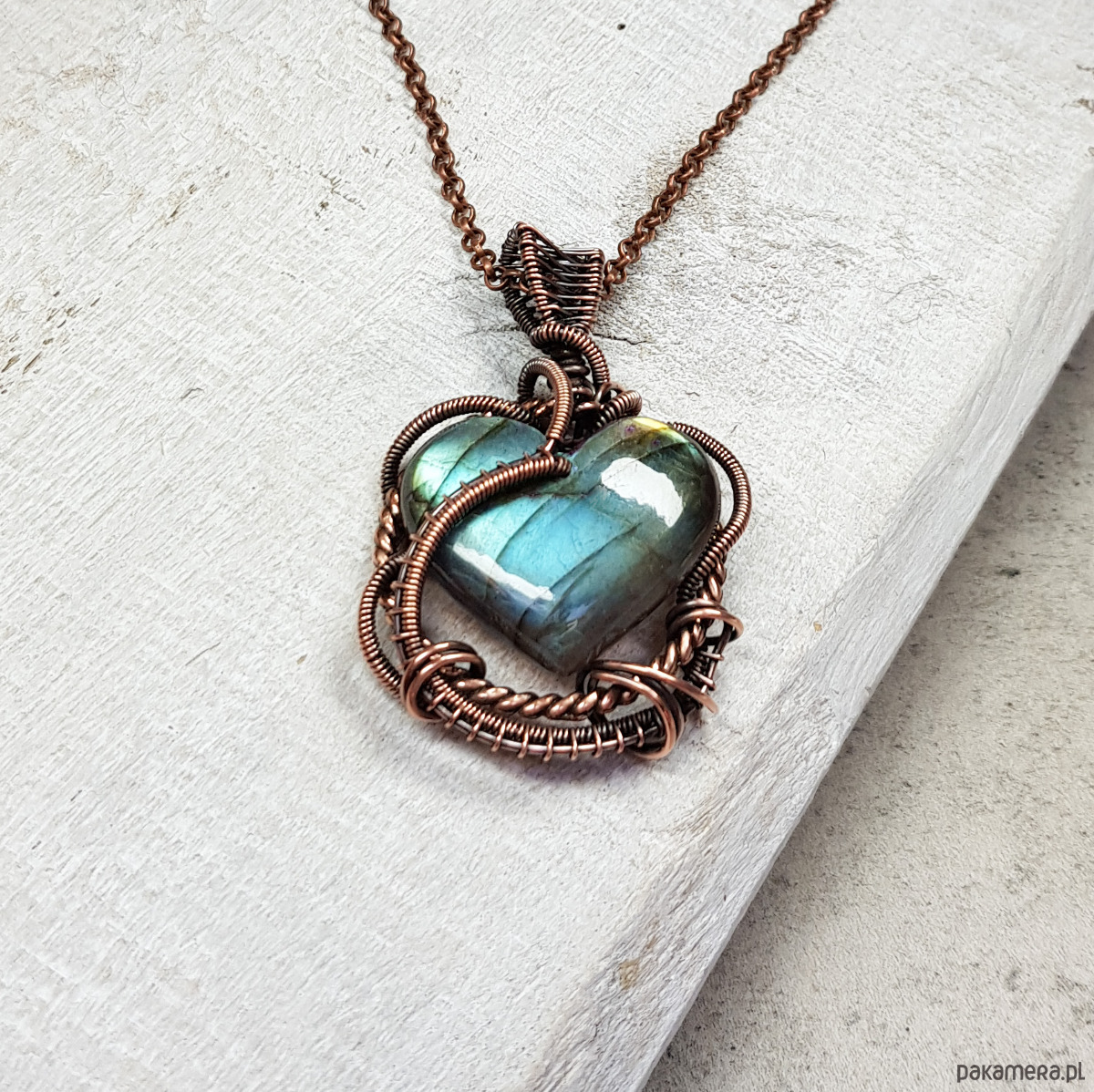 Zawieszka wykonana ręcznie w miedzi metodą wire-wrappingu której głównym elementem jest serce labradorytu w pięknym niebieskim i oliwkowym kolorze. Wisiorek został oksydowany i wypolerowany w celu uzyskania efektu szlachetnego postarzenia. Wymiary zawieszki 48x32mm z łańcuszkiem długości około 45 lub 60 cm. do wyboru