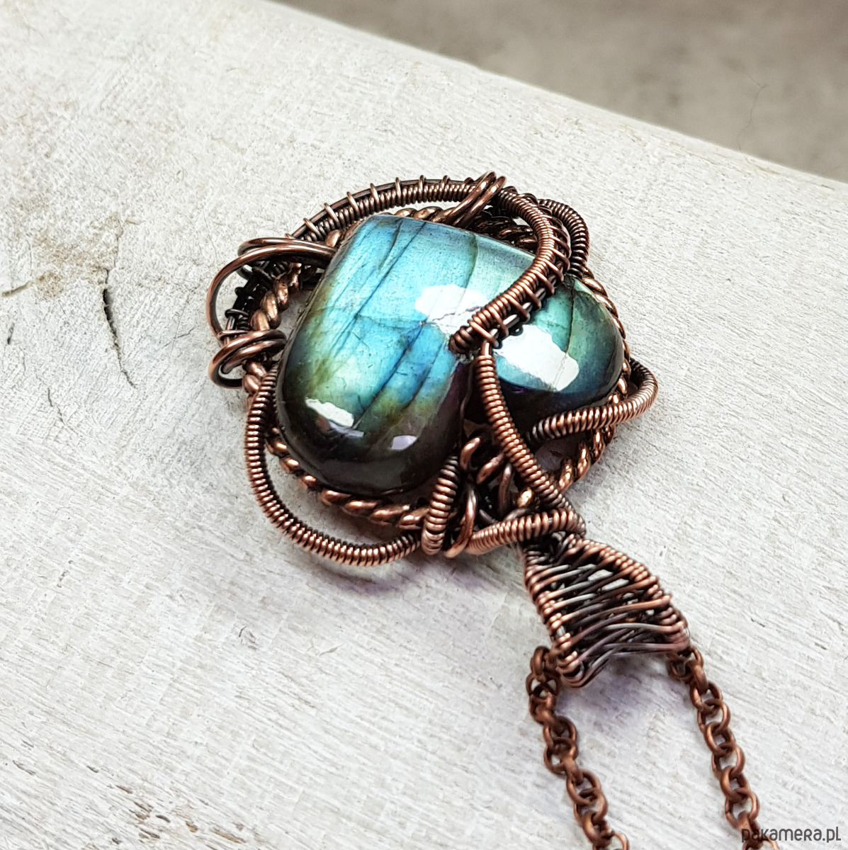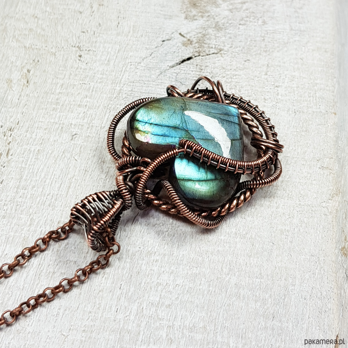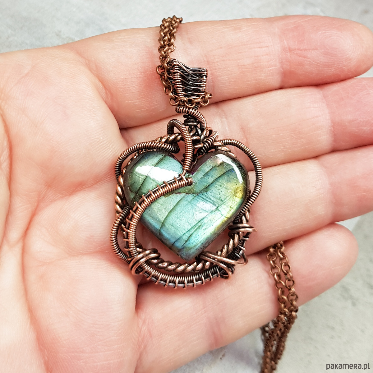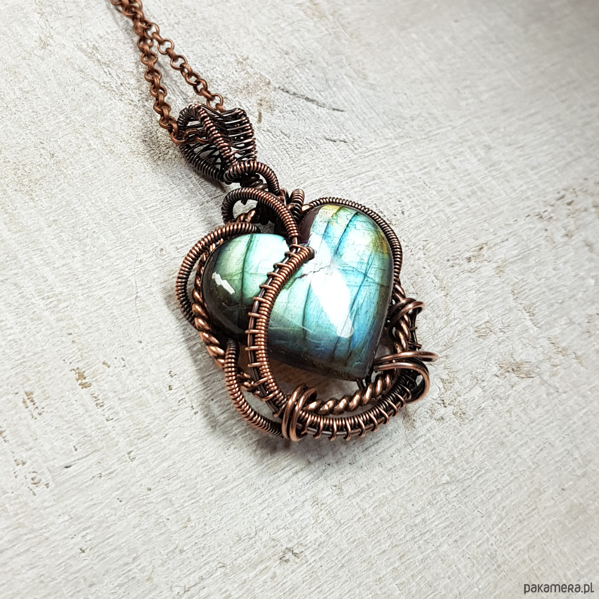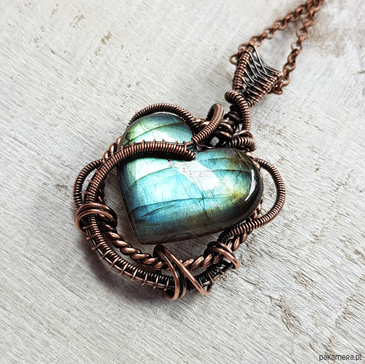 Zawieszka wykonana ręcznie w miedzi metodą wire-wrappingu której głównym elementem jest serce labradorytu w pięknym niebieskim i oliwkowym kolorze. Wisiorek został oksydowany i wypolerowany w celu uzyskania efektu szlachetnego postarzenia. Wymiary zawieszki 48x32mm z łańcuszkiem długości około 45 lub 60 cm. do wyboru