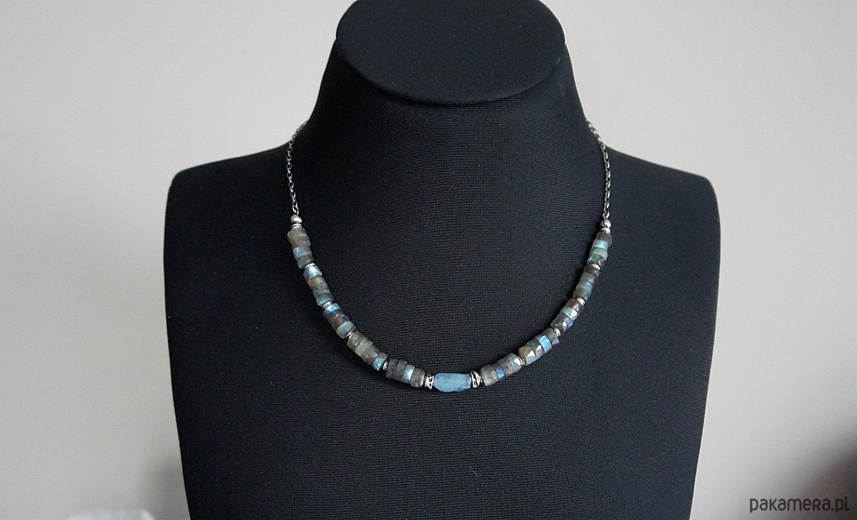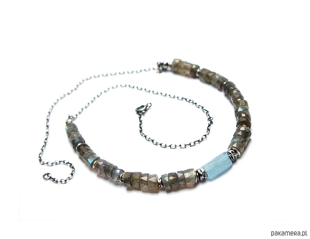 Naszyjnik wykonany ze srebra [pr. 925] w połączeniu z krążkami fasetowanych labradorytów [7-8mm], fasetowanym wałeczkiem morganitu [13 x 7mm]. Całość oksydowana i przetarta. Całkowita długość naszyjnika ok. 55,5cm. Biżuteria ozdobnie zapakowana.