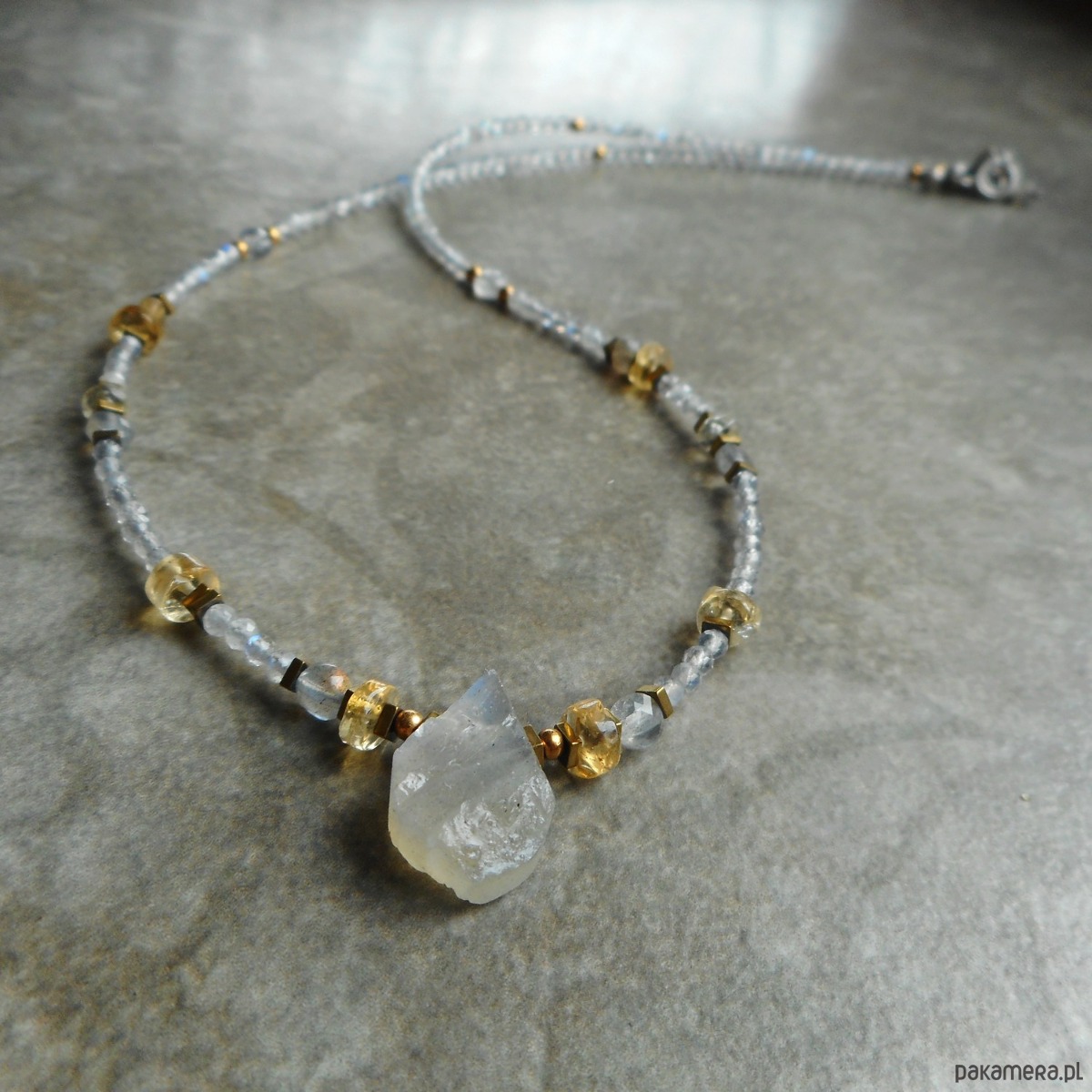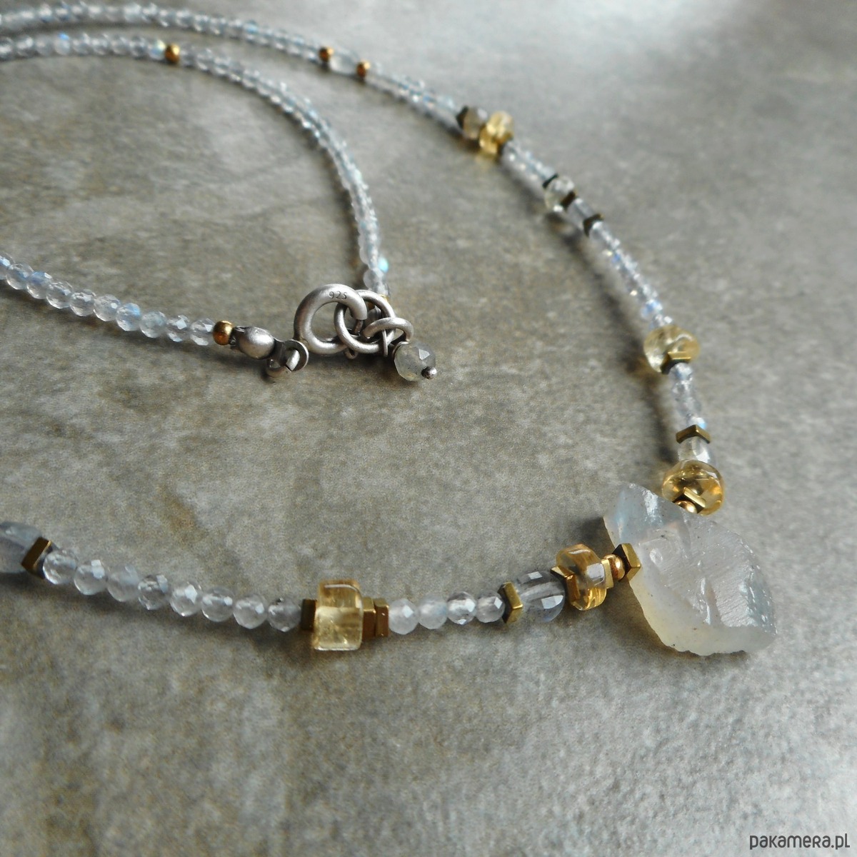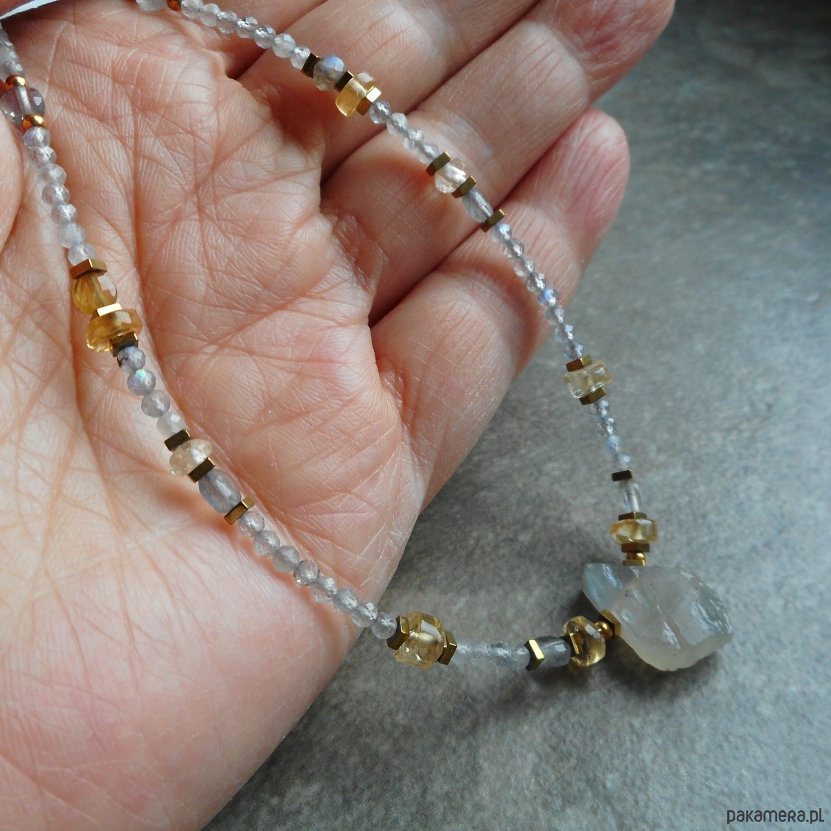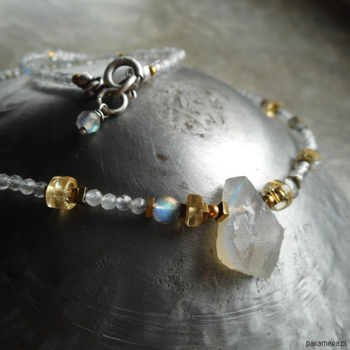 Piękny, krótki naszyjnik wykonany ze szlachetnego srebra i kamieni naturalnych; w stonowanych odcieniach, lśniący wysokiej jakości labradorytami, z kontrastową, surową kroplą labradorytu umieszczoną w centralnej części naszyjnika.
