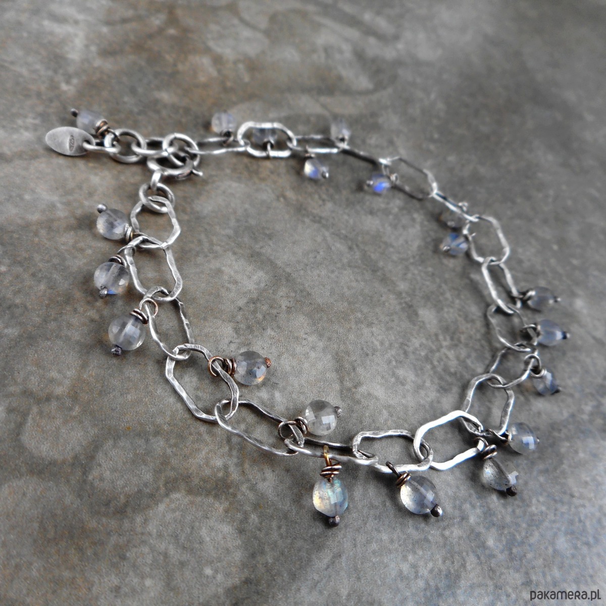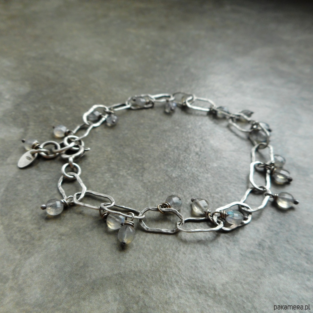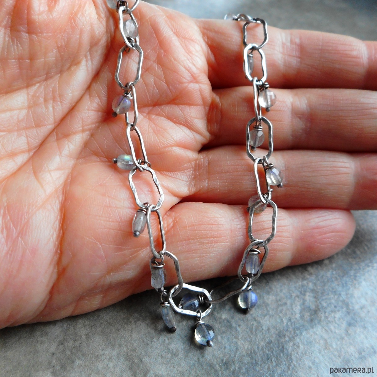 Delikatna bransoletka z zawieszkami, wykonana z kamieni naturalnych i szlachetnego srebra; lekka, łańcuszkowa, ozdobionych szeregiem drobnych, lśniących labradorytów. Łańcuszek o dużych młotkowanych oczkach wielkości 10 mm.
