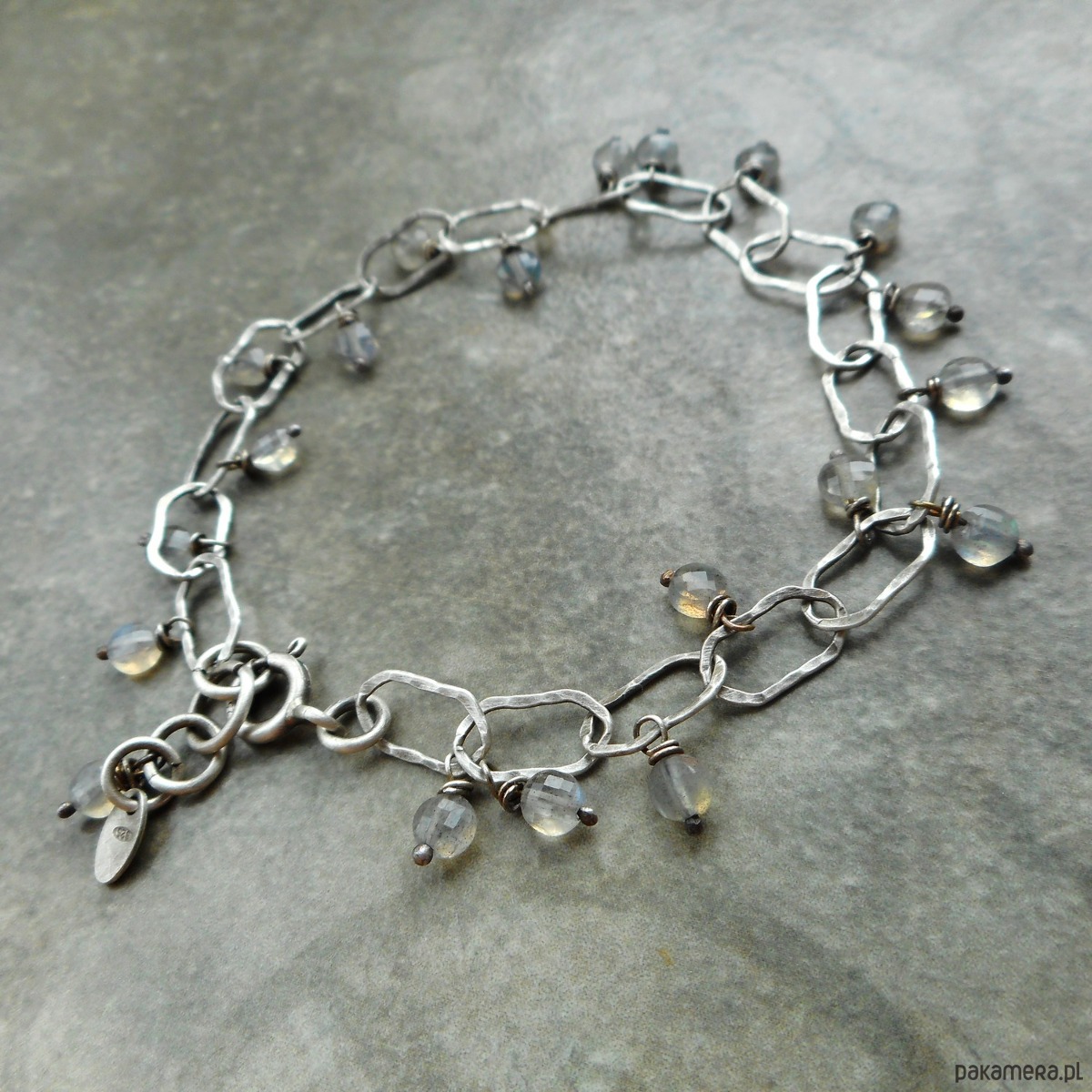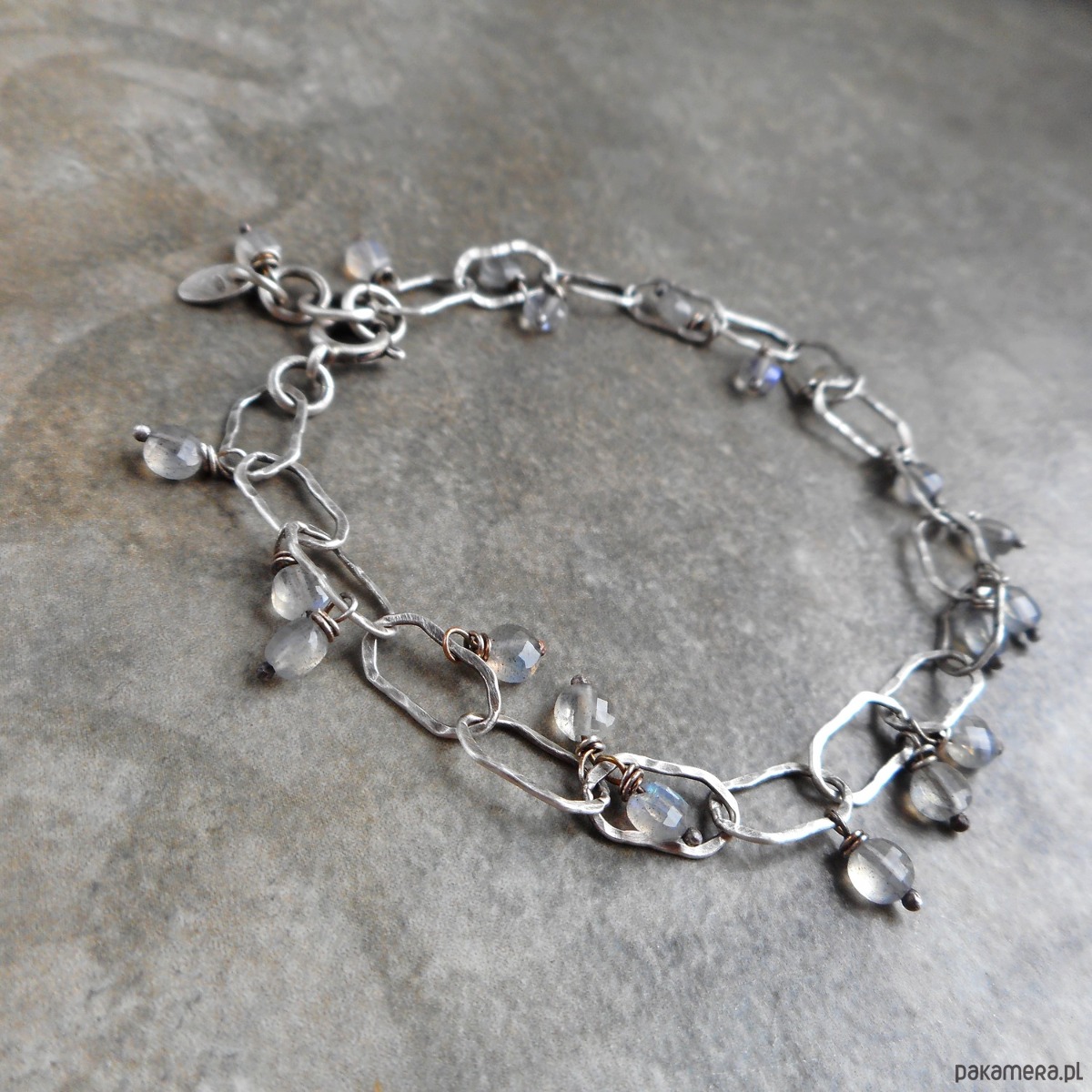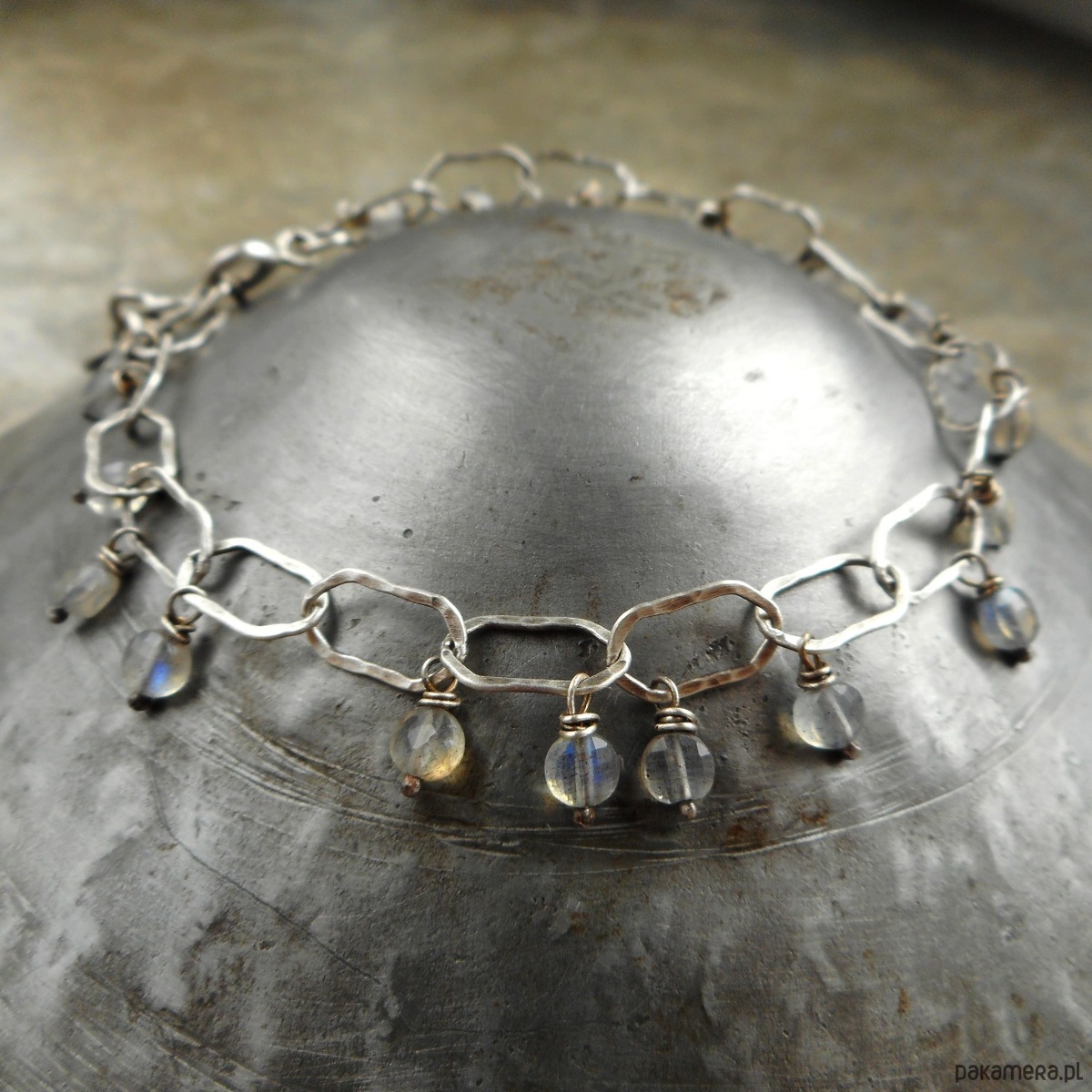 Delikatna bransoletka z zawieszkami, wykonana z kamieni naturalnych i szlachetnego srebra; lekka, łańcuszkowa, ozdobionych szeregiem drobnych, lśniących labradorytów. Łańcuszek o dużych młotkowanych oczkach wielkości 10 mm.