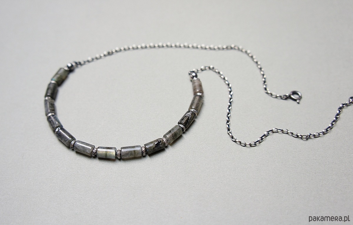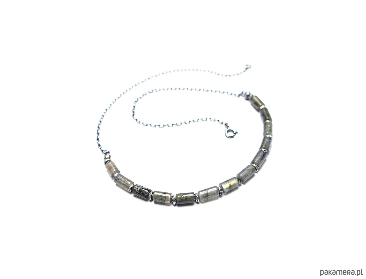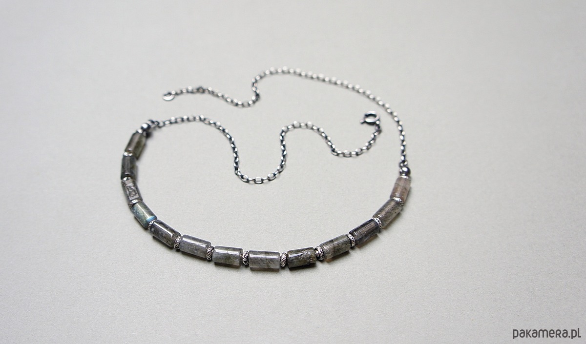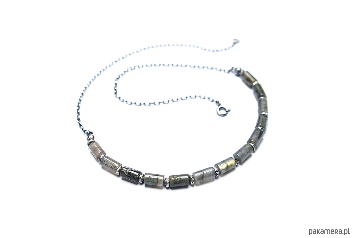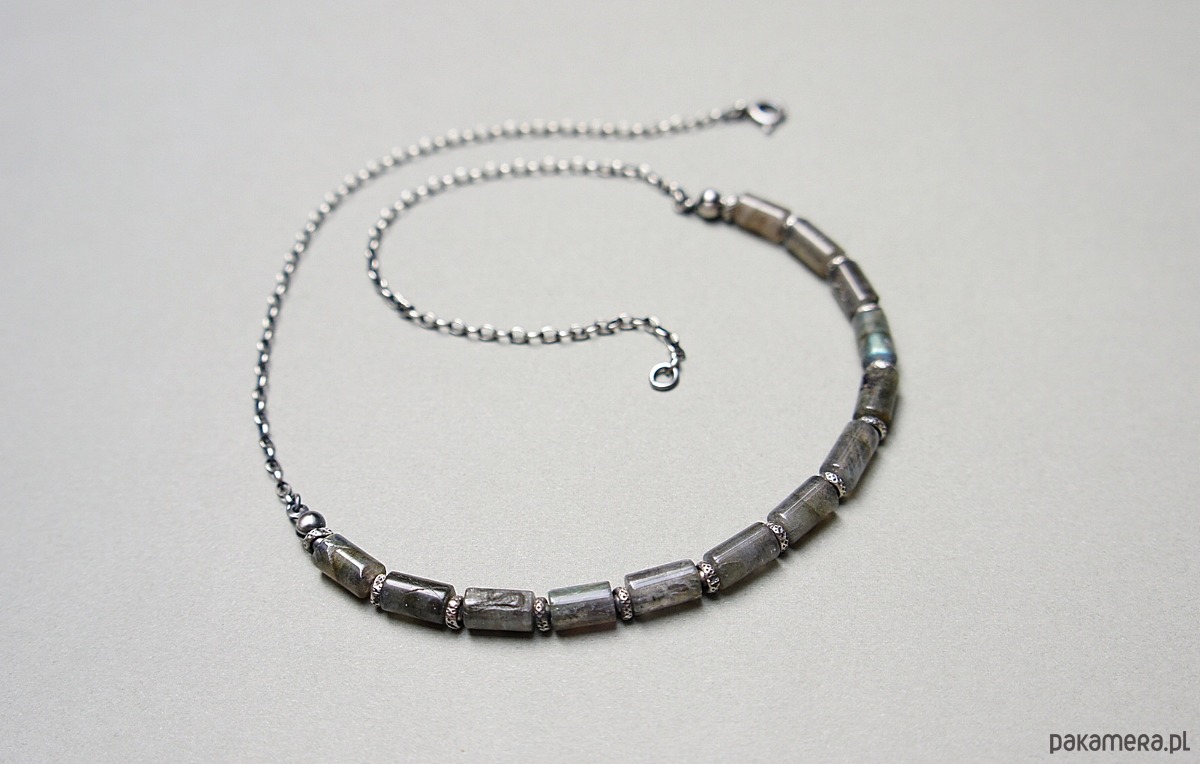 Naszyjnik wykonany ze srebra [pr. 925] w połączeniu z wałeczkami labradorytów [8mm - 9mm, naturalne niedoskonałości - wżery]. Całość oksydowana i przetarta. Całkowita długość naszyjnika ok.46cm. Biżuteria ozdobnie zapakowana.