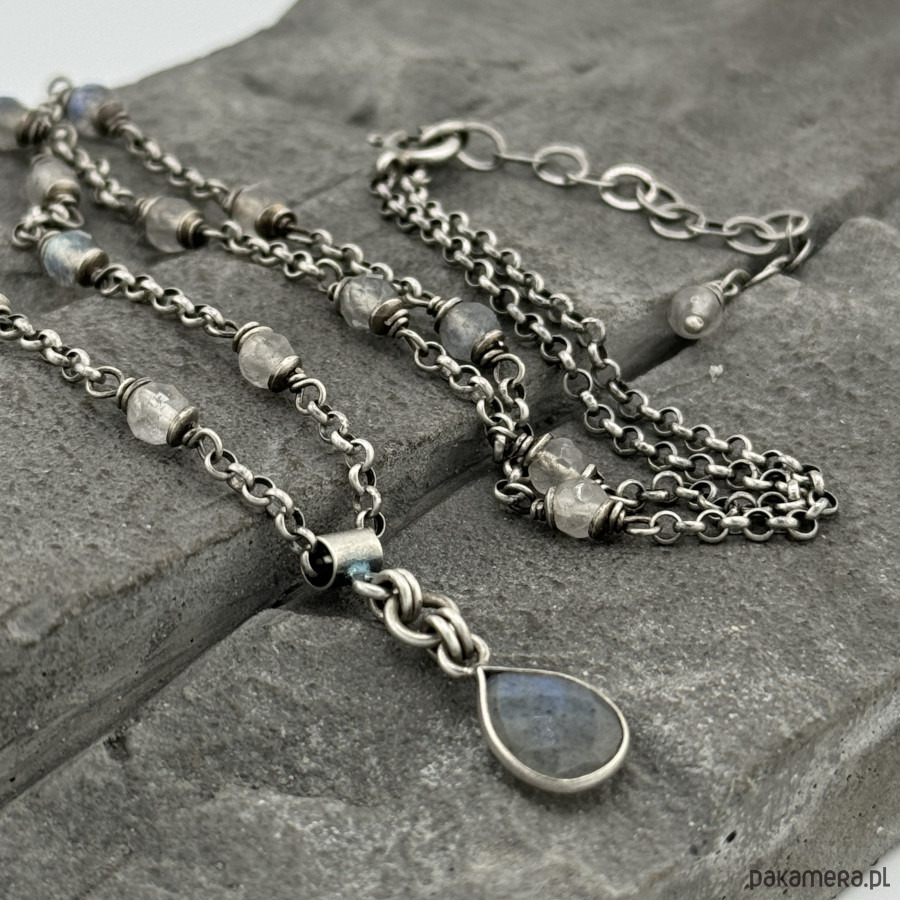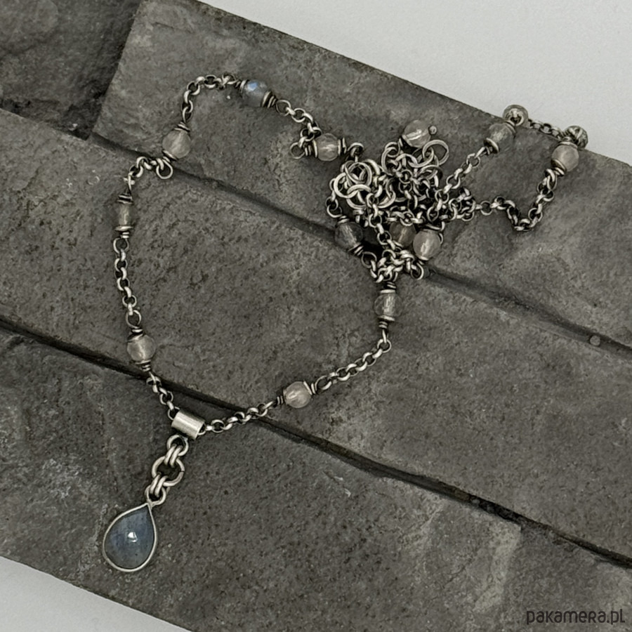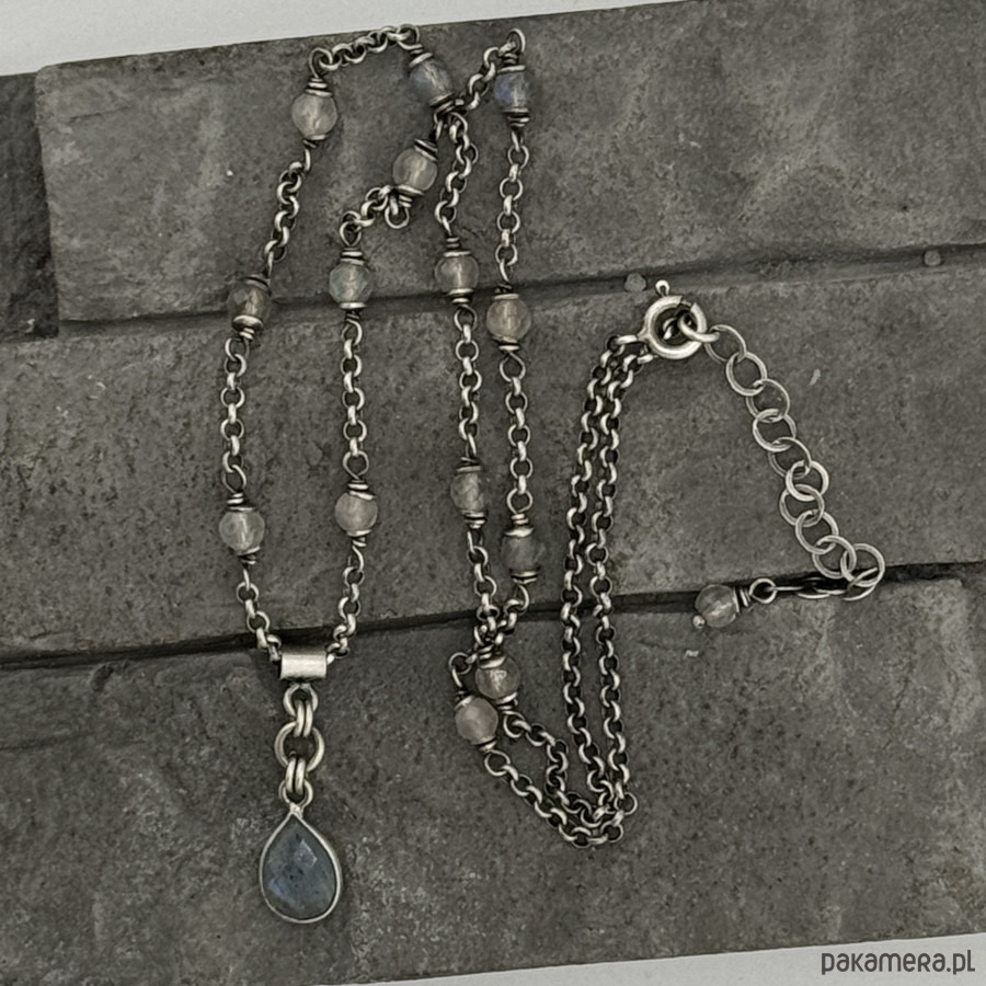 Romantyczny, subtelny, kobiecy naszyjnik na co dzień i nie tylko. Wykonany w całości z oksydowanego srebra próby 925 oraz fasetowanych kulek labradorytu i białego agatu wielkości 4 mm. Zawieszka w postaci łezki labradorytu okutej w srebro wielkości 10x8 mm. Obwód naszyjnika to 46 cm plus regulacja 5 cm. Ozdobnie zapakowany.