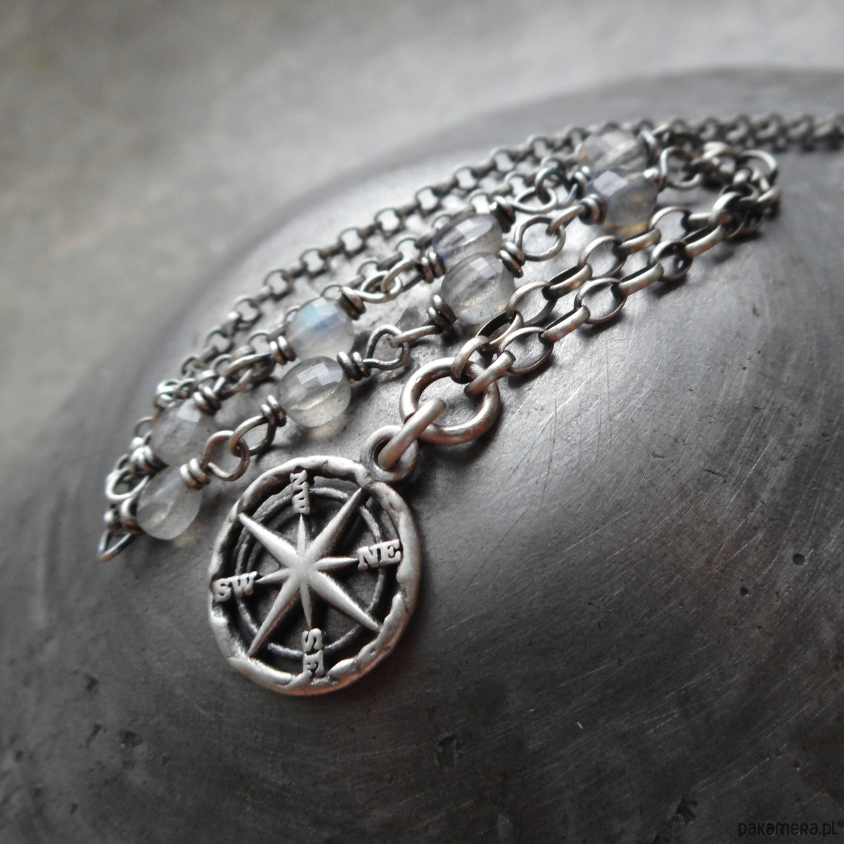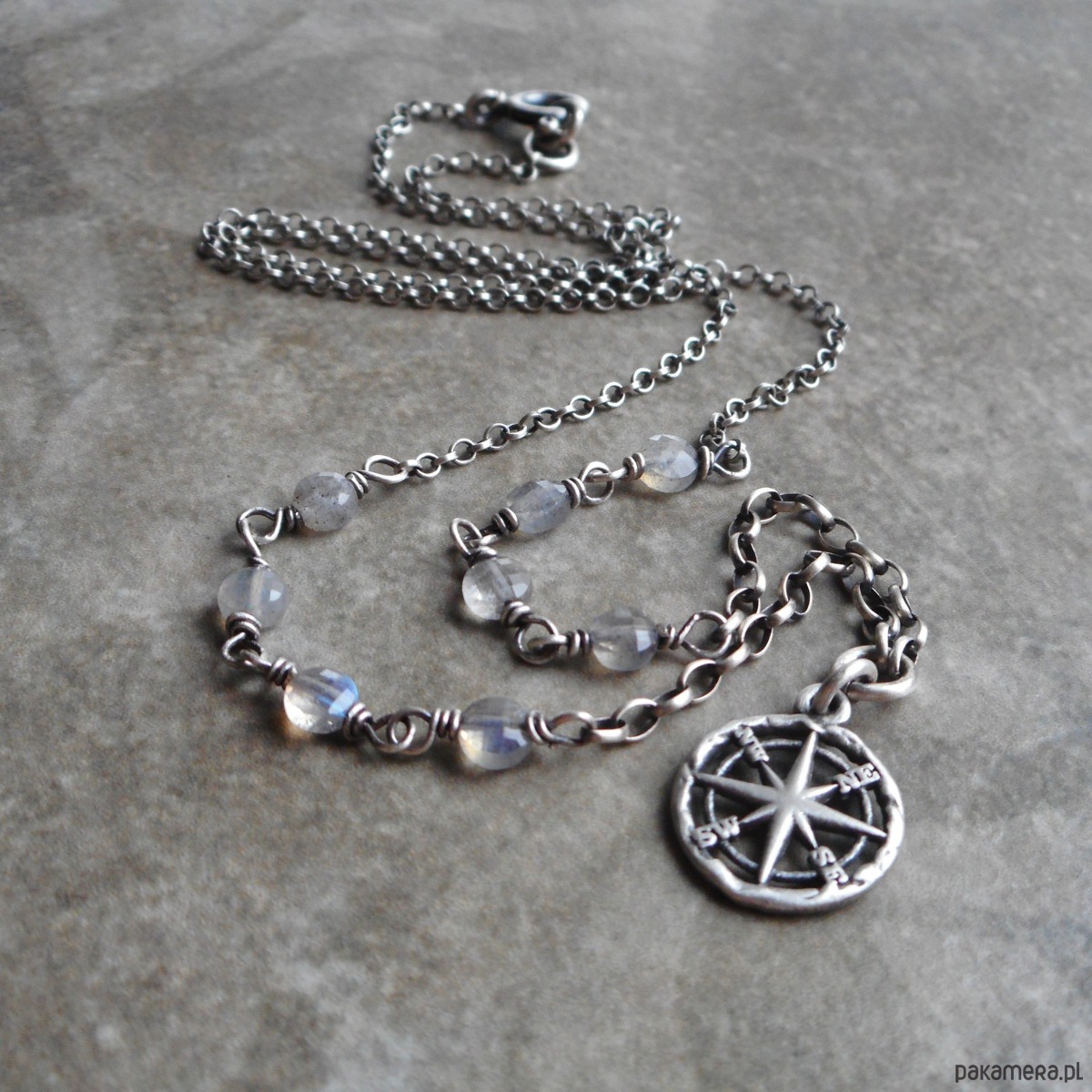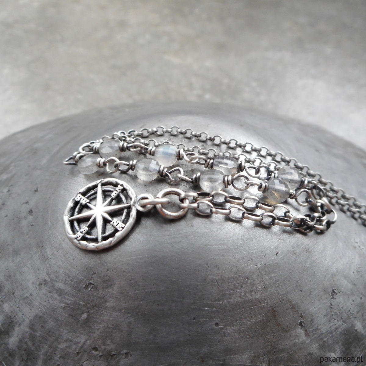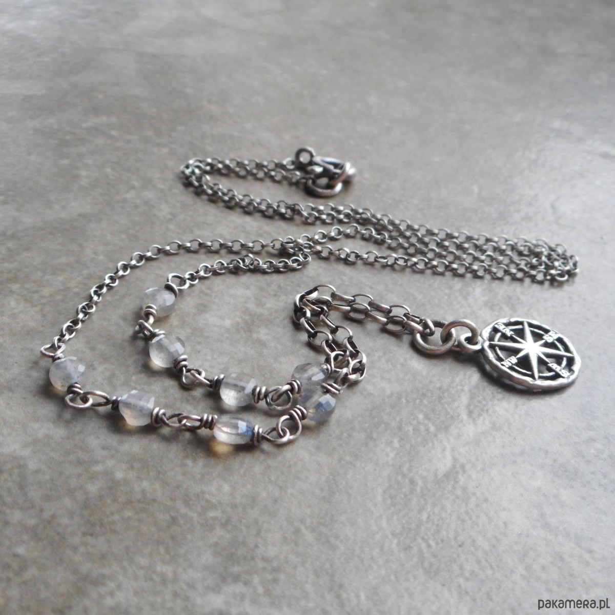 Naszyjnik z kamieni naturalnych i szlachetnego srebra; eleganckie, fasetowane labradoryty w towarzystwie zawieszki z motywem róży wiatrów (11 mm) nadają biżuterii niepowtarzalnego stylu.