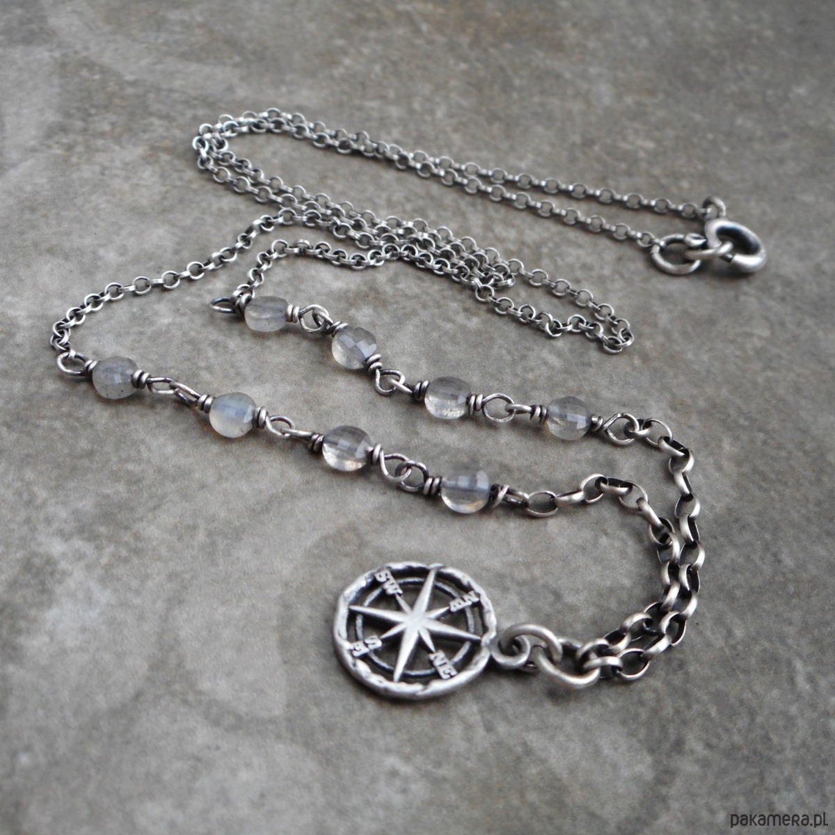 Naszyjnik z kamieni naturalnych i szlachetnego srebra; eleganckie, fasetowane labradoryty w towarzystwie zawieszki z motywem róży wiatrów (11 mm) nadają biżuterii niepowtarzalnego stylu.