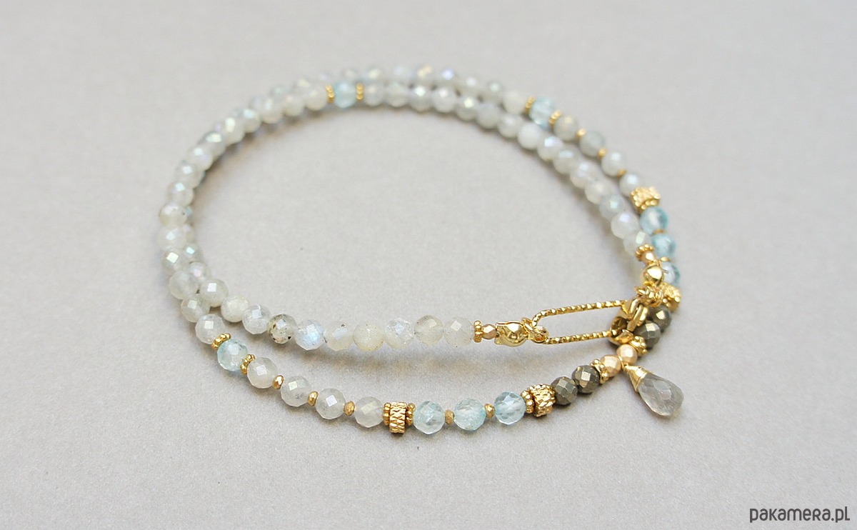 Krótki, delikatny naszyjnik wykonany w całości z pozłacanej stali szlachetnej oraz naturalnych, szlachetnych kamieni - labradorytów fasetowanych [4mm], topazów fasetowanych [4mm], pirytu fasetowanego [3,5mm], hematytu fasetowanego, platerowanego [3mm i 2mm], przekładek z hematytu [1mm] oraz brioletki labradorytu. Naszyjnik o długości ok. 44,5cm. Biżuteria ozdobnie zapakowana.