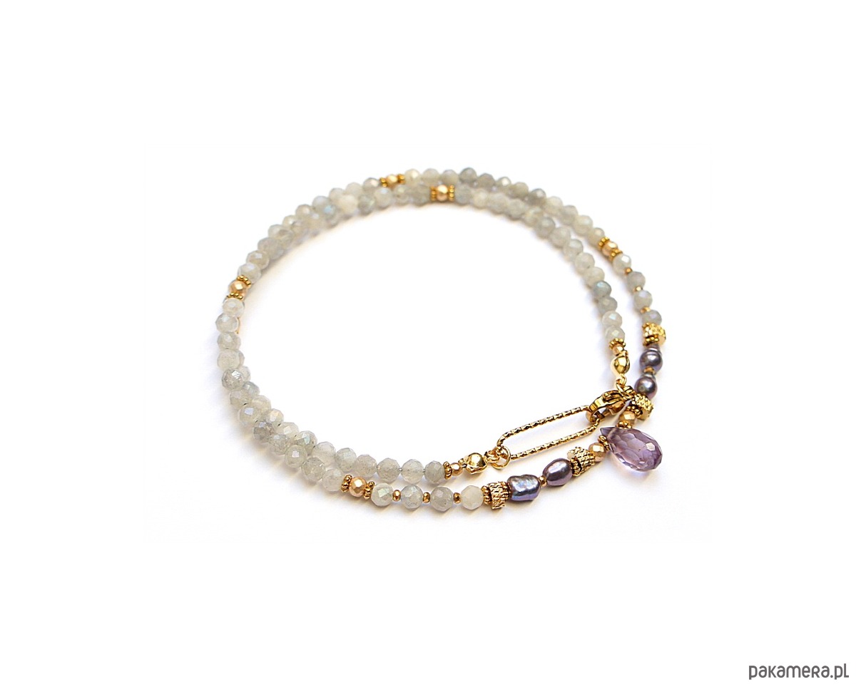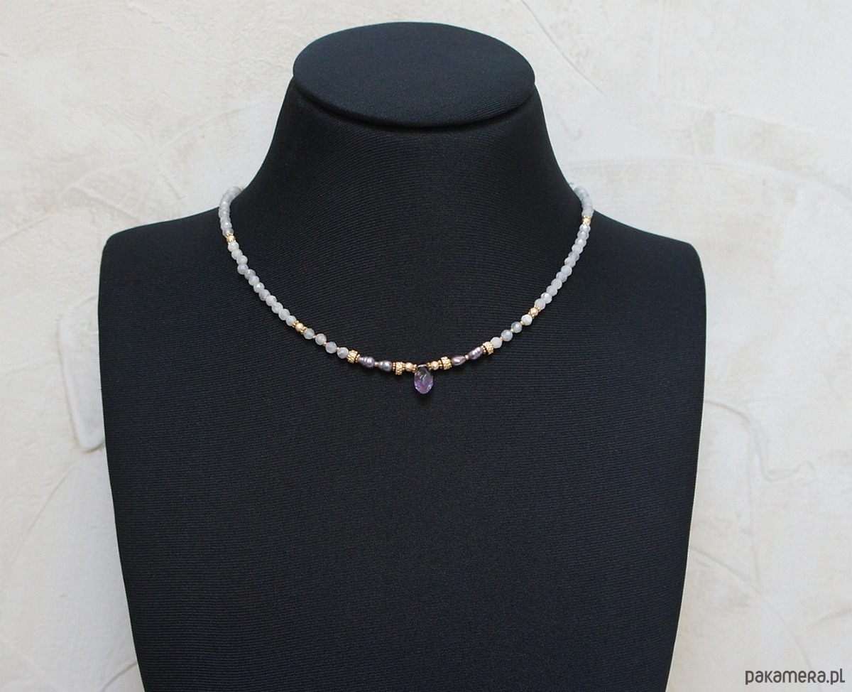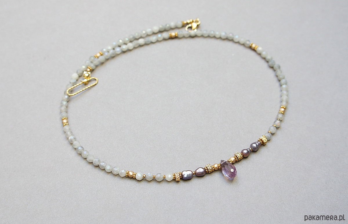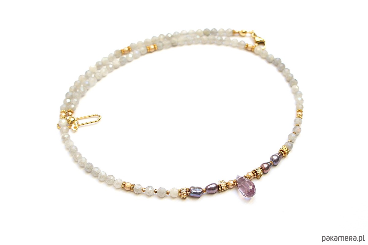 Krótki, delikatny naszyjnik wykonany w całości z pozłacanej stali szlachetnej oraz naturalnych, szlachetnych kamieni - labradorytów fasetowanych [4mm], pereł słodkowodnych w fioletowym kolorze [ok. 5-6mm], hematytu fasetowanego, platerowanego [3mm], przekładek z hematytu [1mm] oraz brioletki ametrynu. Naszyjnik o długości ok. 45cm. Biżuteria ozdobnie zapakowana.